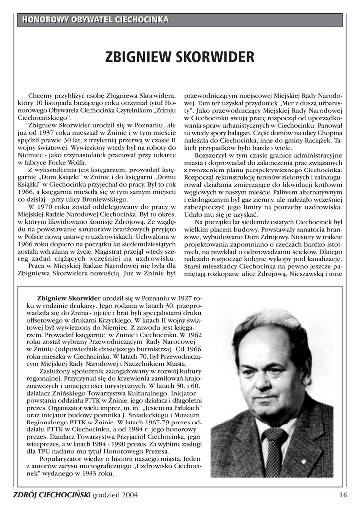 HONOROWY OBYWATEL CIECHOCINKA ZBIGNIEW SKORWIDER Chcemy przybli˝yç osob´ Zbigniewa Skorwidera, który 10 listopada bie˝àcego roku otrzyma∏ tytu∏ Honorowego Obywatela Ciechocinka Czytelnikom „Zdroju Ciechociƒskiego”. Zbigniew Skorwider urodzi∏ si´ w Poznaniu, ale ju˝ od 1937 roku mieszka∏ w ˚ninie i w tym mieÊcie sp´dzi∏ prawie 30 lat, z trzyletnià przerwà w czasie II wojny Êwiatowej. Wywieziony wtedy by∏ na roboty do Niemiec - jako trzynastolatek pracowa∏ przy tokarce w fabryce Focke Wolfa. Z wykszta∏cenia jest ksi´garzem, prowadzi∏ ksi´garni´ „Dom Ksià˝ki” w ˚ninie i do ksi´garni „Domu Ksià˝ki” w Ciechocinku przyjecha∏ do pracy. By∏ to rok 1966, a ksi´garnia mieÊci∏a si´ w tym samym miejscu co dzisiaj - przy ulicy Broniewskiego. W 1970 roku zosta∏ oddelegowany do pracy w Miejskiej Radzie Narodowej Ciechocinka. By∏ to okres, w którym likwidowano Komisj´ Zdrojowà. Ze wzgl´du na powstawanie sanatoriów bran˝owych przyj´to w Polsce nowà ustaw´ o uzdrowiskach. Uchwalona w 1966 roku dopiero na poczàtku lat siedemdziesiàtych zosta∏a wdra˝ana w ˝ycie. Magistrat przejà∏ wtedy szereg zadaƒ cià˝àcych wczeÊniej na uzdrowisku. Praca w Miejskiej Radzie Narodowej nie by∏a dla Zbigniewa Skorwidera nowoÊcià. Ju˝ w ˚ninie by∏ przewodniczàcym miejscowej Miejskiej Rady Narodowej. Tam te˝ uzyska∏ przydomek „Mer z duszà urbanisty”. Jako przewodniczàcy Miejskiej Rady Narodowej w Ciechocinku swojà prac´ rozpoczà∏ od uporzàdkowania spraw urbanistycznych w Ciechocinku. Panowa∏ tu wtedy spory ba∏agan. Cz´Êç domów na ulicy Chopina nale˝a∏a do Ciechocinka, inne do gminy Racià˝ek. Takich przypadków by∏o bardzo wiele. Rozszerzy∏ w tym czasie granice administracyjne miasta i doprowadzi∏ do zakoƒczenia prac zwiàzanych z tworzeniem planu perspektywicznego Ciechocinka. Rozpoczà∏ rekonstrukcj´ terenów zielonych i zainaugurowa∏ dzia∏ania zmierzajàce do likwidacji kot∏owni w´glowych w naszym mieÊcie. Paliwem alternatywnym i ekologicznym by∏ gaz ziemny, ale nale˝à∏o wczeÊniej zabezpieczyç jego limity na potrzeby uzdrowiska. Uda∏o mu si´ je uzyskaç. Na poczàtku lat siedemdziesiàtych Ciechocinek by∏ wielkim placem budowy. Powstawa∏y sanatoria bran˝owe, wybudowano Dom Zdrojowy. Niestety w trakcie projektowania zapomniano o rzeczach bardzo istotnych, na przyk∏ad o odprowadzaniu Êcieków. Dlatego nale˝a∏o rozpoczàç kolejne wykopy pod kanalizacj´. Starsi mieszkaƒcy Ciechocinka na pewno jeszcze pami´tajà rozkopane ulice Zdrojowà, Nieszawskà i inne Zbigniew Skorwider urodzi∏ si´ w Poznaniu w 1927 roku w rodzinie drukarzy. Jego rodzina w latach 30. przeprowadzi∏a si´ do ˚nina - ojciec i brat byli specjalistami druku offsetowego w drukarni Krzyckiego. W latach II wojny Êwiatowej by∏ wywieziony do Niemiec. Z zawodu jest ksi´garzem. Prowadzi∏ ksi´garnie: w ˚ninie i Ciechocinku. W 1962 roku zosta∏ wybrany Przewodniczàcym Rady Narodowej w ˚ninie (odpowiednik dzisiejszego burmistrza). Od 1966 roku mieszka w Ciechocinku. W latach 70. by∏ Przewodniczàcym Miejskiej Rady Narodowej i Naczelnikiem Miasta. Zas∏u˝ony spo∏ecznik zaanga˝owany w rozwój kultury regionalnej. Przyczynia∏ si´ do krzewienia zami∏owaƒ krajoznawczych i umiej´tnoÊci turystycznych. W latach 50. i 60. dzia∏acz ˚niƒskiego Towarzystwa Kulturalnego. Inicjator powstania oddzia∏u PTTK w ˚ninie, jego dzia∏acz i d∏ugoletni prezes. Organizator wielu imprez, m. in. „Jesieni na Pa∏ukach” oraz inicjator budowy pomnika J. Âniadeckiego i Muzeum Regionalnego PTTK w ˚ninie. W latach 1967-79 prezes oddzia∏u PTTK w Ciechocinku, a od 1984 r. jego honorowy prezes. Dzia∏acz Towarzystwa Przyjació∏ Ciechocinka, jego wiceprezes, a w latach 1984 - 1990 prezes. Za wybitne zas∏ugi dla TPC nadano mu tytu∏ Honorowego Prezesa. Popularyzator wiedzy o historii naszego miasta. Jeden z autorów zarysu monograficznego „Uzdrowisko Ciechocinek” wydanego w 1983 roku. ZDRÓJ CIECHOCI¡SKI grudzieƒ 2004 16 z przejÊciami na k∏adkach. Oczyszczalnia Êcieków wtedy nie powsta∏a, ale jak opowiada∏ Pan Zbigniew „By∏y to inne realia, Êrodki na inwestycje otrzymywaliÊmy z bud˝etu Paƒstwa i niestety zawsze wynajdywano pilniejsze potrzeby ni˝ oczyszczanie ciechociƒskich Êcieków. Ale powiem przewrotnie - dzisiaj jestem bardzo zadowolony, ˝e nie uda∏o si´ wybudowaç oczyszczalni 30 lat temu. Na pewno nie mielibyÊmy tak nowoczesnego, umo˝liwiajàcego oczyszczanie Êcieków solankowych obiektu jak ten oddany w ubieg∏ym roku.” Ale dzielnie radzi∏ sobie z innymi problemami. Przekona∏ obiekty sanatoryjne, aby nie odgradza∏y si´ od miasta wysokim murem czy p∏otem, rozszerza∏ tereny zielone Ciechocinka, przeprowadzi∏ do nowego obiektu Komisariat Milicji, przychodni´ zdrowia, wybudowano te˝ w tym okresie nowe przedszkole przy ulicy Wierzbowej, oddano szereg nowych ulic. Problemy stwarza∏a w tym czasie sama natura. Zaraza zniszczy∏a w mieÊcie ponad 3000 drzew wiàzów, musiano zastàpiç je nowymi drzewami. W rozmowie Pan Zbigniew wspomina „ Ju˝ wtedy rozpocz´liÊmy promowanie Ciechocinka. W miejsce zlikwidowanego przez organizatorów Festiwalu Orkiestr Symfonicznych utworzyliÊmy Festiwal Folkloru Kujaw i Ziemi Dobrzyƒskiej, który do dziÊ przyciàga mi∏oÊników ludowego folkloru. OrganizowaliÊmy wyst´py w muszli koncertowej w parku zdrojowym. Gra∏a tu orkiestra symfoniczna, ale te˝ zapraszaliÊmy latem studentów szkó∏ muzycznych, którzy uprzyjemniali pobyt kuracjuszom. Warto powiedzieç ˝e byli wÊród nich artyÊci, którzy potem zawojowali sceny ca∏ego Êwiata, na przyk∏ad Pan Kulka. WykorzystywaaliÊmy pobyty w Ciechocinku wysoko postawionych osobistoÊci dla rozwoju miasta. BywaliÊmy tak˝e wtedy na targach turystycznych. Dobrze pami´tam na przyk∏ad wyjazd do Rzeszowa. PrzygotowaliÊmy ofert´ kwater pryw