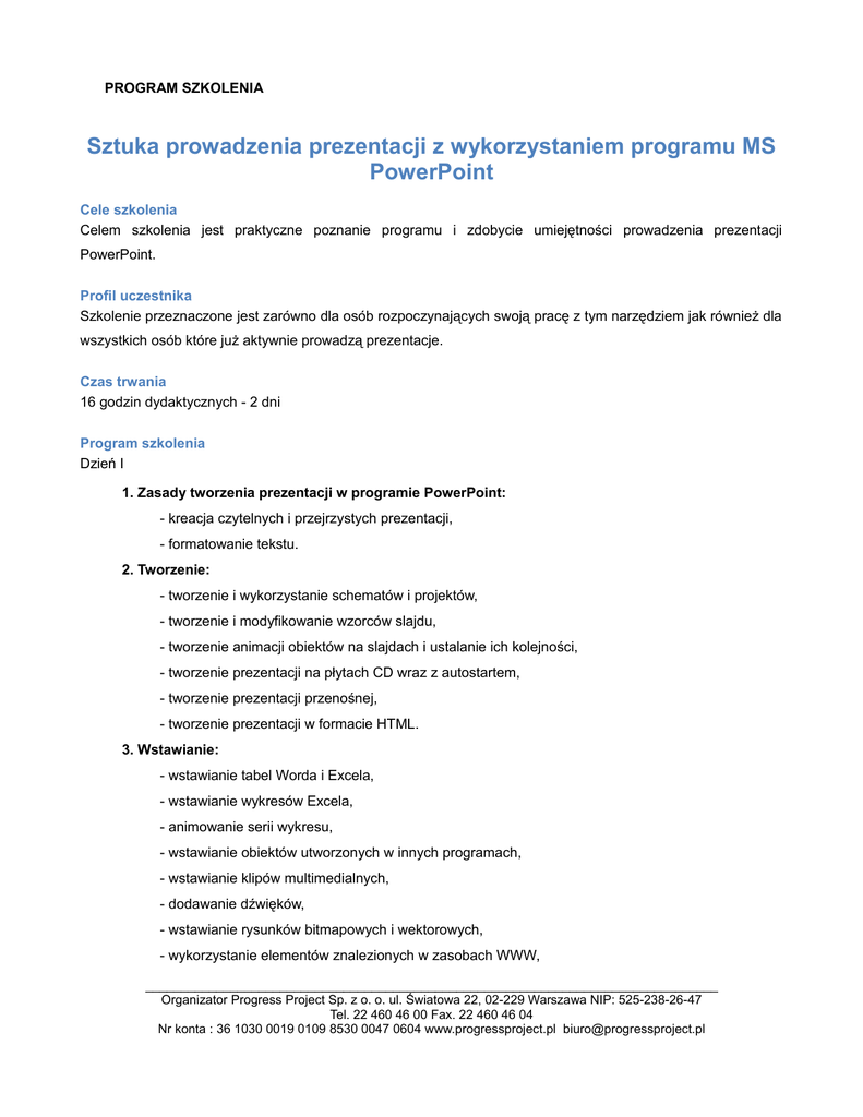 PROGRAM SZKOLENIA Sztuka prowadzenia prezentacji z wykorzystaniem programu MS PowerPoint Cele szkolenia Celem szkolenia jest praktyczne poznanie programu i zdobycie umiejętności prowadzenia prezentacji PowerPoint. Profil uczestnika Szkolenie przeznaczone jest zarówno dla osób rozpoczynających swoją pracę z tym narzędziem jak również dla wszystkich osób które już aktywnie prowadzą prezentacje. Czas trwania 16 godzin dydaktycznych - 2 dni Program szkolenia Dzień I 1. Zasady tworzenia prezentacji w programie PowerPoint: - kreacja czytelnych i przejrzystych prezentacji, - formatowanie tekstu. 2. Tworzenie: - tworzenie i wykorzystanie schematów i projektów, - tworzenie i modyfikowanie wzorców slajdu, - tworzenie animacji obiektów na slajdach i ustalanie ich kolejności, - tworzenie prezentacji na płytach CD wraz z autostartem, - tworzenie prezentacji przenośnej, - tworzenie prezentacji w formacie HTML. 3. Wstawianie: - wstawianie tabel Worda i Excela, - wstawianie wykresów Excela, - animowanie serii wykresu, - wstawianie obiektów utworzonych w innych programach, - wstawianie klipów multimedialnych, - dodawanie dźwięków, - wstawianie rysunków bitmapowych i wektorowych, - wykorzystanie elementów znalezionych w zasobach WWW, _________________________________________________________________________________ Organizator Progress Project Sp. z o. o. ul. Światowa 22, 02-229 Warszawa NIP: 525-238-26-47 Tel. 22 460 46 00 Fax. 22 460 46 04 Nr konta : 36 1030 0019 0109 8530 0047 0604 www.progressproject.pl [email protected] PROGRAM SZKOLENIA - osadzanie obiektów z innych programów z wykorzystaniem techniki OLE. 4. Wykorzystanie układów slajdów: - numerowanie, - dokumentowanie slajdów, - przyciski Akcji i ich wykorzystanie, - ustawianie przejść między slajdami, - niestandardowe przejścia między slajdami, - ustawianie tempa przechodzenia między slajdami i ewentualna pętla, - przygotowanie prezentacji do druku. 5. Zaawansowane możliwości MS PowerPoint: - niestandardowe metody tworzenia prezentacji, - zarządzanie slajdami za pomocą odpowiednich widoków, - zasady tworzenia hiperłączy do dokumentów pakietu Office, - zasady tworzenia hiperłączy do stron lub serwisów WWW. 6. Nagrywanie wcześniej przygotowanych prezentacji na kamery. Dzień II 1. Analiza scenek video z poprzedniego dnia. 2. Zasady prezentacji: - ustawienie sali, - poruszanie się po sali, - praca z pomocami audio-video, - komunikacja werbalna, - komunikacja niewerbalna, - przedstawianie danych statystycznych i liczbowych, - wizualizacja danych liczbowych, - notatki podczas prezentacji. 3. Radzenie sobie z grupą: - budowanie pierwszego wrażenia, - techniki perswazji i oddziaływania na grupę, - dostosowanie do grupy, - zjednywanie i radzenie sobie z problematycznymi słuchaczami, - zaangażowanie słuchaczy podczas prezentacji, - asertywna postawa, _________________________________________________________________________________ Organizator Progress Project Sp. z o. o. ul. Światowa 22, 02-229 Warszawa NIP: 525-238-26-47 Tel. 22 460 46 00 Fax. 22 460 46 04 Nr konta : 36 1030 0019 0109 8530 0047 0604 www.progressproject.pl [email protected] PROGRAM SZKOLENIA - dyscyplina czasowa. 4. Przygotowanie własnych prezentacji w oparciu o nowo zdobyte umiejętności (feedback). Harmonogram Harmonogram Rejestracja uczestników Zajęcia Przerwa Zajęcia Obiad Zajęcia Przerwa Zajęcia Dzień 1 9:45 - 10:00 10:00 - 11:00 11:00 - 11:15 11:15 - 13:00 13:00 - 13:45 13:45 - 15:00 15:00 - 15:10 15:10 - 17:00 Dzień 2 9:00 - 11:00 11:00 - 11:15 11:15 - 13:00 13:00 - 13:45 13:45 - 15:00 15:00 - 15:10 15:10 - 16:00 Koszt inwestycji W celu poznania szczegółów, zapraszamy do kontaktu. Informacje dodatkowe W przypadku zainteresowania jednym szkoleniem większej liczby osób (powyżej 3-4) z jednej firmy jesteśmy w stanie zorganizować dodatkowe terminy w dogodnej lokalizacji przy założeniu, że szkolenie będzie zaplanowane z co najmniej półtora miesięcznym wyprzedzeniem. Każdy temat możemy również przygotować według Państwa wymagań oraz potrzeb firmy w formie szkolenia dedykowanego, wyjazdu integracyjnego lub doradztwa. Zapraszamy do kontaktu, Progress Project sp. z o.o. ul. Światowa 22 02-229 Warszawa Tel. 22 460 46 00 Fax. 22 460 46 04 e-mail: [email protected] www.progressproject.pl _________________________________________________________________________________ Organizator Progress Project Sp. z o. o. ul. Światowa 22, 02-229 Warszawa NIP: 525-238-26-47 Tel. 22 460 46 00 Fax. 22 460 46 04 Nr konta : 36 1030 0019 0109 8530 0047 0604 www.progressproject.pl [email protected]