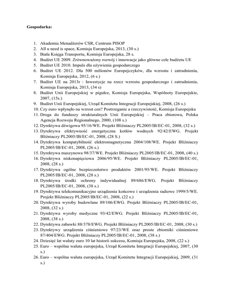 Gospodarka: Akademia Menadżerów CSR, Centrum PISOP All u need is space, Komisja Europejska, 2013, (30 s.) Biała Księga Transportu, Komisja Europejska, 28 s. Budżet UE 2009. Zrównoważony rozwój i innowacje jako główne cele budżetu UE Budżet UE 2010. Impuls dla ożywienia gospodarczego Budżet UE 2012. Dla 500 milionów Europejczyków, dla wzrostu i zatrudnienia, Komisja Europejska, 2012, (6 s.) 7. Budżet UE na 2013r : Inwestycje na rzecz wzrostu gospodarczego i zatrudnienia, Komisja Europejska, 2013, (34 s) 8. Budżet Unii Europejskiej w pigułce, Komisja Europejska, Wspólnoty Europejskie, 2007, (15s.) 9. Budżet Unii Europejskiej, Urząd Komitetu Integracji Europejskiej, 2008, (26 s.) 10. Czy euro wpłynęło na wzrost cen? Postrzeganie a rzeczywistość, Komisja Europejska 11. Droga do funduszy strukturalnych Unii Europejskiej – Praca zbiorowa, Polska Agencja Rozwoju Regionalnego, 2000, (108 s.) 12. Dyrektywa dźwigowa 95/16/WE. Projekt Bliźniaczy PL2005/IB/EC-01, 2008, (32 s.) 13. Dyrektywa efektywność energetyczna kotłów wodnych 92/42/EWG. Projekt Bliźniaczy PL2005/IB/EC-01, 2008, (28 S.) 14. Dyrektywa kompatybilność elektromagnetyczna 2004/108/WE. Projekt Bliźniaczy PL2005/IB/EC-01, 2008, (26 s.) 15. Dyrektywa maszynowa 98/37/WE. Projekt Bliźniaczy PL2005/IB/EC-01, 2008, (40 s.) 16. Dyrektywa niskonapięciowa 2006/95/WE. Projekt Bliźniaczy PL2005/IB/EC-01, 2008, (28 s.) 17. Dyrektywa ogólne bezpieczeństwo produktów 2001/95/WE. Projekt Bliźniaczy PL2005/IB/EC-01, 2008, (28 s.) 18. Dyrektywa środki ochrony indywidualnej 89/686/EWG. Projekt Bliźniaczy PL2005/IB/EC-01, 2008, (38 s.) 19. Dyrektywa telekomunikacyjne urządzenia końcowe i urządzenia radiowe 1999/5/WE. Projekt Bliźniaczy PL2005/IB/EC-01, 2008, (22 s.) 20. Dyrektywa wyroby budowlane 89/106/EWG. Projekt Bliźniaczy PL2005/IB/EC-01, 2008, (32 s.) 21. Dyrektywa wyroby medyczne 93/42/EWG. Projekt Bliźniaczy PL2005/IB/EC-01, 2008, (38 s.) 22. Dyrektywa zabawki 88/378/EWG. Projekt Bliźniaczy PL2005/IB/EC-01, 2008, (30 s.) 23. Dyrektywy urządzenia ciśnieniowe 97/23/WE oraz proste zbiorniki ciśnieniowe 87/404/EWG. Projekt Bliźniaczy PL2005/IB/EC-01, 2008, (38 s.) 24. Dziesięć lat waluty euro 10 lat historii sukcesu, Komisja Europejska, 2008, (22 s.) 25. Euro – wspólna waluta europejska, Urząd Komitetu Integracji Europejskiej, 2007, (30 s.) 26. Euro – wspólna waluta europejska, Urząd Komitetu Integracji Europejskiej, 2009, (31 s.) 1. 2. 3. 4. 5. 6. 27. Euro nasz pieniądz. Obejrzyj pod światło, dotknij, obejrzyj pod kątem, Europejski Bank Centralny 28. Euro: gotowość do działania . Przygotowanie firmy do korzystania z euro, Komisja Europejska, 2008, (29 s.) 29. Europejska polityka sąsiedztwa – biznes i handel w czasie dobrej koniunktury, Komisja Europejska, Dyrekcja Generalna ds. Stosunków Zewnętrznych 30. Europejska polityka sąsiedztwa – społeczeństwo obywatelskie i kultura. Potęga ludzkiego kapitału, Komisja Europejska, Dyrekcja Generalna ds. Stosunków Zewnętrznych 31. Europejska przestrzeń transportu morskiego bez barier, KE, 2010 32. Europejski Atlas Mórz, informacje w zasięgu kilku kliknięć myszką, Komisja Europejska Gospodarka Moska i Rybołówstwo 33. Europejski Instytut Innowacji i Technologii (EIT). Jakość na rzecz innowacji, Wspólnoty Europejskie, 2009, (16 s.) 34. Europejski Panel Przedsiębiorstw (broszura), Komisja Europejska 35. Europejski sektor wina w 2008r., Komisja Europejska. Dyrekcja Generalna ds. Rolnictwa i Rozwoju Obszarów Wiejskich (6 s.) 36. Europejskie pieniądze. Polityka regionalna i fundusze strukturalne Unii Europejskiej. Fundusze UE w latach 2007-2013, Przedstawicielstwo Komisji Europejskiej w Polsce, (15 s.) 37. Europejskie zamówienia publiczne, Ted – Tenders Electronic Daily (18 s.) 38. Fundusze Europejskie na wsparcie turystyki, Ministerstwo Rozwoju Regionalnego 39. Fundusze Unijne dla Rozwoju Organizacji Pozarządowych, Główny Punkt Informacyjny Funduszy Europejskich 40. HACCP, Urząd Komitetu Integracji Gospodarczej, 2005, (41 s.) 41. Informator o zabezpieczeniach banknotów euro, Europejski Bank Centralny, (23 s.) 42. Instrument Finansowy Progress. Portrety przedsiębiorców, Komisja Europejska, 2012, (broszurka). 43. Innowacje, Punkt Informacyjny Europe – Direct Poznań, 2009 44. Inwestowanie we wspólna przyszłość. Budżet Unii Europejskiej, Komisja Europejska, Wspólnoty Europejskie 2007, (22 s.) 45. Inwestujemy w przyszłość. Ramy finansowe Unii Europejskiej na lata 2007-2013, Komisja Europejska, 2008 46. Jak wdrożyć udany projekt PPP? Urząd Komitetu Integracji Gospodarczej, 2005, (39 s.) 47. Jakie korzyści euro przynosi nam wszystkim? Wspólny pieniądz – wiele możliwości, Komisja Europejska, Dyrekcja Generalna ds. Gospodarczych i Finansowych, Wspólnoty Europejskie, 2009 48. Jedna waluta dla jednej Europy. Droga do euro, Komisja Europejska, Wspólnoty Europejskie, 2008, (20 s.) 49. Jednoosobowa firma. Jak założyć i samodzielnie prowadzić jednoosobową działalność gospodarczą, D.Młodzikowska, B.Lunden, BL Info Polska, 2010 50. MŚP na co czekasz? Wykorzystaj swój potencjał badawczy!, KE, 2007, (13 s.) 51. Nasz region rozwija się z Europą. Biuletyn Informacyjny Wielkopolskiego Regionalnego Programu Operacyjnego na lata 2007-2013 nr 2/2009, Urząd Marszałkowski Województwa Wielkopolskiego, (15 s.) 52. Nowa fala. Światowe Dni Innowacji, Biuletyn Informacyjny Wielkopolskiego Regionalnego Programu Operacyjnego na lata 2007-2013 nr 4/2009, Urząd Marszałkowski Województwa Wielkopolskiego, (15 s.) 53. Nowe fundusze, lepsze zasady. Przegląd nowych zasad finansowych i możliwości finansowania na lata 2007-2013. Przewodnik dla początkujących, Komisja Europejska, Wspólnoty Europejskie, 2008, (22 s.) 54. Nowy system rachunkowości UE. Skuteczniejsze zarządzanie, większa przejrzystość. Przewodnik po nowym systemie sprawozdawczości finansowej UE, Komisja Europejska, (8 s.) 55. Ob