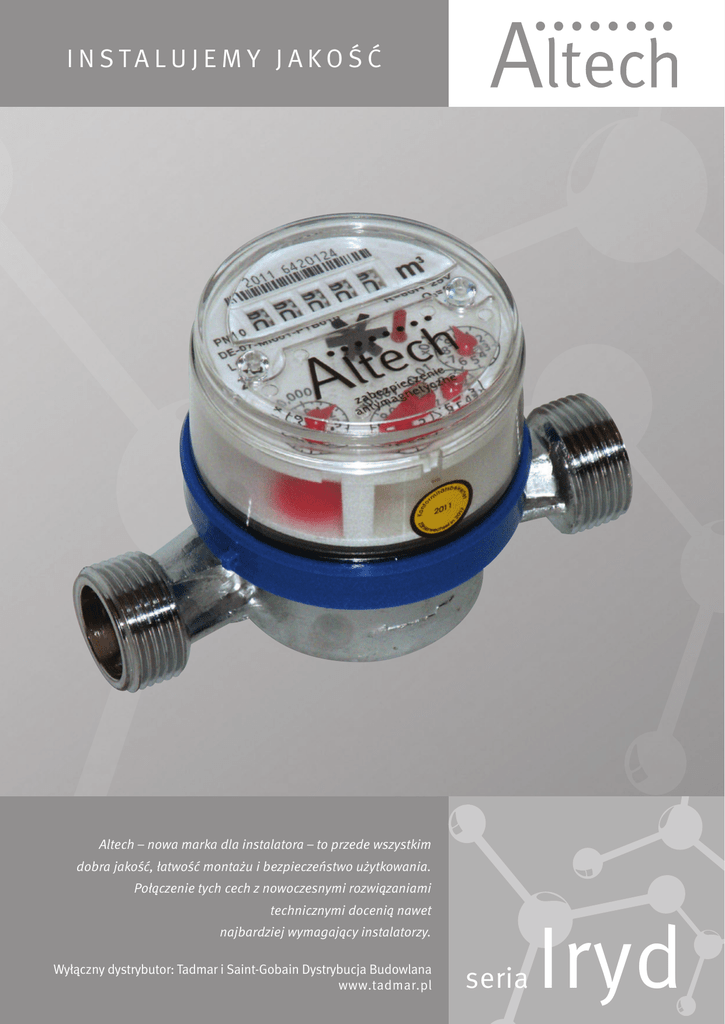 INSTALUJEMY JAKOŚĆ Altech – nowa marka dla instalatora – to przede wszystkim dobra jakość, łatwość montażu i bezpieczeństwo użytkowania. Połączenie tych cech z nowoczesnymi rozwiązaniami technicznymi docenią nawet najbardziej wymagający instalatorzy. Wyłączny dystrybutor: Tadmar i Saint-Gobain Dystrybucja Budowlana www.tadmar.pl seria Iryd WODOMIERZE IRYD B Zalety wodomierzy marki Altech: 2.O dczyt następuje bezpośrednio z tarczy wyposażonej w 8 rolek z cyframi. Pięć pierwszych (czarnych) dla metrów sześciennych i trzech (czerwonych) dla podwielokrotności. D1 D2 H1 1.Każdy wodomierz jest poddawany szczegółowej kontroli zarówno hydraulicznej jak i metrologicznej. L2 L1 3.O budowa wodomierza wykonana jest z mosiądzu. 4.Tarcza i mechanizm wodomierza umieszczony jest w próżniowo zamkniętej kapsule, która jest również pieczęcią wodomierza. Dzięki próżniowemu zamknięciu unikamy możliwości zaparowania górnej części kapsuły utrudniającej lub uniemożliwiającej prawidłowy odczyt. 5.Tarcza wodomierza wraz z kapsułą obraca się o 360 stopni, dzięki czemu odczyt z wodomierza jest ułatwiony w każdym położeniu urządzenia. ALTH-914313 Wodomierz DN=15 CW IRYD ciepła woda Q3=1,6 110 mm antymagnetyczny ALTH-914314 Wodomierz DN=20 CW IRYD ciepła woda Q3=2,5 130 mm antymagnetyczny ALTH-914311 Wodomierz DN=15 ZW IRYD zimna woda Q3=1,6 110 mm antymagnetyczny ALTH-914312 Wodomierz DN=20 ZW IRYD zimna woda Q3=2,5 130 mm antymagnetyczny DANE TECHNICZNE ALTH-914311 ALTH-914313 ALTH-914312 ALTH-914314 30° 30° Temperatura pracy: dla wody zimnej 90° 90° Ciągły strumień objętości dla wody ciepłej Q3 m 3/h 1,6 2,5 Średnica nominalna DN mm 15 20 Przepływ maksymalny m /h 3 Zakres pomiarowy Q 3/Q 1 Pośredni strumień objętości Minimalny strumień objętości 2 3,125 R80H/R25V R80H/R25V Q1 l 32 80 50 160 Qmin l/h 60 30 100 50 Zakres wskazań licznika m 99999,99995 99999,99995 Działka elementarna e l 0,05 0,05 Długość wodomierza L2 mm 110 130 Długość wodomierza z łącznikami L1 mm 189 227 Maksymalne ciśnienie robocze PN bar 10 10 ∆P kPa 63 63 Klasa spadku ciśnienia (przy Q3) h – zabudowa pozioma, V – zabudowa pionowa 3 SP R Z E DAWC A Wodomierze Altech są zgodne z Polską Normą i Zatwierdzone przez Główny Urząd Miar w Warszawie oraz zgodne z normami i przepisami międzynarodowymi 2 L ATA 5 L AT 10 L AT