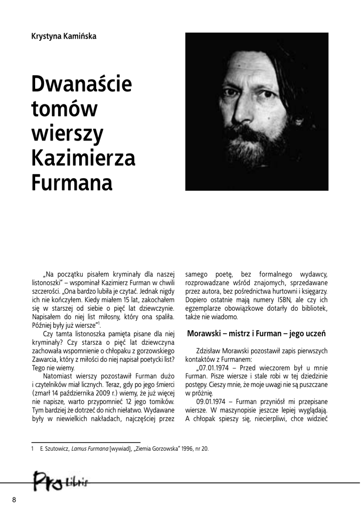 Krystyna Kamińska Dwanaście tomów wierszy Kazimierza Furmana „Na początku pisałem kryminały dla naszej listonoszki” – wspominał Kazimierz Furman w chwili szczerości. „Ona bardzo lubiła je czytać. Jednak nigdy ich nie kończyłem. Kiedy miałem 15 lat, zakochałem się w starszej od siebie o pięć lat dziewczynie. Napisałem do niej list miłosny, który ona spaliła. Później były już wiersze”1. Czy tamta listonoszka pamięta pisane dla niej kryminały? Czy starsza o pięć lat dziewczyna zachowała wspomnienie o chłopaku z gorzowskiego Zawarcia, który z miłości do niej napisał poetycki list? Tego nie wiemy. Natomiast wierszy pozostawił Furman dużo i czytelników miał licznych. Teraz, gdy po jego śmierci (zmarł 14 października 2009 r.) wiemy, że już więcej nie napisze, warto przypomnieć 12 jego tomików. Tym bardziej że dotrzeć do nich niełatwo. Wydawane były w niewielkich nakładach, najczęściej przez 1 8 samego poetę, bez formalnego wydawcy, rozprowadzane wśród znajomych, sprzedawane przez autora, bez pośrednictwa hurtowni i księgarzy. Dopiero ostatnie mają numery ISBN, ale czy ich egzemplarze obowiązkowe dotarły do bibliotek, także nie wiadomo. Morawski – mistrz i Furman – jego uczeń Zdzisław Morawski pozostawił zapis pierwszych kontaktów z Furmanem: „07.01.1974 – Przed wieczorem był u mnie Furman. Pisze wiersze i stale robi w tej dziedzinie postępy. Cieszy mnie, że moje uwagi nie są puszczane w próżnię. 09.01.1974 – Furman przyniósł mi przepisane wiersze. W maszynopisie jeszcze lepiej wyglądają. A chłopak spieszy się, niecierpliwi, chce widzieć E. Szutowicz, Lamus Furmana [wywiad], „Ziemia Gorzowska” 1996, nr 20. nazwisko w gazecie. Nie wie, ile razy będzie gasił swoją gorączkę o nieufny lub nieżyczliwy chłód otoczenia. Ale taka jest droga pisarza. Innej nie ma. 19.05.1974 – W »Nadodrzu« ukazał się debiut Furmana. Ładny liryk, jaki dałem Koniuszowi. Tylko zdaje mi się, że ten chłopak ostatnio trochę zgłupiał. Cóż, za mądrość zdolnych do wierszowania ludzi nie mogę brać odpowiedzialności”2. Wchodził więc Furman do poezji z błogosławieństwem gorzowskiego Księcia Poetów – Zdzisława Morawskiego. „To, co on mi dał, zostało. A były to naprawdę ważne rzeczy”3 – powiedział znacznie później. Podkreślił też w wierszu Rzecz o schodach dedykowanym Zdzisławowi Morawskiemu: Wschodziłem po tych schodach Przemierzałem je w poziom i w pion Deptałem ten beton Ażeby słowu miano słowa nadać By wyjąć je z młyna byle jakich znaczeń I tak je położyć aby się znaczyło4 Morawski nauczył go świadomości dobierania słów, dyscypliny literackiej wypowiedzi. Szybko jednak takie powinowactwo zaczęło Furmanowi ciążyć. Miał inną wrażliwość poetycką niż jego mistrz, musiał więc wyzwolić się spod tego wpływu. Natomiast Zdzisław Morawski swoje uznanie dla twórczości Kazimierza Furmana zachował do końca. W 1995 r. ukazał się jego szkic pt. Gorzów w czasach Furmana jako wstęp do tomu Furmana pt. Wiersze. Jest to jeden wielki pean dla talentu i postawy Kazimierza Furmana w mieście, które mu do pięt nie dorasta. „Uważam, że wiersze Furmana będą w pełni czytelne dopiero w roku 2002” – konkluduje Morawski5. Powrót do osłupienia Pierwszą książkę wydał Kazimierz Furman w 1976 r. Jej tytuł – Powrót do osłupienia. Wydawcą było Gorzowskie Towarzystwo Społeczno-Kulturalne, a wydrukowała Gorzowska Drukarnia Akcydensowa. Format A-6, stron 20, pomieszczono na nich tylko 12 wierszy. Na okładce rysunek Andrzeja Gordona. 2 3 4 5 W czasach cenzury i bardzo ograniczonego dostępu do papieru, taki debiut w nakładzie 300 egzemplarzy mógł uchodzić za sukces. Dziś zauważamy nieudolności typograficzne składu, a i wiersze tam zamieszczone zaskakują poddawaniem się autora ówcześnie obowiązującej konwencji. Żadnego z wierszy z tej książki Furman nie powtórzył. Kształcenie pamięci Drugą książkę Furmana pt. Kształcenie pamięci wydało Gorzowskie Towarzystwo Kultury w 1980 r. Stron też 20, ale wierszy już 15. Projekt okładki – Bolesław Kowalski. Wydaniu książki na pewno pomógł także Morawski, jako że był we władzach stowarzyszenia, jednak jako redaktor podpisał ją ceniony poeta warszawski Andrzej Tchórzowski. Związek to raczej inspirowany przez Morawskiego dla podniesienia prestiżu Furmana niż prawdziwy. Kilka tytułów wierszy z tego tomu zaskakuje deklaratywnością: Tacy jesteśmy, Do poetów list otwarty, Jesteś mi, Kraju, Do obywatela szarego. Ale obok: Kiedy wyzwolony z cienia, Bardzo prywatny monolog, Jest w nas coraz mniej czasu. Aktualna lektura tych wierszy rodzi pytanie: jak mogły stanąć obok siebie utwory tak odmienne zarówno tematycznie, jak i ze względu na zawartość literackiego obrazowania? Może to wynik jakichś ustępstw, np. politycznych, a może ciągle brak samoświadomości autora. Tomik Kształcenie pamięci był rekomendowany przez redaktora jako bliski Stachurze i Milczewskiemu-Bruno. Z takim odczytaniem zdecydowanie rozprawił się Andrzej K. Waśkiewicz stwierdzeniem: „Być może (podobieństwo) jest w postawie, w sposobie życia. W twórczości wszakże – nie”. I dalej ostro o niespójności światopoglądowej Furmana: „Autor jak gdyby nie może się zdecydować, kim właściwie jest: jednym z »obywateli szarych«, posiadającym ten sam co oni status, tyle że dysponującym wrażliwością, która pozwala głębiej i intensywniej doświadczać rzeczywistość, czy też tej rzeczywistości diagnostą (co wymaga przyjęcia innej perspektywy poznawczej), czy wreszcie poszukiwaczem »światów ukrytych«, pragnącym »choć raz zdarzyć się w wierszu«. [...] Z niepublikowanych pamiętników Zdzisława Morawskiego. Tekst udostępniła Maria Morawska. E. Szutowicz, j.w. K. Furman, Rzecz o schodach, [w:] tegoż, Wiersze, s. 37. Z. Morawski, Gorz