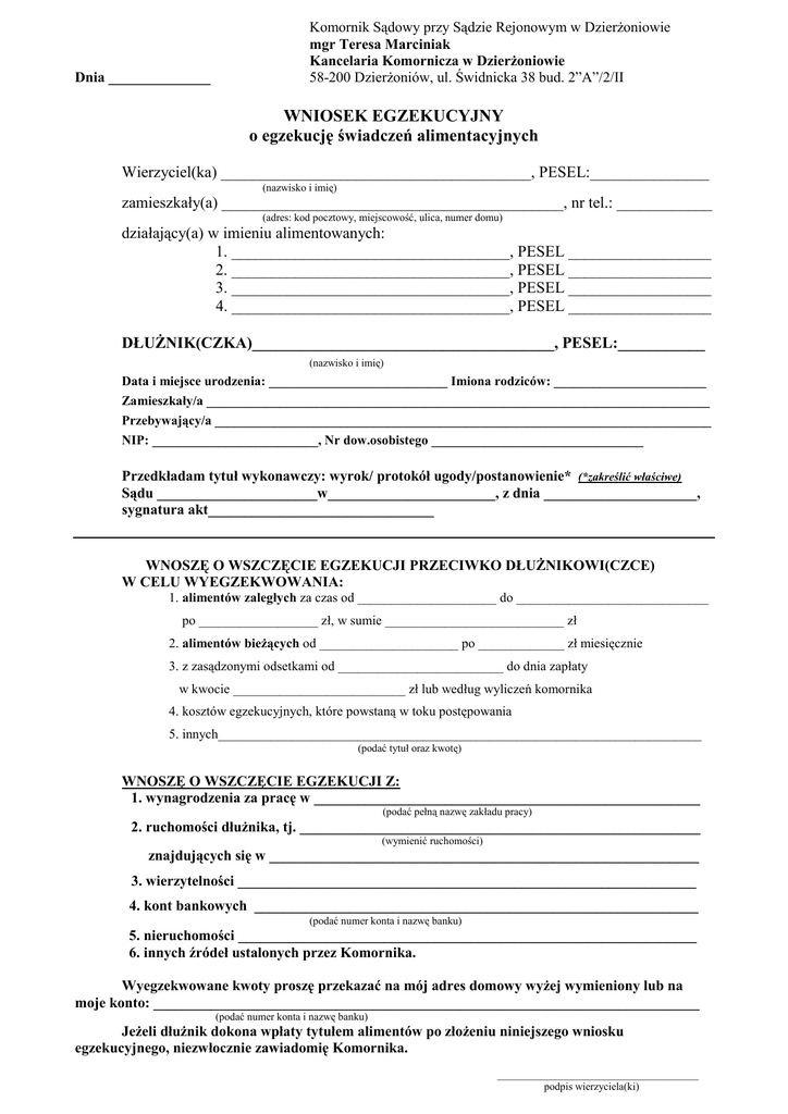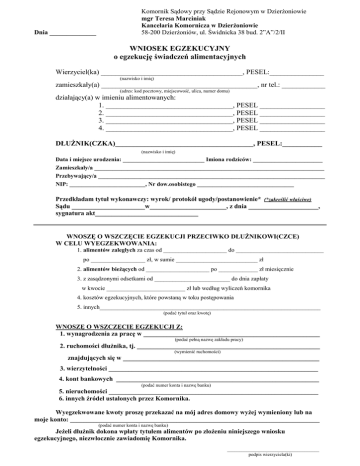 Dnia ______________ Komornik Sądowy przy Sądzie Rejonowym w DzierŜoniowie mgr Teresa Marciniak Kancelaria Komornicza w DzierŜoniowie 58-200 DzierŜoniów, ul. Świdnicka 38 bud. 2”A”/2/II WNIOSEK EGZEKUCYJNY o egzekucję świadczeń alimentacyjnych Wierzyciel(ka) _______________________________________, PESEL:_______________ (nazwisko i imię) zamieszkały(a) ___________________________________________, nr tel.: ____________ (adres: kod pocztowy, miejscowość, ulica, numer domu) działający(a) w imieniu alimentowanych: 1. ___________________________________, PESEL __________________ 2. ___________________________________, PESEL __________________ 3. ___________________________________, PESEL __________________ 4. ___________________________________, PESEL __________________ DŁUśNIK(CZKA)______________________________________, PESEL:___________ (nazwisko i imię) Data i miejsce urodzenia: ___________________________ Imiona rodziców: _______________________ Zamieszkały/a ____________________________________________________________________________ Przebywający/a ___________________________________________________________________________ NIP: _________________________, Nr dow.osobistego ________________________________ Przedkładam tytuł wykonawczy: wyrok/ protokół ugody/postanowienie* (*zakreślić właściwe) Sądu ______________________w_______________________, z dnia _____________________, sygnatura akt_______________________________ WNOSZĘ O WSZCZĘCIE EGZEKUCJI PRZECIWKO DŁUśNIKOWI(CZCE) W CELU WYEGZEKWOWANIA: 1. alimentów zaległych za czas od _____________________ do _____________________________ po __________________ zł, w sumie ___________________________ zł 2. alimentów bieŜących od _____________________ po _____________ zł miesięcznie 3. z zasądzonymi odsetkami od _________________________ do dnia zapłaty w kwocie __________________________ zł lub według wyliczeń komornika 4. kosztów egzekucyjnych, które powstaną w toku postępowania 5. innych_________________________________________________________________________ (podać tytuł oraz kwotę) WNOSZĘ O WSZCZĘCIE EGZEKUCJI Z: 1. wynagrodzenia za pracę w _____________________________________________________ (podać pełną nazwę zakładu pracy) 2. ruchomości dłuŜnika, tj. _______________________________________________________ (wymienić ruchomości) znajdujących się w ___________________________________________________________ 3. wierzytelności _______________________________________________________________ 4. kont bankowych _____________________________________________________________ (podać numer konta i nazwę banku) 5. nieruchomości _______________________________________________________________ 6. innych źródeł ustalonych przez Komornika. Wyegzekwowane kwoty proszę przekazać na mój adres domowy wyŜej wymieniony lub na moje konto: ___________________________________________________________________________ (podać numer konta i nazwę banku) JeŜeli dłuŜnik dokona wpłaty tytułem alimentów po złoŜeniu niniejszego wniosku egzekucyjnego, niezwłocznie zawiadomię Komornika. ______________________________________ podpis wierzyciela(ki)