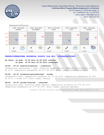 Instytut Meteorologii i Gospodarki Wodnej - Państwowy Instytut Badawczy Centralne Biuro Prognoz Meteorologicznych w Krakowie 30-215 Kraków ul. Piotra Borowego 14 tel: 12-6398150, fax: 12-4251973 email: [email protected] www: www.imgw.pl ŚREDNIOTERMINOWA PROGNOZA POGODY DLA WOJ. PODKARPACKIEGO Na okres: od godz. 19:30 dnia 04.06.2016 (sobota) do godz. 19:30 dnia 09.06.2016 (czwartek) 04/05 - 05.06 (sobota/niedziela - niedziela) Zachmurzenie umiarkowane i duże. Przelotne opady deszczu. Temperatura minimalna od 11°C do 13°C. Temperatura maksymalna od 22°C do 24°C. Wiatr słaby, północno-wschodni. 05/06 - 08.06 (niedziela/poniedziałek - środa) Zachmurzenie małe. Temperatura minimalna od 7°C do 10°C. Temperatura maksymalna od 20°C do 23°C, w środę 25°C. Wiatr słaby, zmienny. 08/09 - 09.06 (środa/czwartek - czwartek) Zachmurzenie duże. Przelotne opady deszczu. Temperatura minimalna od 13°C do 15°C. Temperatura maksymalna od 17°C do 19°C. Wiatr słaby, północno-zachodni. prognozę 13784/2016 opracował synoptyk dyżurny Piotr Ramza, dnia 2016-06-02 11:02
