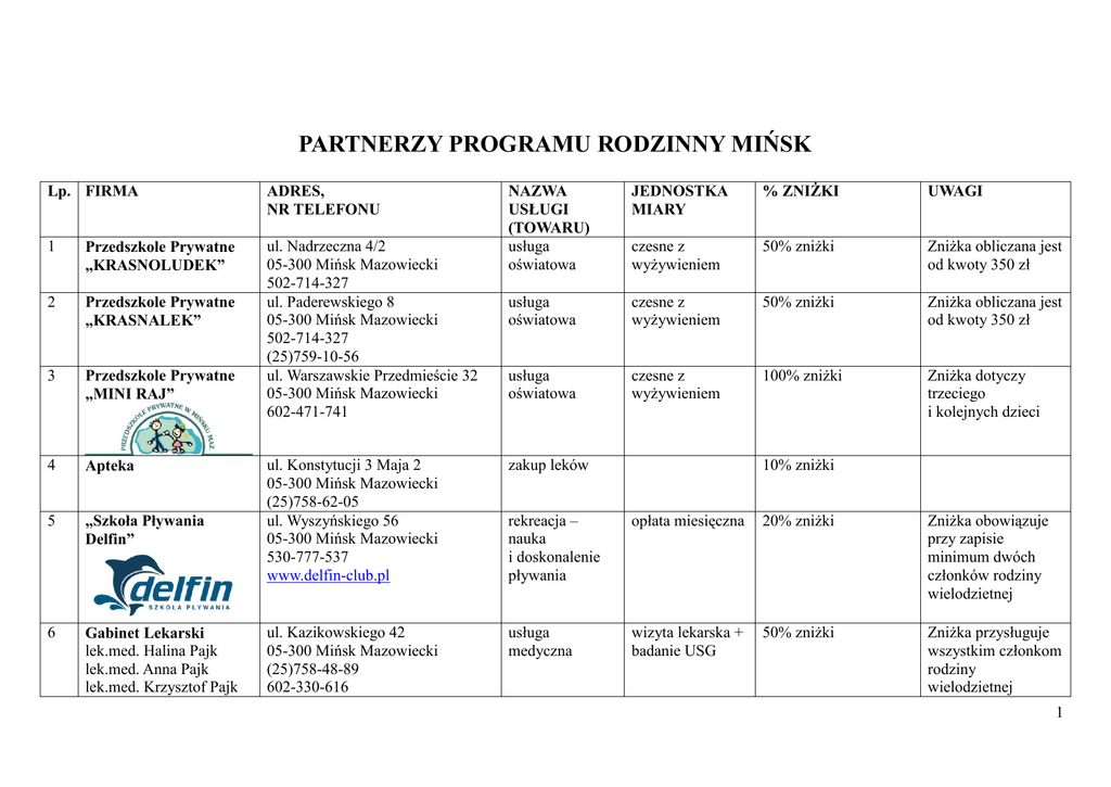 PARTNERZY PROGRAMU RODZINNY MIŃSK Lp. FIRMA ADRES, NR TELEFONU 1 Przedszkole Prywatne „KRASNOLUDEK” 2 Przedszkole Prywatne „KRASNALEK” 3 Przedszkole Prywatne „MINI RAJ” ul. Nadrzeczna 4/2 05-300 Mińsk Mazowiecki 502-714-327 ul. Paderewskiego 8 05-300 Mińsk Mazowiecki 502-714-327 (25)759-10-56 ul. Warszawskie Przedmieście 32 05-300 Mińsk Mazowiecki 602-471-741 4 Apteka 5 „Szkoła Pływania Delfin” 6 Gabinet Lekarski lek.med. Halina Pajk lek.med. Anna Pajk lek.med. Krzysztof Pajk NAZWA USŁUGI (TOWARU) usługa oświatowa JEDNOSTKA MIARY % ZNIŻKI UWAGI czesne z wyżywieniem 50% zniżki Zniżka obliczana jest od kwoty 350 zł usługa oświatowa czesne z wyżywieniem 50% zniżki Zniżka obliczana jest od kwoty 350 zł usługa oświatowa czesne z wyżywieniem 100% zniżki Zniżka dotyczy trzeciego i kolejnych dzieci ul. Konstytucji 3 Maja 2 05-300 Mińsk Mazowiecki (25)758-62-05 ul. Wyszyńskiego 56 05-300 Mińsk Mazowiecki 530-777-537 www.delfin-club.pl zakup leków 10% zniżki rekreacja – nauka i doskonalenie pływania opłata miesięczna 20% zniżki Zniżka obowiązuje przy zapisie minimum dwóch członków rodziny wielodzietnej ul. Kazikowskiego 42 05-300 Mińsk Mazowiecki (25)758-48-89 602-330-616 usługa medyczna wizyta lekarska + badanie USG 50% zniżki Zniżka przysługuje wszystkim członkom rodziny wielodzietnej 1 7 Euro – School Szkoła Języków Obcych ul. Piękna 7A 1.Kursy języka 05-300 Mińsk Mazowiecki angielskiego (25)759-69-69 www.euroschool.edu.pl www.facebook.com/euroschool.edu opłata miesięczna 1. 25%zniżki – pierwsza osoba 50% zniżki – druga osoba 75% zniżki - trzecia osoba 2.Pozostałe kursy opłata miesięczna czesne 2. 20% zniżki dla każdego członka rodziny wielodzietnej 25% zniżki czesne 25% zniżki - leczenie zachowawcze zębów mlecznych 10% zniżki - leczenie zachowawcze zębów stałych 50% zniżki - usuwanie zębów mlecznych 25% zniżki profilaktyka (lakowanie) 100% zniżki przeglądy uzębienia 50% zniżki 8 Przedszkole Prywatne Montessori „DELFINEK” ul. Świętokrzyska 23 05-300 Mińsk Mazowiecki 662-955-685 usługa oświatowa 9 Poradnia Stomatologiczna „STOMAX” lek. stom. Ewa Gusiew lek. stom. Małgorzata Kucharska ul. Cicha 2 lok. 1 05-300 Mińsk Mazowiecki 601-413-488 usługa stomatologiczna 10 Punkt Przedszkolny „PUCHATKOWO” ul. J. Łupińskiego 2A 05-300 Mińsk Mazowiecki (25)758-27-62 www.przedszkole-puchatkowo.pl usługa oświatowa Zniżka obliczana jest od kwoty 350 zł www.facebook.com/puchatkowo.przedszkole 2 11 Salon Fryzjersko – Kosmetyczny „FRYZULA” ul. Gen. Sosnkowskiego 12 05-300 Mińsk Mazowiecki 668-338-580 usługa fryzjerska 15% zniżki -strzyżenie dzieci 10% zniżki – strzyżenie męskie i damskie 12 Prywatna Praktyka Lekarska Gabinet Ginekologiczno – Położniczy Małgorzata Szpetnar ul. Cicha 15 05-300 Mińsk Mazowiecki 503-385-875 usługa medyczna 13 AKS „SAMIR” Sławomir Ambroszczyk ul. Warszawska 239 05-300 Mińsk Mazowiecki 602-364-212 www.samir.pl rekreacja – siłownia wizyta lekarska 20% zniżki 10% zniżki przy zakupie karnetu pełnego na 1 miesiąc 15% zniżki przy zakupie karnetu pełnego na 3 miesiące 20% zniżki przy zakupie wejścia jednorazowego (1,5h) 14 Przedszkole Niepubliczne „MICHAŁEK” ul. Dąbrówki 41A 05-300 Mińsk Mazowiecki 604-515-306 usługa oświatowa całodzienny pobyt 50% zniżki w przedszkolu wraz z wyżywieniem i zajęciami 100% zniżki dodatkowymi Zniżka obliczana jest od kwot: 130 zł - cena karnetu pełnego na 1 miesiąc, 390 zł - cena karnetu pełnego na 3 miesiące, 20 zł – cena wejścia jednorazowego (1,5h) Zniżka dotyczy pierwszego i drugiego dziecka Zniżka dotyczy trzeciego i kolejnych dzieci 3 15 Gabinet Stomatologiczny Stanisława Miłkowska ul. Florencja 8a 05-300 Mińsk Mazowiecki (25) 758-36-59 16 PERSS T. Zybała, E. Drabarek Sp. J. ul. Miodowa 4 05-300 Mińsk Mazowiecki (25)758-66-50 (25)758-88-34 602-487-496 17 Przedszkole Niepubliczne KLUB MALUCHA ul. Nadrzeczna 22 05-300 Mińsk Mazowiecki (25)759-32-57 510-077-550 www.klubmalucha.edu.pl 18 Sklep wielobranżowy FOR YOU B. Kowalik ul. Warszawska 90 05-300 Mińsk Mazowiecki 698-685-999 usługa stomatologiczna usługa opiekuńczodydaktycznowychowawcza 50% zniżki - leczenie zachowawcze zębów (plomba) 50% zniżki - leczenie zachowawcze zębów (kanałowe) 25% zniżki – ekstrakcja zęba 25% zniżki – badanie jamy ustnej i inne zabiegi 5% zniżki na cały asortyment (nie objęty innymi promocjami) 15% zniżki na usługę szycia czesne 20% zniżki obuwie dla dzieci do rozmiaru 35 10% zniżki obuwie damskie i ubiory 5 % zniżki obuwie męskie 5 % zniżki torby i dodatki 5 % zniżki 4 19 20 KULTURALNY BAR KEBAB W. Wesołowski MAZOWIANKA BAR & RESTAURACJA M. Kostusiewicz 21 OFFICE 1 ARTYKUŁY BIUROWE I SZKOLNE 22 LA BELLA ul. Kościuszki 2 lok. B 05-300 Mińsk Mazowiecki 516-929-930 usługa gastronomiczna zestaw obiadowy 10% zniżki zupa 10% zniżki Kebab „L” 5 % zniżki ul. Piłsudskiego 32 05-300 Mińsk Mazowiecki (25)758-26-16 793-323-222 www.facebook.com/Mazowianka usługa gastronomiczna dania z karty porcja 20% zniżki ul. Warszawska 163 05-300 Mińsk Mazowiecki (25)758-19-21 zakup artykułów papierniczych artykuły papiernicze 10% zniżki ul. Piłsudskiego 21 05-300 Mińsk Mazowiecki (25)749-29-09 usługa gastronomiczna dania z karty 20% zniżki Zniżka dotyczy dań spożywanych w lokalu o łącznej wartości powyżej 30 zł 5 23 24 25 KLUB WALKI GRAPPLER BARTEK SPÓŁKA AKCYJNA KWIAT LOTOSU STUDIO PIĘKNEJ SYLWETKI ul. Piłsudskiego 11A 05-300 Mińsk Mazowiecki 692-238-240 793-298-095 www.klub-grappler.pl rekreacja ul. Warszawska 63A Stojadła 05-300 Mińsk Mazowiecki 506-397-953 ul. Kościuszki 25 lok. 16 (II piętro) 05-300 Mińsk Mazowiecki 696-052-122 (25)-756-10-21 fitness (karnet miesięczny) 25% zniżki sztuki walki (karnet miesięczny) 25% zniżki zajęcia sportowe dla dzieci (karnet miesięczny) buty dziecięce BARTEK 25% zniżki 10% zniżki przy