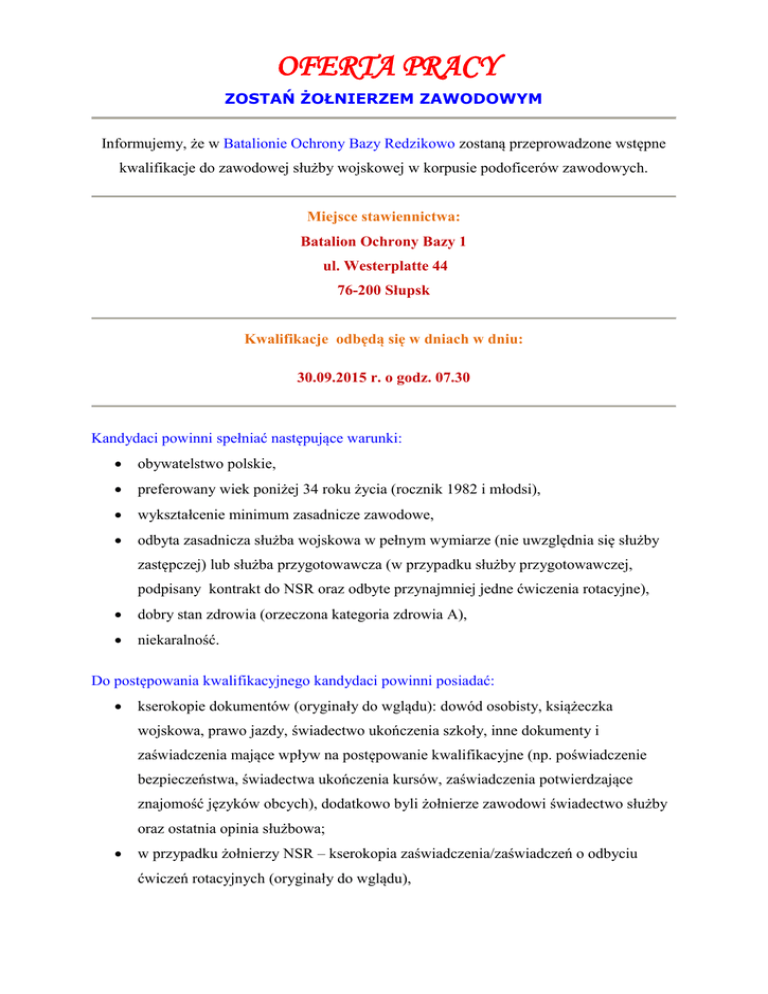 OFERTA PRACY ZOSTAŃ ŻOŁNIERZEM ZAWODOWYM Informujemy, że w Batalionie Ochrony Bazy Redzikowo zostaną przeprowadzone wstępne kwalifikacje do zawodowej służby wojskowej w korpusie podoficerów zawodowych. Miejsce stawiennictwa: Batalion Ochrony Bazy 1 ul. Westerplatte 44 76-200 Słupsk Kwalifikacje odbędą się w dniach w dniu: 30.09.2015 r. o godz. 07.30 Kandydaci powinni spełniać następujące warunki: obywatelstwo polskie, preferowany wiek poniżej 34 roku życia (rocznik 1982 i młodsi), wykształcenie minimum zasadnicze zawodowe, odbyta zasadnicza służba wojskowa w pełnym wymiarze (nie uwzględnia się służby zastępczej) lub służba przygotowawcza (w przypadku służby przygotowawczej, podpisany kontrakt do NSR oraz odbyte przynajmniej jedne ćwiczenia rotacyjne), dobry stan zdrowia (orzeczona kategoria zdrowia A), niekaralność. Do postępowania kwalifikacyjnego kandydaci powinni posiadać: kserokopie dokumentów (oryginały do wglądu): dowód osobisty, książeczka wojskowa, prawo jazdy, świadectwo ukończenia szkoły, inne dokumenty i zaświadczenia mające wpływ na postępowanie kwalifikacyjne (np. poświadczenie bezpieczeństwa, świadectwa ukończenia kursów, zaświadczenia potwierdzające znajomość języków obcych), dodatkowo byli żołnierze zawodowi świadectwo służby oraz ostatnia opinia służbowa; w przypadku żołnierzy NSR – kserokopia zaświadczenia/zaświadczeń o odbyciu ćwiczeń rotacyjnych (oryginały do wglądu), osoby posiadające stopień policyjny, Straży Granicznej, Biura Ochrony Rządu, Państwowej Straży Pożarnej, Służby Więziennej, Agencji Bezpieczeństwa Wewnętrznego, Agencji Wywiadu, Służby Wywiadu Wojskowego, Służby Kontrwywiadu Wojskowego lub Urzędu Ochrony Państwa zobowiązane są do przedstawienia okresów służby w tych formacjach, aktualne zaświadczenie lekarskie o braku przeciwwskazań zdrowotnych do zdawania egzaminu z wychowania fizycznego, strój sportowy, obuwie sportowe. Uwaga: przed udaniem się na kwalifikacje należy upewnić się telefonicznie o celowości wyjazdu: w WKU w Garwolinie w pokoju nr 9 pod tel. (25) 682 23 15 w. 9259 lub 261 518 959, w Batalionie Ochrony Bazy Redzikowo pod tel. 261 458 654 lub 261 458 654 WYKAZ WAKUJĄCYCH STANOWISK SEKCJA KOMUNIKACJI SPOŁECZNEJ PODOFICER SZTABOWY STE: PDF SW: 52B21/99Z99, POUFNE PREFEROWANE UMIEJĘTNOŚCI: organizowania pracy sztabowej, oceny sytuacji oraz podejmowania decyzji, łatwego szybkiego precyzowania myśli w formie ustnej i pisemnej, znajomość obsługi niezbędnego oprogramowania komputerowego. SEKCJA PERSONALNA (S-1)- SZTAB PODOFICER SZTABOWY STE: PDF SW: 54B21/99Z99, POUFNE PREFEROWANE UMIEJĘTNOŚCI: organizowania pracy sztabowej, oceny sytuacji oraz podejmowania decyzji, łatwego i szybkiego precyzowania myśli w formie ustnej i pisemnej, znajomość obsługi niezbędnego oprogramowania komputerowego. PREFEROWANE DOŚWIADCZENIE ZAWODOWE: zajmowanie stanowiska w obszarze działalności mobilizacyjno-uzupełnieniowej lub personalnej. PODOFICER SZTABOWY STE: PDF SW: 54C22/99Z99, POUFNE PREFEROWANE UMIEJĘTNOŚCI: organizowania pracy sztabowej, oceny sytuacji oraz podejmowania decyzji łatwego i szybkiego precyzowania myśli w formie ustnej pisemnej znajomość obsługi niezbędnego oprogramowania komputerowego. PREFEROWANE DOŚWIADCZENIE ZAWODOWE zajmowanie stanowiska w obszarze działalności personalnej. SEKCJA OPERACYJNA (S-3) - SZTAB ADMINISTRATOR SYSTEMÓW STE: POF SW: 28D33, POUFNE PREFEROWANE DOŚWIADCZENIE ZAWODOWE: zajmowanie stanowiska w korpusie osobowym łączności i informatyki, administrowanie sieciami informatycznymi. PREFEROWANE UMIEJĘTNOŚCI: organizowania pracy sztabowej, oceny sytuacji oraz podejmowania decyzji łatwego i szybkiego precyzowania myśli w formie ustnej i pisemnej, znajomość obsługi niezbędnego oprogramowania komputerowego. SEKCJA LOGISTYKI (S-4) - SZTAB PODOFICER SZTABOWY STE: PDF, SW: 38A21/99Z99, POUFNE PREFEROWANE DOŚWIADCZENIE ZAWODOWE: zajmowanie stanowiska w korpusie osobowym logistyki, zajmowanie stanowiska w obszarze służb materiałowych (związanych ze środkami bojowymi). PREFEROWANE UMIEJĘTNOŚCI: organizowania pracy sztabowej, oceny sytuacji oraz podejmowania decyzji, łatwego szybkiego precyzowania myśli w formie ustnej i pisemnej, znajomość obsługi niezbędnego oprogramowania komputerowego. ZESPÓŁ. WSPARCIA DOWODZENIA I ŁĄCZNOŚCI - SZTAB ADMINISTRATOR SIECI INFORMATYCZNYCH STE; PDF SW: 28D33, POUFNE PREFEROWANE DOŚWIADCZENIE ZAWODOWE: zajmowanie stanowiska w korpusie osobowym łączności i informatyki, administrowanie sieciami informatycznymi. PREFEROWANE UMIEJĘTNOŚCI: organizowania pracy sztabowej, oceny sytuacji oraz podejmowania decyzji, łatwego i szybkiego precyzowania myśli w formie ustnej i pisemnej, znajomość obsługi niezbędnego oprogramowania komputerowego. KOMPANIA OCHRONY - PLUTON OCHRONY 2 X POMOCNIK DOWÓDCY PLUTONU - DOWÓDCA DRUŻYNY STE; PDF, SW: 20B21, POUFNE PREFEROWANE DOŚWIADCZENIE ZAWODOWE: zajmowanie stanowisk w obszarze działalności dowódczej, zajmowanie stanowiska w obszarze ochrony obiektów. PREFEROWANE UMIEJĘTNOŚCI: organizowania, koordynowania i kierowania pracą zespołową, oceny sytuacji oraz podejmowania decyzji, łatwego szybkiego precyzowania myśli w formie ustnej i pisemnej, znajomość obsługi niezbędnego oprogramowania komputerowego. KOMPANIA OCHRONY - BIURO PRZEPUSTEK KIEROWNIK BIURA PRZEPUSTEK STE: PDF SW: 20B21/99Z99, POUFNE PREFEROWANE DOŚWIADCZENIE ZAWODOWE: zajmowanie stanowiska w obszarze działalności dowódczej lub sztabowej. PREFEROWANE UMIEJĘTNOŚCI: organizowania, koordynowania i kierowania pracą zespołową, oceny sytuacji oraz podejmowania decyzji, łatwego i szybkiego precyzowania myśli w formie ustnej i pisemnej, znajomość obsługi niezbędnego oprogramowania komputerowego. ZASTĘPCA KIEROWNIKA BIURA PRZEPUSTEK STE: PDF SW: 20B21/99Z99, POUFNE PREFEROWANE DOŚWIADCZENIE ZAWODOWE: zajmowanie st