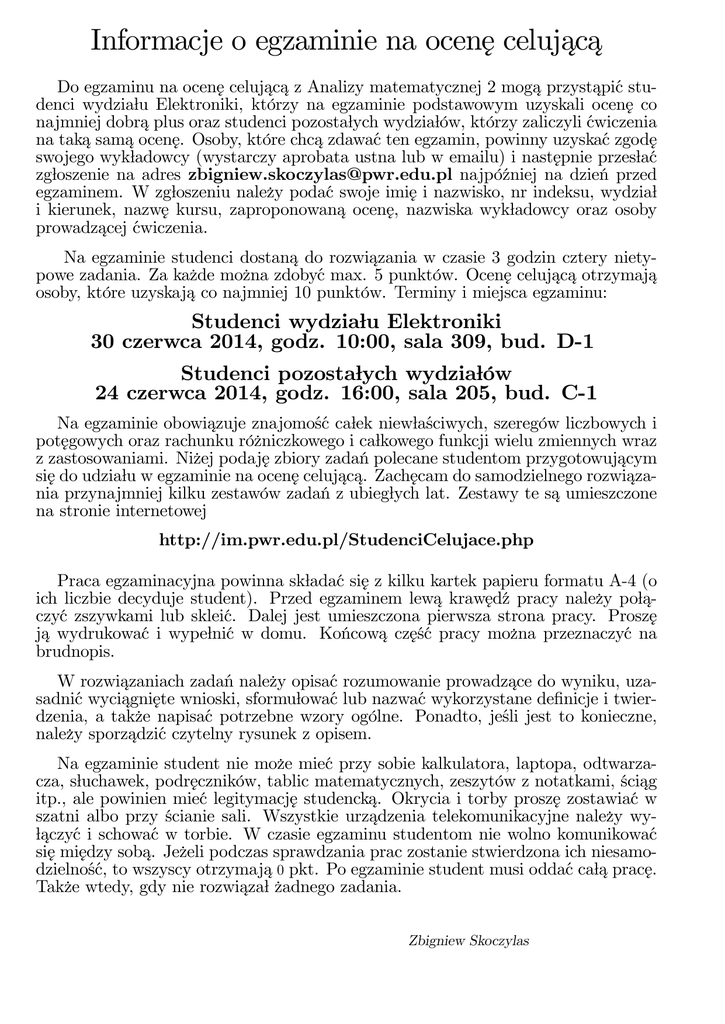 Informacje o egzaminie na ocen¾ e celujac ¾ a¾ Do egzaminu na ocene¾ celujac ¾ a¾ z Analizy matematycznej 2 moga¾ przystapić ¾ studenci wydzia÷ u Elektroniki, którzy na egzaminie podstawowym uzyskali ocene¾ co najmniej dobra¾plus oraz studenci pozosta÷ ych wydzia÷ ów, którzy zaliczyli ćwiczenia na taka¾sama¾ ocene. ¾ Osoby, które chca¾ zdawać ten egzamin, powinny uzyskać zgode¾ swojego wyk÷ adowcy (wystarczy aprobata ustna lub w emailu) i nastepnie ¾ przes÷ ać zg÷ oszenie na adres [email protected] najpóźniej na dzień przed egzaminem. W zg÷ oszeniu nalez·y podać swoje imie¾ i nazwisko, nr indeksu, wydzia÷ i kierunek, nazw¾ e kursu, zaproponowana¾ ocene, ¾ nazwiska wyk÷ adowcy oraz osoby prowadzacej ¾ ćwiczenia. Na egzaminie studenci dostana¾ do rozwiazania ¾ w czasie 3 godzin cztery nietypowe zadania. Za kaz·de moz·na zdobyć max. 5 punktów. Ocene¾ celujac ¾ a¾ otrzymaja¾ osoby, które uzyskaja¾ co najmniej 10 punktów. Terminy i miejsca egzaminu: Studenci wydzia÷ u Elektroniki 30 czerwca 2014, godz. 10:00, sala 309, bud. D-1 Studenci pozosta÷ ych wydzia÷ ów 24 czerwca 2014, godz. 16:00, sala 205, bud. C-1 Na egzaminie obowiazuje ¾ znajomość ca÷ ek niew÷ aściwych, szeregów liczbowych i potegowych ¾ oraz rachunku róz·niczkowego i ca÷ kowego funkcji wielu zmiennych wraz z zastosowaniami. Niz·ej podaje¾ zbiory zadań polecane studentom przygotowujacym ¾ sie¾ do udzia÷ u w egzaminie na ocene¾ celujac ¾ a. ¾ Zachecam ¾ do samodzielnego rozwiaza¾ nia przynajmniej kilku zestawów zadań z ubieg÷ ych lat. Zestawy te sa¾ umieszczone na stronie internetowej http://im.pwr.edu.pl/StudenciCelujace.php Praca egzaminacyjna powinna sk÷ adać sie¾ z kilku kartek papieru formatu A-4 (o ich liczbie decyduje student). Przed egzaminem lewa¾ kraw¾ edź pracy nalez·y po÷ a¾ czyć zszywkami lub skleić. Dalej jest umieszczona pierwsza strona pracy. Prosze¾ ja¾ wydrukować i wype÷ nić w domu. Końcowa¾ cześć ¾ pracy moz·na przeznaczyć na brudnopis. W rozwiazaniach ¾ zadań nalez·y opisać rozumowanie prowadzace ¾ do wyniku, uzasadnić wyciagni ¾ ete ¾ wnioski, sformu÷ ować lub nazwać wykorzystane de…nicje i twierdzenia, a takz·e napisać potrzebne wzory ogólne. Ponadto, jeśli jest to konieczne, nalez·y sporzadzić ¾ czytelny rysunek z opisem. Na egzaminie student nie moz·e mieć przy sobie kalkulatora, laptopa, odtwarzacza, s÷ uchawek, podreczników, ¾ tablic matematycznych, zeszytów z notatkami, ściag ¾ itp., ale powinien mieć legitymacje¾ studencka.¾ Okrycia i torby prosze¾ zostawiać w szatni albo przy ścianie sali. Wszystkie urzadzenia ¾ telekomunikacyjne nalez·y wy÷ aczyć ¾ i schować w torbie. W czasie egzaminu studentom nie wolno komunikować sie¾ miedzy ¾ soba.¾ Jez·eli podczas sprawdzania prac zostanie stwierdzona ich niesamodzielność, to wszyscy otrzymaja¾0 pkt. Po egzaminie student musi oddać ca÷ a¾prace. ¾ Takz·e wtedy, gdy nie rozwiaza÷ ¾ z·adnego zadania. Zbigniew Skoczylas Zbiory zadań 1. Józef Banaś, Stanis÷ aw W¾ edrychowicz, Zbiór zadań z analizy matematycznej, PWN, Warszawa 2012. 2. B. P. Demidowicz, Zbiór zadań z analizy matematycznej, T. 1–3, Wydawnictwo Ksia¾z·ka Naukowa, Lublin 1992–93. 3. Rados÷ aw Grzymkowski, Roman Witu÷ a, Metody rachunkowe w algebrze, cz. I, Wydawnictwo Pracowni Komputerowej Jacka Skalmierskiego, Gliwice 2000. 4. Rados÷ aw Grzymkowski, Roman Witu÷ a, Wybrane zagadnienia z funkcji zespolonych i transformaty Laplace’a, Wydawnictwo Pracowni Komputerowej Jacka Skalmierskiego, Gliwice 2001. 5. Wies÷ awa Kaczor, Maria Nowak, Zadania z analizy matematycznej, cz. I, Liczby rzeczywiste, ciagi ¾ i szeregi liczbowe, Wydawnictwo Naukowe PWN, Warszawa 2005. 6. Wies÷ awa Kaczor, Maria Nowak, Zadania z analizy matematycznej, cz. II, Funkcje jednej zmiennej - rachunek róz·niczkowy, Wydawnictwo Naukowe PWN, Warszawa 2005. 7. Wies÷ awa Kaczor, Maria Nowak, Zadania z analizy matematycznej, cz. III, Ca÷ kowanie, Wydawnictwo Naukowe PWN, Warszawa 2006. 8. A.I. Kostrikin, Zbiór zadań z algebry, Wydawnictwo Naukowe PWN, Warszawa 2005. 9. Franciszek Prus-Wiśniowski, Szeregi rzeczywiste, Wydawnictwo Uniwersytetu Szczecińskiego, Szczecin 2005. 10. Jerzy Rutkowski, Algebra liniowa w zadaniach, Wydawnictwo Naukowe PWN, Warszawa, 2008. 11. Robert Skiba, Patryk Miziu÷ a, Zbiór zadań z analizy i algebry, Wydawnictwo Naukowe UMK, Toruń 2013. 12. Zbigniew Skoczylas, Zadania i problemy z matematyki, O…cyna Wydawnicza GiS, Wroc÷ aw 2013. Poniz·sze skrypty z serii: „Matematyka dla studentów politechnik”zawieraja¾zestawy zadań z rozwiazaniami ¾ z egzaminów na ocene¾ celujac ¾ a¾ z wszystkich lat: Oprac. Marian Gewert, Zbigniew Skoczylas, Analiza matematyczna 1. Kolokwia i egzaminy, O…cyna Wydawnicza GiS, Wroc÷ aw 2014. Oprac. Marian Gewert, Zbigniew Skoczylas, Algebra i geometria analityczna. Kolokwia i egzaminy, O…cyna Wydawnicza GiS, Wroc÷ aw 2011. Oprac. Marian Gewert, Zbigniew Skoczylas, Analiza matematyczna 2. Kolokwia i egzaminy, O…cyna Wydawnicza GiS, Wroc÷ aw 2012. Teresa Jurlewicz, Algebra liniowa. Wroc÷ aw 2013. Kolokwia i egzaminy, O…cyna Wydawnicza GiS, Egzamin na ocen¾ e celujac ¾ a¾ .......................... D a ta e g z a m inu ................................................................................................................................. N a z w a k u rsu ....................................................................................................... Im i e¾ i N A Z W IS K O stu d e nta Wydzia÷ /Kierunek ..................................................... Nr indeksu .............. Wyk÷ adowca ................................................................................................ Prowadzacy ¾ ćwiczenia ...................................................................... Ocena z egz. podst. (Elektronika) lub zaliczenie ćw. (pozostali stude