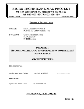 BIURO TECHNICZNE MAG PROJEKT 03-134 Warszawa, ul. Książkowa 9A m. 603 tel. 022-407-42-79; 602-628-159 NIP: 524-226-40-47 REGON: 015791033 PROJEKT BUDOWLANY OBIEKT: SZKOŁA PODSTAWOWA NR 2 PŁOŃSK, UL. GRUNWALDZKA 67A INWESTOR: GMINA MIASTO PŁOŃSK UL. PŁOCKA 39 09-100 PŁOŃSK PROJEKT BUDOWA WIATROŁAPU I MODERNIZACJA POMIESZCZEŃ PIWNICZNYCH ARCHITEKTURA PROJEKTOWAŁ: mgr inż. arch. Borys Pieskow upr. bud. nr 2088/60 …………………… SPRAWDZIŁ: mgr inż arch. Paweł Królik upr. bud. nr 901/94 …………………… WARSZAWA, 21.11.2013 R. EGZ. NR ZAWARTOŚĆ OPRACOWANIA I. DOKUMENTY FORMALNE − II. UPRAWNIENIA BUDOWLANE WRAZ Z ZAŚWIADCZENIEM Z IARP PROJEKT REMONTU BUDYNKU − OPIS TECHNICZNY − INFORMACJA BIOZ − OPINIA O WPŁYWIE ROBÓT NA STATYKĘ BUDYNKU − OŚWIADCZENIE PROJEKTANTA − RYSUNKI 1. Projekt zagospodarowania działki - 1:500 2. Inwentaryzacja – Rzut podziemia; Rzut przyziemia przybudówki - 1:100 3. Inwentaryzacja – Przekrój poprzeczny i Elewacje - 1:100 4. Projekt – Rzut podziemia - 1:100 5. Projekt – Rzut przyziemia przybudówki - 1:100 5A. Projekt – Rzut fundamentów przybudówki - 1:50 6. Projekt – Przekrój A-A - 1:100 7. Projekt – Przekrój B-B - 1:100 8. Projekt – Elewacje; Rzut dachu - 1:100 9. Projekt – Balustrady schodowe - 1:50/1:10 10. Projekt – Balustrada pochylni dla niepełnosprawnych - 1:20 11. Projekt – Balustrada schodów zewnętrznych - 1:20 12. Projekt – Wykaz okien i drzwi OPIS TECHNICZNY do projektu budowlanego architektonicznego remontu Szkoły Podstawowej nr 2 przy ul. Grunwaldzkiej 67A w Płońsku. 1. Podstawa formalno-prawna do opracowania projektu. 1.1. Zlecenie Inwestora: Gmina Miasto Płońsk 1.2. Inwentaryzacja budowlana budynku w zakresie zleconych prac remontowych. 1.3. Koncepcja zakresu remontu zaakceptowana przez Zleceniodawcę i Użytkownika dnia 5.11.2013 2. Zakres opracowania. Zgodnie z Umową niniejsze opracowanie obejmuje swoim zakresem: a) Remont części podziemia z zaprojektowaniem następujących pomieszczeń. − szatni dla uczniów; − W.C. dla dziewcząt i chłopców; − W.C. dla osób niepełnosprawnych; − pokoju socjalnego; − przebieralni dla chłopców i dziewcząt; − pomieszczeń magazynowych; Zachowuje się dotychczasowe przeznaczenie pozostałych pomieszczeń. b) Przebudowę istniejącego głównego wejścia do budynku (oszklonej werandy) z przeznaczeniem na hall wejściowy do Szkoły ze schodami prowadzącymi do podziemia wyposażonymi w platformę jezdną dla osób niepełnosprawnych. Powyższy zakres prac nie pociąga za sobą zmian w układzie istniejących pomieszczeń na parterze i piętrze budynku, jak również ingerencji w wystrój elewacji obiektu. 3. Opis stanu istniejącego. Budynek Szkoły wolnostojący, dwukondygnacyjny, całkowicie podpiwniczony, wzniesiony w konstrukcji murowej na przełomie lat 60-70 XX wieku. Układ konstrukcyjny podłużny. Mury konstrukcyjne z cegły. Stropy międzypiętrowe z prefabrykowanych płyt żelbetowych. Schody wewnętrzne żelbetowe, wylewane. Dach dwuspadowy kryty papą z dachowych płyt prefabrykowanych. Stan techniczny obiektu nie budzi zastrzeżeń, za wyjątkiem fragmentarycznego zawilgocenia podziemia. Elewacje budynku zostały ocieplone styropianem – stan elewacji nie budzi zastrzeżeń. Okna z PCW otwieralno uchylne o szkleniu jednokomorowym zespolonym. Okienka w podziemiu (50 x 50 cm.) z PCW. Techniczne wyposażenie obiektu: − instalacja wod-kan zasilana z sieci miejskich; − instalacja C.O. grzejnikowa zasilana z węzła cieplnego zlokalizowanego w podziemiu; − instalacja ciepłej wody zasilana z węzła cieplnego; − instalacja elektryczna. Przybudówka wejściowa od strony ulicy parterowa, konstrukcji stalowej, ramy (słupy i rygle z 2 140) osadzone na płytkiej podmurówce. Dach konstrukcji drewnianej kryty papą na deskowaniu. Podsufitka z boazeryjnych listew drewnianych. Ściany stanowią okna konstrukcji stalowej, nieotwieralne, pojedynczo szklone. Drzwi stalowe, szklone. Ze względu na projektowany zakres inwestycji, przybudówka przeznaczona jest do rozbiórki, z wykorzystaniem istniejących ram stalowych. 4. Roboty rozbiórkowe. − − − − − − − rozebranie przybudówki z demontażem istniejących ram stalowych z 2 140 przeznaczonych do ponownego ich wykorzystania; wykonanie wykopów pod projektowaną przybudówkę, do głębokości posadowienia istniejących fundamentów; rozbiórka fragmentów murowanych ścianek w podziemiu; rozbiórka posadzek w projektowanych pomieszczeniach podziemia; wykucie w istniejących ścianach podziemia otworów z założeniem nadproży z 2 HEB100 lub 2I120 (belki osiatkować i otynkować); skucie uszkodzonych tynków w podziemiu w pomieszczeniach projektowanych (ok. 80%); demontaże instalacji elektrycznych i sanitarnych ujęte w projektach branżowych; 5. Roboty projektowane. A. Remont części podziemia − Wymurowanie projektowanych ścianek działowych w podziemiu z cegły dziurawki grub. 12 cm. na zaprawie cem-wap. marki „50”. − Wykonanie podłoża pod posadzki w projektowanych pomieszczeniach z betonu B15 grub. 10 cm. na podsypce z piasku grub. 10 cm. − Izolacja posadzek – 2 x papa izolacyjna na lepiku. − Posadzki w pomieszczeniach projektowanych podziemia z płytek gres antypoślizgowych. − Cokoły przyścienne z płytek gres wysokości 15 cm. − Tynki na ścianach i sufitach w pomieszczeniach projektowanych w podziemiu cem-wap. gładkie kat. IV. − Malowanie wszystkich projektowanych pomieszczeń farbą emulsyjną w kolorze białym. − Okładziny ścienne w pomieszczeniach sanitarnych – glazura do wysokości 2,05 m. W pomieszczeniu socjalnym przy zlewie i umywalce – glazura do wysokości 1,50 m. − Drzwi w piwnicach D1, D2, D5, D6 drewniane EI 30, płytowe z ościeżnicami drewnianymi wyposażone w samozamykacze. − Drzwi D8 stalowe 2-skrzydłowe EI 60 z samozamykaczem. − Kabiny ustępowe aluminiowe, preafabrykowane12