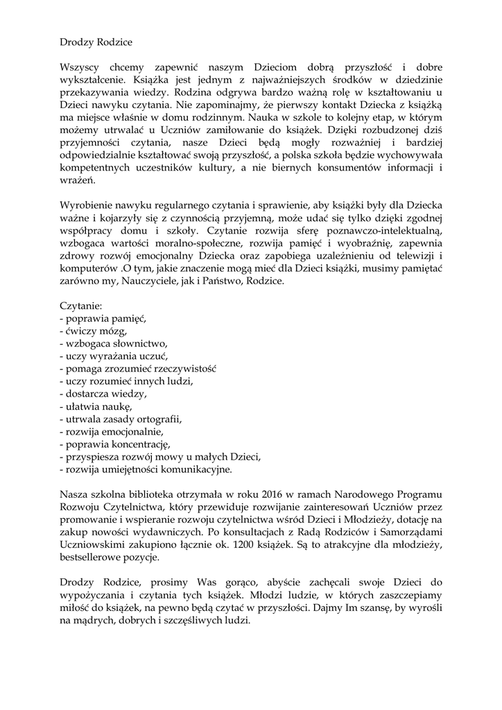 Drodzy Rodzice Wszyscy chcemy zapewnić naszym Dzieciom dobrą przyszłość i dobre wykształcenie. Książka jest jednym z najważniejszych środków w dziedzinie przekazywania wiedzy. Rodzina odgrywa bardzo ważną rolę w kształtowaniu u Dzieci nawyku czytania. Nie zapominajmy, że pierwszy kontakt Dziecka z książką ma miejsce właśnie w domu rodzinnym. Nauka w szkole to kolejny etap, w którym możemy utrwalać u Uczniów zamiłowanie do książek. Dzięki rozbudzonej dziś przyjemności czytania, nasze Dzieci będą mogły rozważniej i bardziej odpowiedzialnie kształtować swoją przyszłość, a polska szkoła będzie wychowywała kompetentnych uczestników kultury, a nie biernych konsumentów informacji i wrażeń. Wyrobienie nawyku regularnego czytania i sprawienie, aby książki były dla Dziecka ważne i kojarzyły się z czynnością przyjemną, może udać się tylko dzięki zgodnej współpracy domu i szkoły. Czytanie rozwija sferę poznawczo-intelektualną, wzbogaca wartości moralno-społeczne, rozwija pamięć i wyobraźnię, zapewnia zdrowy rozwój emocjonalny Dziecka oraz zapobiega uzależnieniu od telewizji i komputerów .O tym, jakie znaczenie mogą mieć dla Dzieci książki, musimy pamiętać zarówno my, Nauczyciele, jak i Państwo, Rodzice. Czytanie: - poprawia pamięć, - ćwiczy mózg, - wzbogaca słownictwo, - uczy wyrażania uczuć, - pomaga zrozumieć rzeczywistość - uczy rozumieć innych ludzi, - dostarcza wiedzy, - ułatwia naukę, - utrwala zasady ortografii, - rozwija emocjonalnie, - poprawia koncentrację, - przyspiesza rozwój mowy u małych Dzieci, - rozwija umiejętności komunikacyjne. Nasza szkolna biblioteka otrzymała w roku 2016 w ramach Narodowego Programu Rozwoju Czytelnictwa, który przewiduje rozwijanie zainteresowań Uczniów przez promowanie i wspieranie rozwoju czytelnictwa wśród Dzieci i Młodzieży, dotację na zakup nowości wydawniczych. Po konsultacjach z Radą Rodziców i Samorządami Uczniowskimi zakupiono łącznie ok. 1200 książek. Są to atrakcyjne dla młodzieży, bestsellerowe pozycje. Drodzy Rodzice, prosimy Was gorąco, abyście zachęcali swoje Dzieci do wypożyczania i czytania tych książek. Młodzi ludzie, w których zaszczepiamy miłość do książek, na pewno będą czytać w przyszłości. Dajmy Im szansę, by wyrośli na mądrych, dobrych i szczęśliwych ludzi.