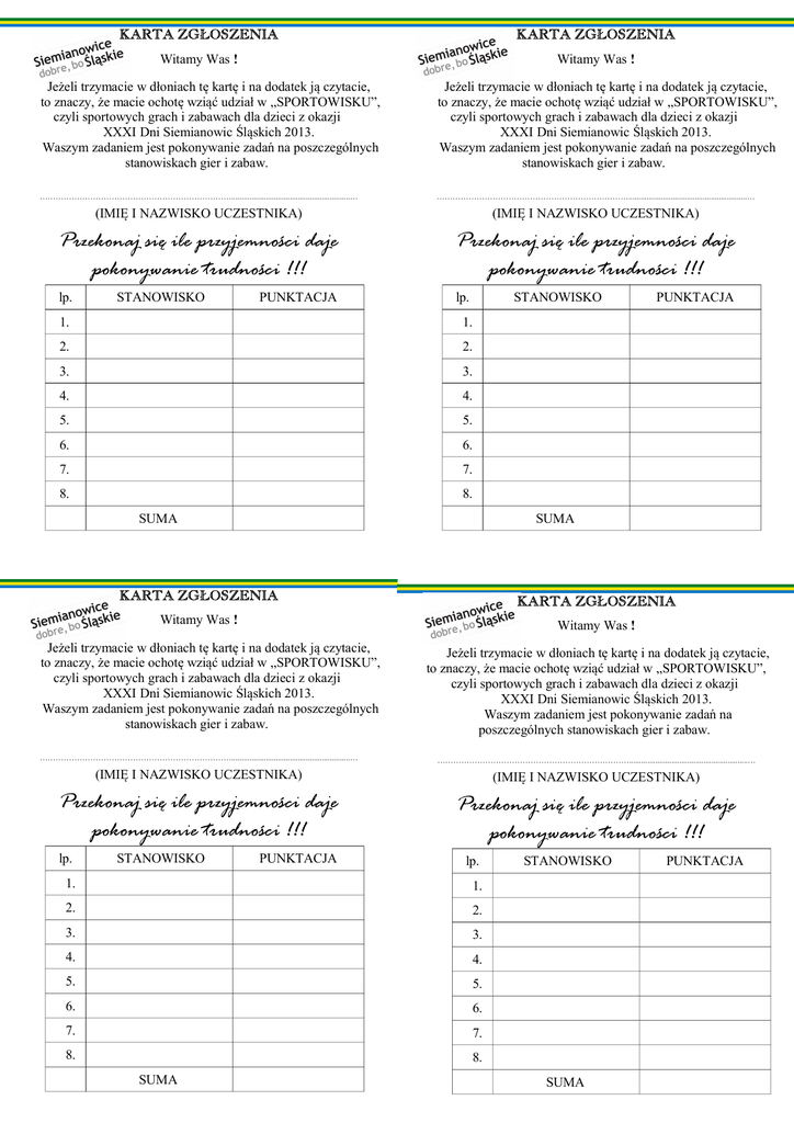 KARTA ZGŁOSZENIA KARTA ZGŁOSZENIA Witamy Was ! Witamy Was ! Jeżeli trzymacie w dłoniach tę kartę i na dodatek ją czytacie, to znaczy, że macie ochotę wziąć udział w „SPORTOWISKU”, czyli sportowych grach i zabawach dla dzieci z okazji XXXI Dni Siemianowic Śląskich 2013. Waszym zadaniem jest pokonywanie zadań na poszczególnych stanowiskach gier i zabaw. Jeżeli trzymacie w dłoniach tę kartę i na dodatek ją czytacie, to znaczy, że macie ochotę wziąć udział w „SPORTOWISKU”, czyli sportowych grach i zabawach dla dzieci z okazji XXXI Dni Siemianowic Śląskich 2013. Waszym zadaniem jest pokonywanie zadań na poszczególnych stanowiskach gier i zabaw. ………………………………………………………………...........................................................… ………………………………………………………………...........................................................… (IMIĘ I NAZWISKO UCZESTNIKA) (IMIĘ I NAZWISKO UCZESTNIKA) Przekonaj się ile przyjemności daje Przekonaj się ile przyjemności daje pokonywanie trudności !!! pokonywanie trudności !!! lp. STANOWISKO PUNKTACJA lp. STANOWISKO 1. 1. 2. 2. 3. 3. 4. 4. 5. 5. 6. 6. 7. 7. 8. 8. SUMA PUNKTACJA SUMA KARTA ZGŁOSZENIA KARTA ZGŁOSZENIA Witamy Was ! Witamy Was ! Jeżeli trzymacie w dłoniach tę kartę i na dodatek ją czytacie, to znaczy, że macie ochotę wziąć udział w „SPORTOWISKU”, czyli sportowych grach i zabawach dla dzieci z okazji XXXI Dni Siemianowic Śląskich 2013. Waszym zadaniem jest pokonywanie zadań na poszczególnych stanowiskach gier i zabaw. Jeżeli trzymacie w dłoniach tę kartę i na dodatek ją czytacie, to znaczy, że macie ochotę wziąć udział w „SPORTOWISKU”, czyli sportowych grach i zabawach dla dzieci z okazji XXXI Dni Siemianowic Śląskich 2013. Waszym zadaniem jest pokonywanie zadań na poszczególnych stanowiskach gier i zabaw. ………………………………………………………………...........................................................… ………………………………………………………………...........................................................… (IMIĘ I NAZWISKO UCZESTNIKA) (IMIĘ I NAZWISKO UCZESTNIKA) Przekonaj się ile przyjemności daje Przekonaj się ile przyjemności daje pokonywanie trudności !!! pokonywanie trudności !!! lp. STANOWISKO PUNKTACJA lp. 1. 1. 2. 2. 3. 3. 4. 4. 5. 5. 6. 6. 7. 7. 8. 8. SUMA STANOWISKO SUMA PUNKTACJA Siemianowice Śląskie, 9.06.2013 r. Wyrażam zgodę na udział mojego dziecka: Siemianowice Śląskie, 9.06.2013 r. Wyrażam zgodę na udział mojego dziecka: ….............................................................................................. (IMIĘ I NAZWISKO DZIECKA) …............................................................................................ (IMIĘ I NAZWISKO DZIECKA) w „SPORTOWISKU”, czyli sportowych grach i zabawach dla w „SPORTOWISKU”, czyli sportowych grach i zabawach dla dzieci z okazji XXXI Dni Siemianowic Śląskich organizowanych dzieci przez organizowanych przez Referat Sportu w Wydziale Kultury, Referat Sportu w Wydziale Kultury, Promocji i Sportu z okazji XXXI Dni Siemianowic Śląskich Urzędu Miasta Siemianowice Śląskie oraz MOSiR „Pszczelnik” Promocji i Sportu Urzędu Miasta Siemianowice Śląskie oraz w dniu 9.06.2013 r. MOSiR „Pszczelnik” w dniu 9.06.2013 r. Jednocześnie potwierdzam brak przeciwwskazań zdrowotnych Jednocześnie potwierdzam brak przeciwwskazań zdrowotnych do udziału dziecka w w/w grach i zabawach oraz akceptuję do udziału dziecka w w/w grach i zabawach oraz akceptuję regulamin imprezy sportowej. regulamin imprezy sportowej. ….................…..........………………………………... PODPIS RODZICA LUB OPIEKUNA PRAWNEGO ….................…..........………………………………... PODPIS RODZICA LUB OPIEKUNA PRAWNEGO Siemianowice Śląskie, 9.06.2013 r. Siemianowice Śląskie, 9.06.2013 r. Wyrażam zgodę na udział mojego dziecka: Wyrażam zgodę na udział mojego dziecka: …............................................................................................ (IMIĘ I NAZWISKO DZIECKA) ….............................................................................................. (IMIĘ I NAZWISKO DZIECKA) w „SPORTOWISKU”, czyli sportowych grach i zabawach dla dzieci z okazji XXXI Dni Siemianowic Śląskich organizowanych przez Referat Sportu w Wydziale Kultury, Promocji i Sportu Urzędu Miasta Siemianowice Śląskie oraz MOSiR „Pszczelnik” w dniu 9.06.2013 r. Jednocześnie potwierdzam brak przeciwwskazań zdrowotnych do udziału dziecka w w/w grach i zabawach oraz akceptuję regulamin imprezy sportowej. w „SPORTOWISKU”, czyli sportowych grach i zabawach dla dzieci z okazji XXXI Dni Siemianowic Śląskich organizowanych przez Referat Sportu w Wydziale Kultury, Promocji i Sportu Urzędu Miasta Siemianowice Śląskie oraz MOSiR „Pszczelnik” w dniu 9.06.2013 r. Jednocześnie potwierdzam brak przeciwwskazań zdrowotnych do udziału dziecka w w/w grach i zabawach oraz akceptuję regulamin imprezy sportowej. ….................…..........………………………………... PODPIS RODZICA LUB OPIEKUNA PRAWNEGO ….................…..........………………………………... PODPIS RODZICA LUB OPIEKUNA PRAWNEGO
