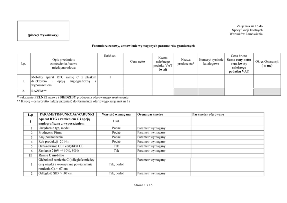 Załącznik nr 1b do Specyfikacji Istotnych Warunków Zamówienia (pieczęć wykonawcy) Formularz cenowy, zestawienie wymaganych parametrów granicznych Ilość szt. Lp. Opis przedmiotu zamówienia /nazwa międzynarodowa 1. Mobilny aparat RTG ramię C z płaskim detektorem i opcją angiograficzną z wyposażeniem 2. RAZEM** Cena netto Kwota należnego podatku VAT (w zł) Nazwa producenta* Numery/ symbole katalogowe 1 * wskazanie PEŁNEJ nazwy i SIEDZIBY producenta oferowanego asortymentu ** Kwotę – cena brutto należy przenieść do formularza ofertowego załącznik nr 1a L.p I 1. 2. 3. 4. 5. 6. II 1. 2. PARAMETR/FUNKCJA/WARUNKI Aparat RTG z ramieniem C i opcją angiograficzną z wyposażeniem Urządzenie typ, model Producent/ Firma Kraj pochodzenia Rok produkcji 2014 r. Oznakowanie CE i certyfikat CE Zasilanie 240V +/-10%, 50Hz Ramie C mobilne Głębokość ramienia C (odległość między osią wiązki a wewnętrzną powierzchnią ramienia C) > 67 cm Odległość SID >107 cm Wartość wymagana Ocena parametru 1 szt. Podać Podać Podać Podać Tak Tak Parametr wymagany Parametr wymagany Parametr wymagany Parametr wymagany Parametr wymagany Parametr wymagany Parametr wymagany Tak, podać Tak, podać Parametr wymagany Strona 1 z 15 Parametry oferowane Cena brutto Suma ceny netto oraz kwoty należnego podatku VAT Okres Gwarancji ( w mc) 3. Zakres ruchu poziomy ramienia C >20 cm Tak, podać 4. Zakres ruchu pionowego ramienia C > 40 cm Tak, podać 5. Ruch pionowy zmotoryzowany 6. Szybkość ruchu pionowego min. 20mm/s Tak, podać 7. Zakres ruchu orbitalnego ramienia C ≥ 145° Tak, podać 8. Zakres obrotu ramienia C (obrót wokół osi wzdłużnej) > ±190° Tak, podać 9. 10. 11. 12. 13. 14. 15. 16. 17. Zakres obrotu ramienia C wokół osi pionowej ≥ ±10° Prześwit ramienia C (odległość między detektorem obrazu a lampą RTG) > 80 cm Urządzenie zabezpieczające przed najeżdżaniem na leżące przewody Uchwyt na obudowie detektora do ręcznego manipulowania ramieniem C Blokada kół Ręczny włącznik promieniowania Przycisk bezpieczeństwa wyłączający natychmiast aparat lub funkcje aparatu (ruch i promieniowanie) Sygnalizacja włączonego promieniowania Hamulce mechaniczne wszystkich ruchów ramienia C Tak Tak, podać Wartość max. – 10 pkt, wartość min. 1 pkt, pozostałe proporcjonalnie. Wartość max. – 10 pkt, wartość min. 1 pkt, pozostałe proporcjonalnie. Parametr wymagany Wartość max. – 10 pkt, wartość min. 1 pkt, pozostałe proporcjonalnie. Wartość max. – 10 pkt, wartość min. 1 pkt, pozostałe proporcjonalnie. Wartość max. – 10 pkt, wartość min. 1 pkt, pozostałe proporcjonalnie. Parametr wymagany Parametr wymagany Tak, podać Tak Tak/Nie Tak Tak Parametr wymagany Tak – 5 pkt Nie – 0 pkt Parametr wymagany Parametr wymagany Parametr wymagany Tak Tak Tak Parametr wymagany Parametr wymagany Strona 2 z 15 18. 19. 20. 21. 22. III 1. Poszczególne hamulce oznaczone różnymi kolorami w celu łatwiejszej identyfikacji i komunikacji podczas zabiegu Unieruchomienie (aretaż) kół w pozycji równoległej do stołu operacyjnego Monitor dotykowy - interface użytkownika, do sterowania funkcjami obrazu oraz generatora zamontowany na wózku z ramieniem C. Obracanie i/lub pochylanie monitora, względem wózka z ramieniem C. Podgląd obrazu zatrzymanego LIH z następującymi funkcjami sterowanymi dotykiem: - sterowanie cyfrowym obrotem obrazu - sterowanie kontrastem i jasnością obrazu - ustawianie pozycji kolimatorów - wyświetlanie mozaiki obrazu Sygnalizacja świetlna włączonego promieniowania Podgląd obrazu na żywo na monitorze dotykowym na wózku z ramieniem C. Podać przekątną obrazu Szerokość wózka z ramieniem C max 90cm GENERATOR Generator wysokiej częstotliwości min. 20 kHz, impulsowy, wbudowany w urządzenie zapewniający łatwy transport aparatu pomiędzy salami. Parametr wymagany Tak Tak Parametr wymagany Parametr wymagany Obracanie i pochylanie monitora – 5 pkt. Tak, opisać Tylko jedna z powyższych funkcji – 0 pkt. Tak, podać Tak Parametr wymagany Wartość min. – 10 pkt, wartość max. 1 pkt, pozostałe proporcjonalnie. Parametr wymagany Tak Strona 3 z 15 2. 3. 4. 5. 6. 7. 8. 9. 10. 11. 12. Generator wbudowany tzw. monoblok . Nie dopuszcza się aparatów z osobnym generatorem niewbudowanym w ramię C. Nie dopuszcza się aparatów z kablami wysokonapięciowymi umieszczonymi w konstrukcji ramienia C poza monoblokiem. Zakres częstotliwości impulsów generatora min. 1- 25pulsów/s Szerokość impulsu regulowana w zakresie: min. 5 - 10 ms Moc generatora RTG min. 25 kW (dla 100kV) zgodnie z obowiązującą normą IEC 60601-2-54 Tryby fluoroskopii Tryby radiografii w tym radiografia cyfrowa Maksymalne napięcie w trybie fluoroskopii/radiografii min. 120kV Zakres prądów dla trybów fluoroskopii ciągłej i pulsacyjnej min. 3 do 200 mA Prąd dla trybu radiografii cyfrowej min. 200 mA Automatyczny dobór poziomu dawki Redukcja poziomu dawki promieniowania w trybie fluoroskopii ≥ 50% Parametr wymagany Tak Tak, podać Tak, podać Parametr wymagany Największy zakres – 10 pkt, Najmniejszy zakres 1 pkt, pozostałe proporcjonalnie. Parametr wymagany Tak, podać Tak Tak Parametr wymagany Parametr wymagany Tak, podać Parametr wymagany Tak, podać Największy zakres – 10 pkt, Najmniejszy zakres 1 pkt, pozostałe proporcjonalnie. Tak, podać Parametr wymagany Tak Parametr wymagany Tak, podać Parametr wymagany Strona 4 z 15 13. IV 1. 2. 3. 4. 5. 6. 7. 8. Pakiet naczyniowy: - cyfrowa angiografia substrakcyjna DSA - automatyczne wychwycenie zdjęć o największym zaczernieniu kontrastem - roadmapping, wykonywanie roadmapy z jednej klatki, wybranego fragmentu pętli DSA lub całego filmu DSA - Pixelshift, - Landmarking - programy anatomiczne dedykowane badaniom naczyniowym (min 2 programy) - wyświetlanie obrazów bez subtrakcji na monitorze referencyjnym równolegle do obrazu DSA na monitorze obrazu na żywo LAMPA I KOLIMATOR