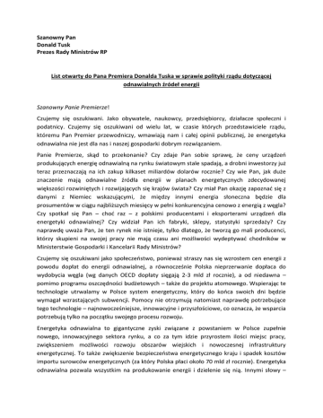 Szanowny Pan Donald Tusk Prezes Rady Ministrów RP List otwarty do Pana Premiera Donalda Tuska w sprawie polityki rządu dotyczącej odnawialnych źródeł energii Szanowny Panie Premierze! Czujemy się oszukiwani. Jako obywatele, naukowcy, przedsiębiorcy, działacze społeczni i podatnicy. Czujemy się oszukiwani od wielu lat, w czasie których przedstawiciele rządu, któremu Pan Premier przewodniczy, wmawiają nam i całej opinii publicznej, że energetyka odnawialna nie jest dla nas i naszej gospodarki dobrym rozwiązaniem. Panie Premierze, skąd to przekonanie? Czy zdaje Pan sobie sprawę, że ceny urządzeń produkujących energię odnawialną na rynku światowym stale spadają, a drobni inwestorzy już teraz przeznaczają na ich zakup kilkaset miliardów dolarów rocznie? Czy wie Pan, jak duże znaczenie mają odnawialne źródła energii w planach energetycznych zdecydowanej większości rozwiniętych i rozwijających się krajów świata? Czy miał Pan okazję zapoznać się z danymi z Niemiec wskazującymi, że między innymi energia słoneczna będzie dla prosumentów w ciągu najbliższych miesięcy w pełni konkurencyjna cenowo z energią z węgla? Czy spotkał się Pan – choć raz – z polskimi producentami i eksporterami urządzeń dla energetyki odnawialnej? Czy widział Pan ich fabryki, sklepy, statystyki sprzedaży? Czy naprawdę uważa Pan, że ten rynek nie istnieje, tylko dlatego, że tworzą go mali producenci, którzy skupieni na swojej pracy nie mają czasu ani możliwości wydeptywać chodników w Ministerstwie Gospodarki i Kancelarii Rady Ministrów? Czujemy się oszukiwani jako społeczeństwo, ponieważ straszy nas się wzrostem cen energii z powodu dopłat do energii odnawialnej, a równocześnie Polska nieprzerwanie dopłaca do wydobycia węgla (wg danych OECD dopłaty sięgają 2-3 mld zł rocznie), a od niedawna – pomimo programu oszczędności budżetowych – także do projektu atomowego. Wspierając te technologie utrwalamy w Polsce system energetyczny, który do końca swoich dni będzie wymagał wzrastających subwencji. Pomocy nie otrzymują natomiast naprawdę potrzebujące tego technologie – najnowocześniejsze, innowacyjne i przyszłościowe, co oznacza, że wsparcia potrzebują tylko na początku swojego procesu rozwoju. Energetyka odnawialna to gigantyczne zyski związane z powstaniem w Polsce zupełnie nowego, innowacyjnego sektora rynku, a co za tym idzie przyrostem ilości miejsc pracy, zwiększeniem możliwości rozwoju obszarów wiejskich i nowoczesnej infrastruktury energetycznej. To także zwiększenie bezpieczeństwa energetycznego kraju i spadek kosztów importu surowców energetycznych (za który Polska płaci około 70 mld zł rocznie). Energetyka odnawialna pozwala wszystkim na produkowanie energii i dzielenie się nią. Innymi słowy – wykorzystanie odnawialnych źródeł energii oznacza skok cywilizacyjny całej gospodarki, porównywalny do upowszechnienia Internetu. Dlatego jesteśmy głęboko zaniepokojeni sytuacją związaną z pracami nad projektem ustawy o odnawialnych źródłach energii. Proponowane w projekcie regulacji rozwiązania zamkną możliwości rozwoju energetyki odnawialnej. Będą one korzystne głównie dla dużych koncernów energetycznych, które na niespotykaną w świecie skalę produkują „zieloną” energię w technologii spalania wielopaliwowego – współspalania węgla z importowaną (z ponad 20 państw) biomasą. Jest to technologia nieefektywna i generalnie niewspierana w innych państwach Unii Europejskiej. Żadne wsparcie nie jest zaś skierowane do obywateli (potencjalnych prosumentów, czyli zarazem producentów i konsumentów energii) oraz do technologii lokalnego wytwarzania tzw. „zielonego ciepła”. Co więcej, proponowany projekt ustawy o odnawialnych źródłach energii nie zapewni wypełnienia celów dyrektywy unijnej o promocji odnawialnych źródeł energii. Naraża to nasz kraj i nas – podatników, na ogromne kary ze strony Komisji Europejskiej w nowym postępowaniu za nieprawidłową implementację. Panie Premierze, apelujemy do Pana o spojrzenie strategiczne i długoterminowe na politykę energetyczną Polski. Prosimy Pana o odrzucenie projektu ustawy o odnawialnych źródłach energii przedstawionego przez Ministerstwo Gospodarki (wersja 4.1) jako szkodliwego dla polskiej energetyki, gospodarki i społeczeństwa. Uważamy, że należy powrócić do wypracowanych rozwiązań dla energetyki rozproszonej, z pełni skonsultowanego poprzedniego projektu ustawy OZE z 2012 roku, otwartego na rozwój energetyki obywatelskiej. Oczekujemy również, że stworzy Pan warunki do uczciwej debaty eksperckiej na temat planów rozwoju energetyki w Polsce i zaprzestanie dyskryminacji i oczerniania odnawialnych źródeł energii w oczach obywateli. Sygnatariusze listu: Związek Pracodawców Forum Energetyki Odnawialnej Grzegorz Wiśniewski, prezes Polska Organizacja Rozwoju Technologii Pomp Ciepła Paweł Lachman, prezes Stowarzyszenie Producentów i Importerów Urządzeń Grzewczych Janusz Starościk, prezes Fundacja Rozwoju Energetyki Słonecznej Ryszard Ciach, prezes Klaster 3x20 Jan Popczyk, prezes Polskie Stowarzyszenie Geotermiczne Beata Kępińska, prezes Polskie Stowarzyszenie Pomp Ciepła Tomasz Mania, v-ce prezes Polska Korporacja Techniki SGGiK Tadeusz Jassa, prezydent Unia Producentów i Pracodawców Przemysłu Biogazowego Sylwia Koch-Kopyszko, prezes Pomorskie Konsorcjum 3x20 Edward Licznerski, prezes Stowarzyszenie Wolna Przedsiębiorczość Krzysztof Brzozowski, prezes Polskie Towarzystwo Fotowoltaiki Stanisław M. Pietruszko, prezes Polska Izba Ekologii Grzegorz Pasieka, prezes Koalicja Klimatyczna* Zbigniew Karaczun, ekspert * Koalicja Klimatyczna jest porozumieniem 23 organizacji pozarządowych. Jej misją jest wspólne działanie w celu zapobiegania wywołanym przez człowieka zmianom klimatu dla dobra ludzi i środowiska. Fundacja Aeris Futuro, Fundacja ClientEarth
