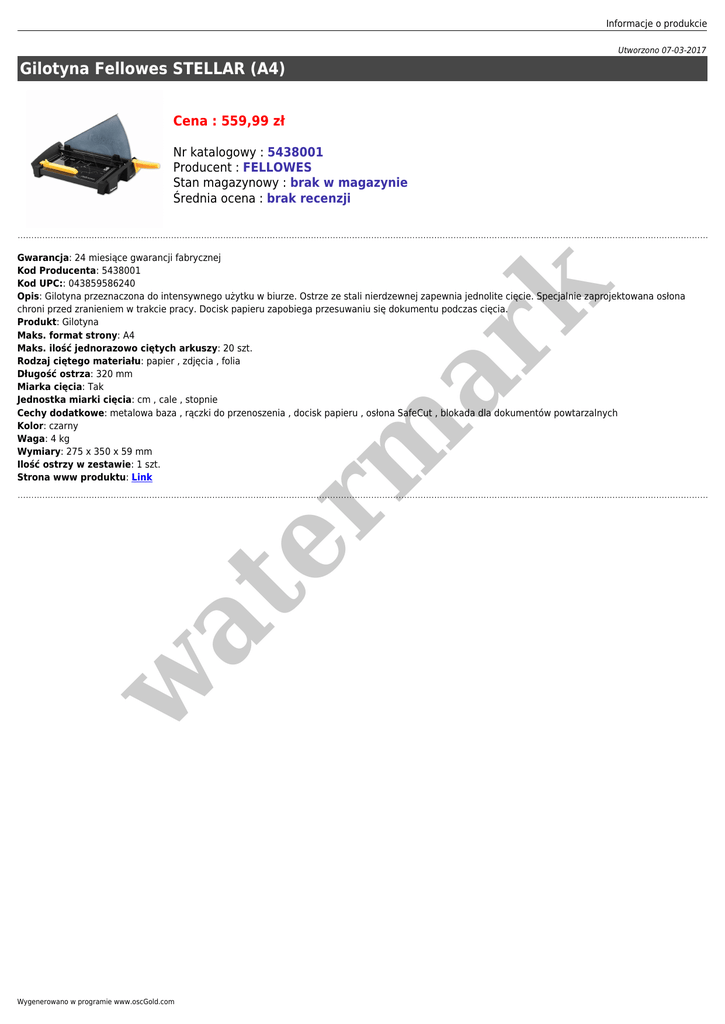 Informacje o produkcie Utworzono 07-03-2017 Gilotyna Fellowes STELLAR (A4) Cena : 559,99 zł Nr katalogowy : 5438001 Producent : FELLOWES Stan magazynowy : brak w magazynie Średnia ocena : brak recenzji w at er m ar k Gwarancja: 24 miesiące gwarancji fabrycznej Kod Producenta: 5438001 Kod UPC:: 043859586240 Opis: Gilotyna przeznaczona do intensywnego użytku w biurze. Ostrze ze stali nierdzewnej zapewnia jednolite cięcie. Specjalnie zaprojektowana osłona chroni przed zranieniem w trakcie pracy. Docisk papieru zapobiega przesuwaniu się dokumentu podczas cięcia. Produkt: Gilotyna Maks. format strony: A4 Maks. ilość jednorazowo ciętych arkuszy: 20 szt. Rodzaj ciętego materiału: papier , zdjęcia , folia Długość ostrza: 320 mm Miarka cięcia: Tak Jednostka miarki cięcia: cm , cale , stopnie Cechy dodatkowe: metalowa baza , rączki do przenoszenia , docisk papieru , osłona SafeCut , blokada dla dokumentów powtarzalnych Kolor: czarny Waga: 4 kg Wymiary: 275 x 350 x 59 mm Ilość ostrzy w zestawie: 1 szt. Strona www produktu: Link Wygenerowano w programie www.oscGold.com
