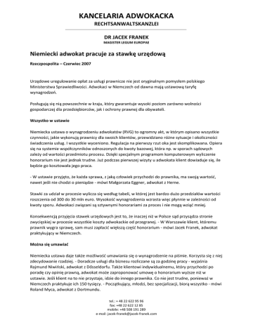 KANCELARIA ADWOKACKA RECHTSANWALTSKANZLEI DR JACEK FRANEK MAGISTER LEGUM EUROPAE Niemiecki adwokat pracuje za stawkę urzędową Rzeczpospolita – Czerwiec 2007 Urzędowe uregulowanie opłat za usługi prawnicze nie jest oryginalnym pomysłem polskiego Ministerstwa Sprawiedliwości. Adwokaci w Niemczech od dawna mają ustawową taryfę wynagrodzeń. Posługują się nią powszechnie w kraju, który gwarantuje wysoki poziom zarówno wolności gospodarczej dla przedsiębiorców, jak i ochrony prawnej dla obywateli. Wszystko w ustawie Niemiecka ustawa o wynagrodzeniu adwokatów (RVG) to ogromny akt, w którym opisano wszystkie czynności, jakie wykonują prawnicy dla swoich klientów, przewidziano różne sytuacje i okoliczności świadczenia usług. I wszystkie wyceniono. Regulacja na pierwszy rzut oka jest skomplikowana. Opiera się na systemie współczynników odnoszonych do kwoty bazowej, która np. w sporach sądowych zależy od wartości przedmiotu procesu. Dzięki specjalnym programom komputerowym wyliczenie honorarium nie jest jednak trudne. Już podczas pierwszej wizyty u adwokata klient dowiaduje się, ile będzie go kosztowała jego praca. - W ustawie przyjęto, że każda sprawa, z jaką człowiek przychodzi do prawnika, ma swoją wartość, nawet jeśli nie chodzi o pieniądze - mówi Małgorzata Eggner, adwokat z Herne. Stawki za udział w procesie wylicza się według tabeli, w której jest bardzo dużo przedziałów wartości roszczenia od 300 do 30 mln euro. Wysokość wynagrodzenia wzrasta więc płynnie w zależności od kwoty sporu. Adwokaci związani są sztywnymi honorariami za proces i nie mogą wziąć mniej. Konsekwencją przyjęcia stawek urzędowych jest to, że inaczej niż w Polsce sąd przysądza stronie zwycięskiej w procesie wszystkie koszty adwokackie od przegranej. - W Warszawie klient, któremu prawnik wygra sprawę, sam musi zapłacić większą część honorarium - mówi Jacek Franek, adwokat praktykujący w Niemczech. Można się umawiać Niemiecka ustawa daje także możliwość umawiania się o wynagrodzenie na piśmie. Korzysta się z niej zdecydowanie rzadziej. - Doradcze usługi dla biznesu rozliczane są za godzinę pracy - wyjaśnia Rajmund Niwiński, adwokat z Dősseldorfu. Także klientowi indywidualnemu, który przychodzi po poradę czy opinię prawną, adwokat może zaproponować umowę o honorarium wyższe niż w ustawie. Jeśli klient na to nie przystaje, idzie do innego prawnika. Co nie jest trudne, ponieważ w Niemczech praktykuje ich 150 tysięcy. - Początkujący, młodzi, bez specjalizacji, biorą wszystko - mówi Roland Myca, adwokat z Dortmundu. tel.: + 48 22 622 95 96 fax: +48 22 622 12 85 mobile: +48 508 191 289 e-mail: [email protected] KANCELARIA ADWOKACKA RECHTSANWALTSKANZLEI DR JACEK FRANEK MAGISTER LEGUM EUROPAE Według Rajmunda Niwińskiego system działa tak, że raz można dobrze zarobić na prostym sporze o dużą kwotę, a kiedy indziej trafi się na sprawę o 1500 euro, za którą bierze się 200. - Jeśli trzeba na to poświęcić 20 godzin, wtedy prawnik zarabia mniej niż fryzjer - mówi. I dodaje, że zdecydowanie niedoszacowane są stawki za obronę w sprawach karnych. - W Niemczech przeciętny adwokat, aby zarobić realnie tyle, ile jego kolega w Polsce, musi pracować więcej - ocenia Roland Myca. I podaje przykład znajomego, który - żeby się utrzymać - musi mieć miesięcznie 50 spraw mieszkaniowych. Podobnie uważa Małgorzata Eggner, której kancelaria ma klientów z Polski. Jej zdaniem porównanie relacji honorariów adwokatów niemieckich i polskich do średnich płac w obu krajach wypada zdecydowanie na korzyść polskich. - Kiedy koledzy z Polski, których prosimy o zastępstwo przed sądem, chcą 6 tys. zł za sprawę, przyjeżdżamy z Niemiec i obsługujemy ją za 500 euro - opowiada. masz pytanie do autora, e-mail: [email protected] Honorarium niemieckiego adwokata ustalane jest według współczynników: opłata za udział w rozprawie wynosi 1,2 stawki bazowej ustalonej w tabeli dla konkretnej wartości przedmiotu sporu + opłata procesowa 1,3 stawki bazowej ustalonej w tabeli dla konkretnej wartości przedmiotu sporu. Do tego 20 euro tzw. ryczałtu telekomunikacyjnego. Przykład: Przy wartości przedmiotu sporu 10 tys. euro honorarium wynosi: 486 + 632 + 20 = 1138 euro netto. Porada dla klienta indywidualnego nie może kosztować więcej niż 190 euro. Korzystaniu z pomocy prawników sprzyja rozbudowany system ubezpieczeń ochrony prawnej. Wiele osób ma polisy, które pozwalają im opłacić adwokata w sporze ubezpieczeniowym czy mieszkaniowym. Źródło : Rzeczpospolita tel.: + 48 22 622 95 96 fax: +48 22 622 12 85 mobile: +48 508 191 289 e-mail: [email protected]