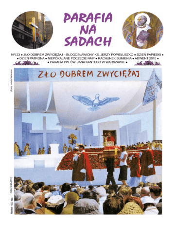 Nakład 1000 egz. ISSN 1895-653X Komp. Maria Natanson NR 23 ● ZŁO DOBREM ZWYCIĘŻAJ – BŁOGOSŁAWIONY KS. JERZY POPIEŁUSZKO ● DZIEŃ PAPIESKI ● ● DZIEŃ PATRONA ● NIEPOKALANE POCZĘCIE NMP ● RACHUNEK SUMIENIA ● ADWENT 2010 ● ● PARAFIA PW. ŚW. JANA KANTEGO W WARSZAWIE ● Konkurs „Zło dobrem zwyciężaj” W okresie poprzedzającym beatyfikację ks. Jerzego Popiełuszki Katolicki Zespół Edukacyjny im. ks. Piotra Skargi i Centrum Edukacyjne Archidiecezji Warszawskiej zorganizowały konkurs plastyczny „Zło dobrem zwyciężaj”. Dzieło to wspierał swoim błogosławieństwem ks. abp Kazimierz Nycz – Metropolita Warszawski. W konkursie plastycznym wzięli udział uczniowie Szkoły Podstawowej nr 267 na Sadach Żoliborskich pod kierunkiem ks. dra Michała Dubickiego. Do II etapu konkursu zakwalifikowało się 5 prezentowanych poniżej prac. Redakcja Rys. Olga Rosińska, kl V a Rys. Maria Sobiecka, kl V a Rys. Witold Janiszewski, kl IV b 2 Rys. Bartosz Skowron, kl VI b Rys. Natalia Lemańska, kl V a P ar afia na S ad ac h nr 23 ŚWIĘTA I UROCZYSTOŚCI W NASZEJ PARAFII PAŹDZIERNIK - 24 GRUDNIA 2010 Kantyczka dla Matki Boskiej Panno Czysta od fiat Ty, która się zgodziłaś Jasnogórska Madonno z twarzą mieczem ranioną Ostrobramska, wileńska Opiekunko potężna Październik 2 października – 1. sobota miesiąca. Św. Aniołów Stróżów. Msza św. o beatyfikację Sługi Bożego Jana Pawła II o godz. 18.30. NABOŻEŃSTWO RÓŻAŃCOWE o godz. 17.45 1 października – piątek, Wspomnienie św. Teresy od Dzieciątka Jezus, patronki misji katolickich. Matko Boska Łaskawa, która chronisz Warszawę Fatimska, co Papieża od nagłej śmierci strzegłaś hiszpańska Panienko ustrojona sukienką i Ty, majowa Pani obsypana kwiatami 13 października – środa Całodzienna Adoracja Najświętszego Sakramentu zakończona Nabożeństwem Różańcowym o godz. 17.45. 16 października – sobota, św. Jadwigi Śląskiej. 32. rocznica wyboru papieża Jana Pawła II (1978). Msza św. o beatyfikację Sługi Bożego Jana Pawła II o godz. 18.30. Gromniczna, lutowa co blask świecy zachowasz Zielna - łąką pachnąca Przydrożna - współczująca 20 października – środa, św. Jana Kantego, Patrona naszej Parafii. ODPUST PARAFIALNY. Msza św. odpustowa o godz. 18.30. Można uzyskać odpust zupełny. Rys. arch. red. Pieto z bólu omdlała nad Syna martwym ciałem - Anna Mieczyńska czerwiec 2010 „Zupełne oddanie jest szczytem miłości a najwyższym punktem tego szczytu jest Duch Dziecięctwa” ks. bp Charles Gay „Dziecięctwo duchowe jest niezbędnym warunkiem osiągnięcia życia wiekuistego: wierni wszystkich narodowości powinni wielkodusznie wejść na drogę, na której Siostra Teresa od Dzieciątka Jezus zdobyła tak heroiczne cnoty” Rys. arch. red. Benedykt XV P ar afia na S ad ac h nr 23 7 października – czwartek, Matki Bożej Różańcowej. 10 października – 28. niedziela zwykła X DZIEŃ PAPIESKI Jana Pawła II. Hasło: „Jan Paweł II – Odwaga świętości”. Msza św. o godz. 10.00 w intencjach Dnia Papieskiego. Katyńska, co w ramionach tulisz głowę przestrzeloną przez smutek, żal i łzy uśmiechnij się, Królowo, za nami przemów słowo i prowadź nas - pod Krzyż 3 - 10 października – Tydzień Miłosierdzia. Listopad 1 listopada – poniedziałek, Uroczystość Wszystkich Świętych. Msze św. o godz. 7.00, 8.00, 9.00, 10.00, 11.00, 12.00, 13.00 i 18.30. Po Mszy św. o godz. 18.30 Procesja żałobna i modlitwy za zmarłych (wypominki). 2 listopada - wtorek, Dzień Zaduszny. Wspomnienie Wszystkich Wiernych Zmarłych. Msze św. o godz. 6.30, 7.00, 8.00, 9.00 i 18.30. Po Mszach św. o godz. 9.00 i 18.30 Procesja żałobna i modlitwy za zmarłych (wypominki). Msza św. o beatyfikację Sługi Bożego Jana Pawła II o godz. 8.00. Od 1 do 8 listopada włącznie można codziennie uzyskać odpust zupełny za dusze w czyśćcu cierpiące (jeden raz dziennie). 3 11 listopada – czwartek, 92. Rocznica odzyskania niepodległości (1918). ŚWIĘTO NARODOWE. Msze św. o godz. 6.30, 7.00, 8.00, 9.00 i 18.30. Msza św. za Ojczyznę o godz. 18.30. 13 listopada – sobota. Całodzienna Adoracja Najświętszego Sakramentu zakończona Nabożeństwem o godz. 18.00. 21 listopada – niedziela, Uroczystość Jezusa Chrystusa Króla Wszechświata. 28 listopada – 1. niedziela Adwentu. Króluj nam, Chryste... Rys. arch. red. Króluj nam, Chryste, zawsze i wszędzie To nasze rycerskie hasło. Ono nas zawsze prowadzić będzie I świecić jak słońce jasno. Naprzód przebojem młodzi rycerze Do walki z grzechem swej duszy Wodzem nam Jezus w Hostii ukryty Z nim w bój nasz Zastęp wyruszy. Pójdziemy naprzód, naprzód radośnie Podnosząc w górę swe czoła. Przed nami życie rozkwita w wiośnie Odważnie, bo Jezus woła. Pieśń Kościelna Grudzień 28 listopada – 24 grudnia OKRES ADWENTU. Roraty - Msza św. ku czci Matki Bożej - codziennie o godz. 6.30, z wyjątkiem niedziel i uroczystości. 2 grudnia – czwartek. Msza św. o beatyfikację Sługi Bożego Jana Pawła II o godz. 18.30. 8 grudnia – środa, Uroczystość Niepokalanego Poczęcia NMP. Msze św. o godz. 6.30, 7.00, 8.00, 9.00 i 18.30. Od godz. 12.00 do 13.00 w kościele GODZINA ŁASKI dla całego świata. 13 grudnia – poniedziałek. Całodzienna Adoracja Najświętszego Sakramentu zakończona Nabożeństwem o godz. 18.00. 12-15 grudnia – REKOLEKCJE ADWENTOWE. Opracowała s. M. Bernarda Konieczna CR Rys. arch. red. Adwentowe oczekiwanie „Oczekuj Pana, bądź mężny. Nabierz odwagi i oczekuj Pana” (Psalm 27) 4 P ar afia na S ad ac h nr 23 10 października 2010 roku X Dzień Papieski Idea Dnia Papieskiego Idea narodziła się po pielgrzymce Ojca Świętego do Polski w 1999 r. Obchody Dnia Papieskiego przebiegają w czterech wymiarach: intelektualnym, duchowym, artystycznym i charytatywnym. Wymiar intelektualny W całej Polsce organizowanych jest kilkadziesiąt seminariów nauk