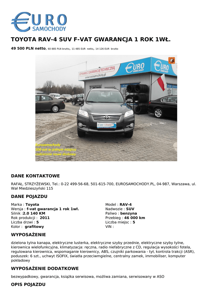 TOYOTA RAV-4 SUV F-VAT GWARANCJA 1 ROK 1WŁ. 49 500 PLN netto, 60 885 PLN brutto, 11 485 EUR netto, 14 126 EUR brutto DANE KONTAKTOWE RAFAŁ, STRZYŻEWSKI, Tel.: 0-22 499-56-68, 501-615-700, EUROSAMOCHODY.PL, 04-987, Warszawa, ul. Wał Miedzieszyński 115 DANE POJAZDU Marka : Toyota Wersja : f-vat gwarancja 1 rok 1wł. Silnik :2.0 140 KM Rok produkcji : 2011 Liczba drzwi : 5 Kolor : grafitowy Model : RAV-4 Nadwozie : SUV Paliwo : benzyna Przebieg : 46 000 km Liczba miejsc : 5 VIN : WYPOSAŻENIE dzielona tylna kanapa, elektryczne lusterka, elektryczne szyby przednie, elektryczne szyby tylne, kierownica wielofunkcyjna, klimatyzacja: ręczna, radio niefabryczne z CD, regulacja wysokości fotela, regulowana kierownica, wspomaganie kierownicy, ABS, czujniki parkowania - tył, kontrola trakcji (ASR), poduszek: 6 szt., uchwyt ISOFIX, światła przeciwmgielne, centralny zamek, immobiliser, komputer pokładowy WYPOSAŻENIE DODATKOWE bezwypadkowy, gwarancja, książka serwisowa, możliwa zamiana, serwisowany w ASO OPIS POJAZDU WITAMY W NAJWIĘKSZYM W POLSCE SALONIE SAMOCHODÓW UŻYWANYCH SUPER PROMOCJA GWARANCJA TECHNICZNA NA 12 MIESIĘCY lub KOMPLET OPON ZIMOWYCH lub LETNICH GRATIS*(do wyczerpania zapasów, możliwość rozszerzenia gwarancji do 36 miesięcy) - 500 AUT Z GWARANCJĄ w jednym miejscu / różne marki , modele , wersje wyposażenia/ - 8 dni na zamianę auta - Sprawdzone pochodzenie pojazdów - bezwypadkowe - Gwarancja przebiegu - Gwarancja pełnej historii serwisowej - Samochody od I właściciela - dla klientów zamiejscowych rezerwacja auta do czasu przyjazdu - udzielamy 12-miesięcznej gwarancji technicznej, możliwość przedłużenia do 36-miesięcy /bez limitu kilometrów, ważna na terenie całej Polski + assistance- darmowe holowanie , potwierdzenie certyfikatem / Kupującemu oferujemy: 1. Jazdę próbną 2. Bezpłatny przegląd przedsprzedażowy obejmujący: - kontrolę amortyzatorów - hamulców - podwozia samochodu - pomiar geometrii - diagnoza komputerowa - pomiar grubości powłoki lakierniczej - możliwość sprawdzenia przed zakupem w serwisie lub stacji diagnostycznej lub za pośrednictwem niezależnego rzeczoznawcy na zlecenie kupującego /dla klientów zamiejscowych bez konieczności przyjazdu/. - wszystkie nasze samochody posiadają komplet dokumentów wymaganych do zarejestrowania bądź przerejestrowania samochodu - przyjmujemy auta w rozliczeniu oraz kupujemy /bez ograniczeń wiekowych/ - Zajmujemy się sprzedażą detaliczną oraz hurtową / zapraszamy do współpracy osoby prywatne, firmy również z branży i instytucje / -Kupujący otrzymuje fakturę VAT 23% /nie ponosi opłaty PCC w wysokości 2%/ -kredyt 0% wpłaty własnej,raty dopasowane do własnych potrzeb -leasing bez zaświadczeń ,również dla widniejących w BIK szybka obsługa na miejscu "Niniejsze ogłoszenia są wyłącznie informacją handlową i nie stanowią oferty w myśl art. 66, § 1. Kodeksu Cywilnego. Sprzedający nie odpowiada za ewentualne błędy lub nieaktualność ogłoszenia." Zapis ten został zamieszczony ze względu na możliwość niezamierzonych pomyłek. Jeżeli zauważysz nieścisłość napisz do nas. Szukasz pewnego używanego auta ? Tylko u nas sprawdzone samochody z polskich salonów To nie komis to salon aut używanych z wieloletnim doświadczeniem Więcej informacji na eurosamochody . pl ZADZWOŃ TERAZ!!! Rafał 501 615 700 Tomasz 512 345 150 Marcin 505 416 300 Piotr 501 087 038 Mariusz 500 130 727 QR CODE DLA OGŁOSZENIA Powered by TCPDF (www.tcpdf.org)