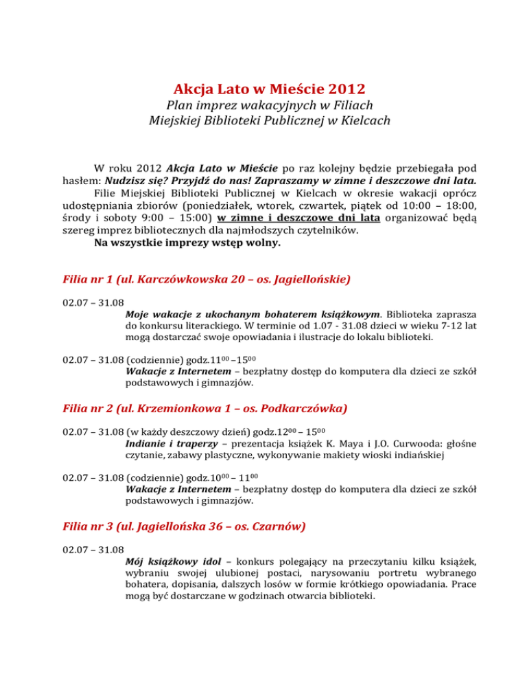 Akcja Lato w Mieście 2012 Plan imprez wakacyjnych w Filiach Miejskiej Biblioteki Publicznej w Kielcach W roku 2012 Akcja Lato w Mieście po raz kolejny będzie przebiegała pod hasłem: Nudzisz się? Przyjdź do nas! Zapraszamy w zimne i deszczowe dni lata. Filie Miejskiej Biblioteki Publicznej w Kielcach w okresie wakacji oprócz udostępniania zbiorów (poniedziałek, wtorek, czwartek, piątek od 10:00 – 18:00, środy i soboty 9:00 – 15:00) w zimne i deszczowe dni lata organizować będą szereg imprez bibliotecznych dla najmłodszych czytelników. Na wszystkie imprezy wstęp wolny. Filia nr 1 (ul. Karczówkowska 20 – os. Jagiellońskie) 02.07 – 31.08 Moje wakacje z ukochanym bohaterem książkowym. Biblioteka zaprasza do konkursu literackiego. W terminie od 1.07 - 31.08 dzieci w wieku 7-12 lat mogą dostarczać swoje opowiadania i ilustracje do lokalu biblioteki. 02.07 – 31.08 (codziennie) godz.1100 –1500 Wakacje z Internetem – bezpłatny dostęp do komputera dla dzieci ze szkół podstawowych i gimnazjów. Filia nr 2 (ul. Krzemionkowa 1 – os. Podkarczówka) 02.07 – 31.08 (w każdy deszczowy dzień) godz.1200 – 1500 Indianie i traperzy – prezentacja książek K. Maya i J.O. Curwooda: głośne czytanie, zabawy plastyczne, wykonywanie makiety wioski indiańskiej 02.07 – 31.08 (codziennie) godz.1000 – 1100 Wakacje z Internetem – bezpłatny dostęp do komputera dla dzieci ze szkół podstawowych i gimnazjów. Filia nr 3 (ul. Jagiellońska 36 – os. Czarnów) 02.07 – 31.08 Mój książkowy idol – konkurs polegający na przeczytaniu kilku książek, wybraniu swojej ulubionej postaci, narysowaniu portretu wybranego bohatera, dopisania, dalszych losów w formie krótkiego opowiadania. Prace mogą być dostarczane w godzinach otwarcia biblioteki. Filia nr 4 (ul. Romualda 3) 02.07 – 31.08 (codziennie) godz.1100 – 1600 Wakacje z Internetem – bezpłatny dostęp do komputera dla dzieci ze szkół podstawowych i gimnazjów. Filia nr 5 (ul. Warszawska 147 – os. Uroczysko) 02.07 (poniedziałek) godz.1200 - 1500 Na tropie skarbu templariuszy – gry i zabawy, konkursy literackie, zajęcia plastyczne. 09.07 (poniedziałek) godz.1200 - 1500 Bitwa pod Grunwaldem – gry i zabawy, konkursy literackie, zajęcia plastyczne. 16.07 (poniedziałek) godz.1200 - 1500 I ty możesz zostać Kawalerem Maltańskim – gry i zabawy, konkursy literackie, zajęcia plastyczne. 02.07 – 31.08 (codziennie w godzinach otwarcia biblioteki) Wakacje z Internetem – bezpłatny dostęp do komputera dla dzieci ze szkół podstawowych i gimnazjów. Filia nr 6 ( ul. Wikaryjska 1– Domaszowice) 02.07 – 12.07 (codziennie) godz.1300 – 1500 Wakacje z Internetem – bezpłatny dostęp do komputera dla dzieci ze szkół podstawowych i gimnazjów. Filia nr 7 (ul. Warszawska 9/11 - Centrum) 02.07 – 31.08 (wtorki i czwartki) godz.1000 – 1200 Wakacje z Internetem – bezpłatny dostęp do komputera dla dzieci ze szkół podstawowych i gimnazjów. Filia nr 8 (os. Barwinek 31) 02.07 – 30.08 Książka lata - Przez dwa miesiące w godzinach otwarcia biblioteki dzieci mogą wrzucać do specjalnie przygotowanej urny swoje propozycje na najlepszą książkę przeczytaną podczas wakacji. Podsumowanie plebiscytu 30 sierpnia. 02.07 – 31.08 (wtorki, czwartki) godz. 1100 – 1300 Łamigłówki i krzyżówki dla każdej mądrej główki - turniej gier planszowych, gry i zabawy literackie 02.07 – 31.08 (codziennie) godz. 1100 – 1400 Wakacje z Internetem – bezpłatny dostęp do komputera dla dzieci ze szkół podstawowych i gimnazjów. Filia nr 9 (ul. Okrzei 9 – Centrum) 02.07 – 31.08 (wtorki) godz. 1100 – 1400 W krainie baśni z różnych stron świata – głośne czytanie baśni, gry i zabawy literackie, bajkowe zagadki, zabawy plastyczne. 02.07 – 31.08 (poniedziałki, środy, czwartki, piątki) godz. 1100 – 1400 Planszolandia – możliwość korzystania z gier planszowych, zajęcia plastyczne. 02.07 – 31.08 Najpiękniejsza bajka lata - Przez dwa miesiące w godzinach otwarcia biblioteki dzieci mogą wrzucać do specjalnie przygotowanej urny swoje propozycje. Podsumowanie plebiscytu we wrześniu. 02.07 – 31.08 Mój ulubiony bohater z krainy baśni – konkurs plastyczny. Prace będą przyjmowane do końca sierpnia, a ogłoszenie wyników odbędzie się na początku września. 01.07 – 31.07 (poniedziałki, środy) godz. 1100 – 1300 Wakacje z Internetem – bezpłatny dostęp do komputera dla dzieci ze szkół podstawowych i gimnazjów. Filia nr 10 (ul. Konopnickiej 5 – os. Bocianek) 02.07 – 31.08 (czwartki) godz.1100 - 1300 Wesołe lato – gry planszowe, zgaduj–zgadule, układanie puzzli, głośne czytanie, zabawy plastyczne, kalambury. 02.07 – 31.08 (codziennie) godz. 1000 – 1400 Wakacje z Internetem – bezpłatny dostęp do komputera dla dzieci ze szkół podstawowych i gimnazjów. Filia nr 11 (ul. J. Nowaka Jeziorańskiego 53 – os. Świętokrzyskie) 02.07 – 31.08 (środy) godz.900 – 1030 Barwne czytanki w deszczowe poranki – spotkania dla dzieci w wieku 7–10 lat – głośne czytanie, zabawy plastyczne i ruchowe, kalambury, rebusy, gry planszowe. 02.07 – 31.08 (codziennie) godz.1000 – 1200 Wakacje z Internetem – bezpłatny dostęp do komputera dla dzieci ze szkół podstawowych i gimnazjów. Filia nr 12 (ul. Zagórska 60 – os. KSM) 02.07 – 25.08 Dziennik świętokrzyskich podróży – konkurs literacko – fotograficzny dla dzieci ze szkół podstawowych. Zgłoszenia do konkursu oraz szczegółowe informacje w godzinach otwarcia biblioteki do 25.08 Ogłoszenie wyników 31 sierpnia. Filia nr 13 (ul. Naruszewicza 25 – os. Pod Dalnią) 25.06 – 31.08 Wakacyjne safari po Kielcach i okolicach – konkurs na wykonanie najciekawszej tablicy zabytków. Dzieci, które zgłoszą się do uczestnictwa w Akcji Lato (od 25.06 do 02.07), otrzymają podstawowe informacje jak wykonać tablicę oraz kopertę z danymi zabytków i miejsc tajemniczych, kt