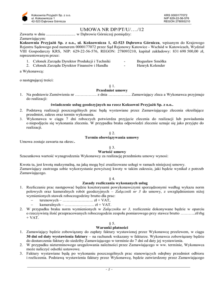 Koksownia Przyjaźń Sp. z o.o. ul. Koksownicza 1 42-523 Dąbrowa Górnicza ZAKŁADY KOKSOWNICZE PRZYJAŹŃ W DĄBROWIE GÓRNICZEJ KRS 0000177072 NIP 629-22-56-576 REGON 278093210 UMOWA NR DP/PT/U/…./12 Zawarta w dniu ............................. w Dąbrowie Górniczej pomiędzy: Zamawiającym: Koksownia Przyjaźń Sp. z o.o., ul. Koksownicza 1, 42-523 Dąbrowa Górnicza, wpisanym do Krajowego Rejestru Sądowego pod numerem 0000177072 przez Sąd Rejonowy Katowice - Wschód w Katowicach, Wydział VIII Gospodarczy KRS, NIP: 629-22-56-576, REGON: 278093210, kapitał zakładowy: 831 698 500,00 zł, reprezentowanym przez: 1. Członek Zarządu Dyrektor Produkcji i Techniki 2. Członek Zarządu Dyrektor Finansów i Handlu - Bogusław Smółka Henryk Kolender a Wykonawcą: o następującej treści: § 1. Przedmiot umowy 1. Na podstawie Zamówienia nr ……………. z dnia …………….. Zamawiający zleca a Wykonawca przyjmuje do realizacji: świadczenie usług geodezyjnych na rzecz Koksowni Przyjaźń Sp. z o.o.. 2. Podstawą realizacji poszczególnych prac będą wystawiane przez Zamawiającego zlecenia określające przedmiot, zakres oraz termin wykonania. 3. Wykonawca w ciągu 7 dni roboczych potwierdza przyjęcie zlecenia do realizacji lub powiadamia o niepodjęciu się wykonania zlecenia. W przypadku braku odpowiedzi zlecenie uznaje się jako przyjęte do realizacji. § 2. Termin obowiązywania umowy Umowa zostaje zawarta na okres:. § 3. Wartość umowy Szacunkowa wartość wynagrodzenia Wykonawcy za realizację przedmiotu umowy wynosi: Kwota ta, jest kwotą maksymalną, na jaką mogą być zrealizowane usługi w ramach niniejszej umowy. Zamawiający zastrzega sobie wykorzystanie powyższej kwoty w takim zakresie, jaki będzie wynikał z potrzeb Zamawiającego. § 4. Zasady rozliczania wykonanych usług 1. Rozliczanie prac następować będzie kosztorysami powykonawczymi sporządzonymi według wykazu norm polowych oraz kameralnych robót geodezyjnych – Załącznik nr 3 do umowy, z uwzględnieniem niżej wymienionych stawek roboczogodziny brutto dla prac: terenowych – ………………….. zł + VAT, kameralnych – …………………. zł + VAT. 2. W przypadku braku norm wymienionych w Załączniku nr 3, rozliczenie dokonywane będzie w oparciu o rzeczywistą ilość przepracowanych roboczogodzin zespołu pomiarowego przy stawce brutto ………..zł/rbg + VAT. § 5. Warunki płatności 1. Zamawiający będzie zobowiązany do zapłaty faktury wystawionej przez Wykonawcę przelewem, w ciągu 30 dni od daty wystawienia faktury na rachunek wskazany w fakturze. Wykonawca zobowiązany będzie do dostarczenia faktury do siedziby Zamawiającego w terminie do 7 dni od daty jej wystawienia. 2. W przypadku nieterminowego uregulowania należności przez Zamawiającego w ww. terminie, Wykonawca może naliczyć odsetki ustawowe. 3. Faktury wystawiane będą po wykonaniu poszczególnych prac stanowiących odrębny przedmiot odbioru i rozliczenia. Podstawą wystawienia faktury przez Wykonawcę, będzie zatwierdzony przez Zamawiającego -1- Koksownia Przyjaźń Sp. z o.o. ul. Koksownicza 1 42-523 Dąbrowa Górnicza KRS 0000177072 NIP 629-22-56-576 REGON 278093210 ZAKŁADY KOKSOWNICZE PRZYJAŹŃ W DĄBROWIE GÓRNICZEJ kosztorys powykonawczy Wykonawcy oraz protokół odbioru prac podpisany przez obie Strony. Faktura wystawiona będzie do 7 dni od daty wykonania usługi. 4. Zamawiający oświadcza, iż nie zezwala na przelewanie swoich zobowiązań wynikających z niniejszej umowy na osoby trzecie. Dopuszcza się zaistnienie takiej formy rozliczeń finansowych wyłącznie na mocy odrębnych ustaleń. 5. Strony oświadczają, że są czynnymi płatnikami podatku VAT. § 6. Obowiązki Wykonawcy 1. Wykonawca zabezpieczy we własnym zakresie urządzenia i przyrządy niezbędne do wykonania prac. 2. Wykonawca wykona prace zgodnie z uzgodnieniami z Zamawiającym oraz stosownymi normami i przepisami. 3. Zobowiązuje się do przestrzegania norm i przepisów wewnętrznych w zakresie porządkowym, bhp, przeciwpożarowym i ochrony środowiska obowiązujących na terenie Koksowni Przyjaźń Sp. z o.o., a w szczególności nw. Zarządzeń Prezesa Zarządu Koksowni Przyjaźń Sp. z o.o.: Nr 82/04 w sprawie zasad i trybu funkcjonowania systemu przepustkowego w ruchu rzeczowych składników majątkowych, Nr 134/04 w sprawie znaków i sygnałów bezpieczeństwa, Nr 12/05 w sprawie wprowadzenia ogólnej instrukcji bezpieczeństwa i higieny pracy obowiązującej w Koksowni Przyjaźń Sp. z o.o., Nr 21/06 w sprawie zasad i trybu funkcjonowania systemu przepustkowego dla ruchu osobowego, Nr 23/08 w sprawie bezpieczeństwa i ochrony zdrowia pracowników firm zewnętrznych wykonujących prace na terenie Koksowni Przyjaźń Sp. z o.o., Nr 23/10 w sprawie ochrony przeciwpożarowej, Nr 16/11 w sprawie ochrony zdrowia przed następstwami używania tytoniu i wyrobów tytoniowych. Wykonawca zobowiązany jest do zapoznania się z treścią ww. zarządzeń. 4. Wykonawca wystąpi do Zamawiającego przed rozpoczęciem prac na terenie Koksowni o wydanie przepustek tymczasowych dla pojazdów i pracowników, a po zakończeniu prac na terenie Koksowni zwróci wszystkie posiadane przepustki do organu wydającego. 5. Pracownicy Wykonawcy oraz inne osoby, które Wykonawca zatrudnia na terenie Koksowni zobowiązani są do przestrzegania zasad bezpieczeństwa i higieny pracy, wynikających z przepisów prawa oraz zasad ujętych w Załączniku nr 1 do niniejszej umowy pn. „Dokument standardów bezpieczeństwa dla Podwykonawcy”, którego zapisy stosuje się do nich odpowiednio. 6. Pracownicy Wykonawcy oraz inne osoby, które Wykonawca zatrudnia na terenie Koksowni Przyjaźń Sp z o.o., zobowiązani są do posiadania przy sobie w trakcie wykonywania pracy na terenie Koksowni paszportów bezpieczeństwa i okazywania ich na żądanie uprawnionych do kontroli pracowników Zamawiającego. Brak paszportów bezpieczeństwa może skutkow