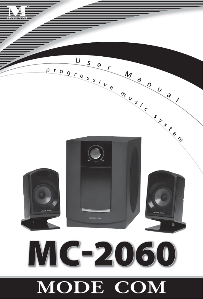 U s e r p r o g r e s s i v e M m u a s i n u a l c s y s t e m MC-2060 1 PROGRESSIVE MUSIC SYSTEM MC-2060 INTRODUCTION OF THE PRODUCT Thank you for choosing the MC-2060 Progressive Music System. The advanced technology of MC -2060 set and its functionality are the characteristics which will be noticed by every User. MC-2020 set contains a subwoofer with an amplifier and two satellites. What is important in this speaker set is the great harmony between satellites and an amplifier. Thanks to that the Dynamic Bass Boost effect is achieved MC-2060 has an extraordinary design. It is compatible with all sound cards, MP3 players, notebooks etc. MC 2060 provide great functionality since you can fully regulate the volume. Mode Com takes care about the quality of its products not only by fulfilling, but also by forecasting its clients expectations. Mode Com products users are used to high quality, advanced technology, reliability and functionality. We make our exceptional products especially for YOU. We reserve the right to update all the included information. Choose better future – choose Mode Com! Copyright©2006 Mode Com Ltd. All rights reserved. Mode Com Logo is a registered trademark of Mode Com Ltd. 2 www.modecom.eu COMPUTER VCD/DVD MP3 CD CONNECTION (AS DIAGRAM) 1. Connect the sateliite’s Audio cable to Audio Output L/R on the woofer’s rear panel separately. Put the left satellite speaker on the left, and the right on the right. 2. Connect the 2×RCA end of the Signal cable to the “Audio Input” L/R sockets on the back of the Subwoofer, and the 3.5mm end of the signal cable to the PC soundcard or to the appropriate audio output sockets of any other stereo audio source. 3. Make sure all the cable are connected correctly, then connect the power cord to AC power. FEATURES: • Magnetic shielding • 5.25” super bass driver aerodynamic design • Professional designed amplifier • V type satellite driver produces crystal clear sound • Works perfectly with PC sound cards, portable audio players, MP3 players, laptop computers and two channel audio source. USAGE: 1. Turn the VOLUME and BASS control anticlockwise to minimum. 2. Play a music program by adjusting the volume and bass control to your demanding level. SPECIFICATION: • Power Output: 12W x 2+16W RMS • Frequency Response: 35Hz—20 kHz • Harmonic Distortion: 0.3% 1W 1kHz • S/N: >80dB • Separation: >45dB • Speaker: Subwoofer 5.25” • Satellite 2.5” x 2 3 CAUTION: 1. Don't put the system in high temperature or humid environment, avoid water and strong shock. 2. Don't open the cabinet to avoid electric shock or other accident. In case of damage, please ask for professional help. 3. In case of fragment or liquid fallen into the cabinet, please cut off the power and ask for professional help. 4. When using high output signal, please don’t turn the volume to maximum to avoid distortion. 5. In case of long time not using, please plug off the power plug. 6. For indoor use only. INSIDE PACKAGE: • Subwoofer Speaker – 1pc • Satellite Speaker – 1pc • Audio Cable – 1pc • User’s Manual ENVIRONMENT PROTECTION: This symbol on our product nameplates proves its compatibility with the EU Directive2002/96 concerning proper disposal of waste electric and electronic equipment (WEEE). By using the appropriate disposal systems you prevent the potential negative consequences of wrong product take-back that can pose risks to the environment and human health. The symbol indicates that this product must not be disposed of with your other waste. You must hand it over to a designated collection point for the recycling of electrical and electronic equipment waste. The disposal of the product should obey all the specific Community waste management legislations. Contact your local city office, your waste disposal service or the place of purchase for more information on the collection. Weight of the device: 5,2 kg 4 www.modecom.eu PROGRESSIVE MUSIC SYSTEM MC-2060 1. OPIS PRODUKTU Dziękujemy za wybór wysokiej jakości zestawu głośników MC-2060. Zaawansowana technologia zestawu MC-2060 oraz jego funkcjonalność są cechami, na które zwróci uwagę każdy Użytkownik. MC-2060 zbudowany jest z podzespołów: subwoofera z wbudowanym, aktywnym wzmacniaczem oraz z dwoma zespołami satelitarnymi. To, co warte podkreślenia, to doskonale dopasowane do właściwości systemu głośniki, wzmacniacz oraz satelity. Dzięki nim czystemu dźwiękowi towarzyszy efekt Dynamic Bass Boost. Zestaw MC-2060 jest niepowtarzalny ze względu na nowoczesne wzornictwo. Możliwość doskonałej współpracy z kartami muzycznymi, przenośnymi odtwarzaczami MP3, notebookami oraz dwukanałowymi źródłami dźwięku jest dodatkowym atutem zestawu. Funkcjonalność MC-2060 zapewniona jest także przez pełną regulację głośności. Mode Com dba o jakość swoich wyrobów, by nie tylko spełniać, ale i wyprzedzać oczekiwania swoich Klientów. Zaprojektowany w oparciu o nowoczesną myśl i technologię, doskonale pasuje do współczesnego środowiska. Przyzwyczailiśmy Użytkowników do wysokiej jakości naszych produktów, ich zaawansowanej technologii oraz niezawodności i funkcjonalności. Dla Państwa tworzymy rzeczy wyjątkowe pod każdym względem! Zastrzegamy sobie prawo do aktualizacji wszelkich informacji w niej zawartych. Wybierz lepszą przyszłość – wybierz Mode Com! Copyright©2006 Mode Com Ltd. Wszelkie prawa zastrzeżone. Logo Mode Com jest zastrzeżonym znakiem towarowym firmy Mode Com Ltd. 5 KOMPUTER VCD/DVD MP3 CD PODŁĄCZENIE (JAK NA SCHEMACIE) 1. Podłącz obie satelity do gniazda “Audio Output” na tyle głośnika niskotonowego i ustaw głośnik L (Left) po lewej stronie a R (Right) po prawej. 2. Podłącz 3.5mm zieloną wtyczkę stereo z pilota zdalnego sterowania do wyjścia audio karty dźwiękowej (najczęściej opisanego jako „LINE OUT”). 3. Sprawdź połączenia i upewnij się, że wszystkie przewody został
