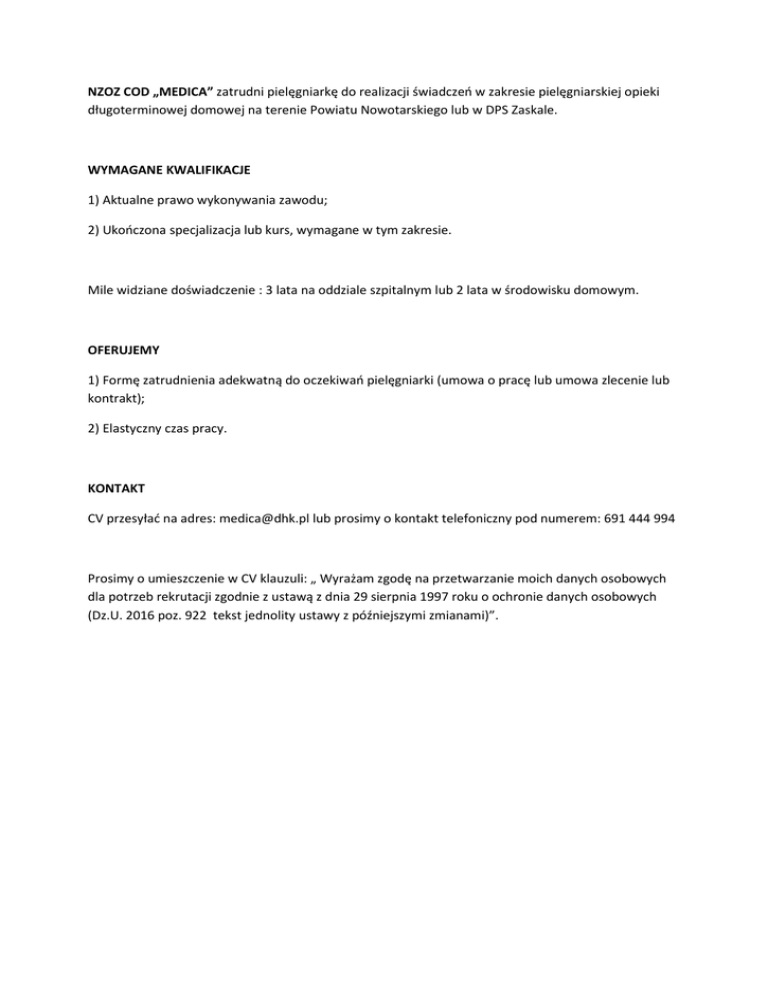 NZOZ COD „MEDICA” zatrudni pielęgniarkę do realizacji świadczeń w zakresie pielęgniarskiej opieki długoterminowej domowej na terenie Powiatu Nowotarskiego lub w DPS Zaskale. WYMAGANE KWALIFIKACJE 1) Aktualne prawo wykonywania zawodu; 2) Ukończona specjalizacja lub kurs, wymagane w tym zakresie. Mile widziane doświadczenie : 3 lata na oddziale szpitalnym lub 2 lata w środowisku domowym. OFERUJEMY 1) Formę zatrudnienia adekwatną do oczekiwań pielęgniarki (umowa o pracę lub umowa zlecenie lub kontrakt); 2) Elastyczny czas pracy. KONTAKT CV przesyłać na adres: [email protected] lub prosimy o kontakt telefoniczny pod numerem: 691 444 994 Prosimy o umieszczenie w CV klauzuli: „ Wyrażam zgodę na przetwarzanie moich danych osobowych dla potrzeb rekrutacji zgodnie z ustawą z dnia 29 sierpnia 1997 roku o ochronie danych osobowych (Dz.U. 2016 poz. 922 tekst jednolity ustawy z późniejszymi zmianami)”.