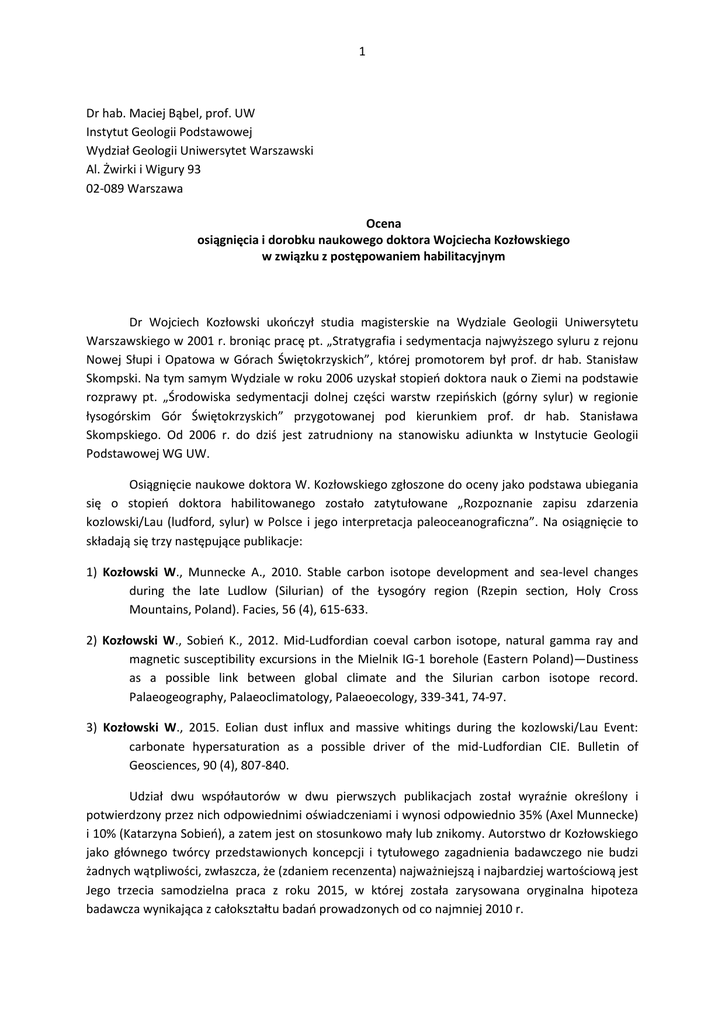 1 Dr hab. Maciej Bąbel, prof. UW Instytut Geologii Podstawowej Wydział Geologii Uniwersytet Warszawski Al. Żwirki i Wigury 93 02-089 Warszawa Ocena osiągnięcia i dorobku naukowego doktora Wojciecha Kozłowskiego w związku z postępowaniem habilitacyjnym Dr Wojciech Kozłowski ukończył studia magisterskie na Wydziale Geologii Uniwersytetu Warszawskiego w 2001 r. broniąc pracę pt. „Stratygrafia i sedymentacja najwyższego syluru z rejonu Nowej Słupi i Opatowa w Górach Świętokrzyskich”, której promotorem był prof. dr hab. Stanisław Skompski. Na tym samym Wydziale w roku 2006 uzyskał stopień doktora nauk o Ziemi na podstawie rozprawy pt. „Środowiska sedymentacji dolnej części warstw rzepińskich (górny sylur) w regionie łysogórskim Gór Świętokrzyskich” przygotowanej pod kierunkiem prof. dr hab. Stanisława Skompskiego. Od 2006 r. do dziś jest zatrudniony na stanowisku adiunkta w Instytucie Geologii Podstawowej WG UW. Osiągnięcie naukowe doktora W. Kozłowskiego zgłoszone do oceny jako podstawa ubiegania się o stopień doktora habilitowanego zostało zatytułowane „Rozpoznanie zapisu zdarzenia kozlowski/Lau (ludford, sylur) w Polsce i jego interpretacja paleoceanograficzna”. Na osiągnięcie to składają się trzy następujące publikacje: 1) Kozłowski W., Munnecke A., 2010. Stable carbon isotope development and sea-level changes during the late Ludlow (Silurian) of the Łysogóry region (Rzepin section, Holy Cross Mountains, Poland). Facies, 56 (4), 615-633. 2) Kozłowski W., Sobień K., 2012. Mid-Ludfordian coeval carbon isotope, natural gamma ray and magnetic susceptibility excursions in the Mielnik IG-1 borehole (Eastern Poland)—Dustiness as a possible link between global climate and the Silurian carbon isotope record. Palaeogeography, Palaeoclimatology, Palaeoecology, 339-341, 74-97. 3) Kozłowski W., 2015. Eolian dust influx and massive whitings during the kozlowski/Lau Event: carbonate hypersaturation as a possible driver of the mid-Ludfordian CIE. Bulletin of Geosciences, 90 (4), 807-840. Udział dwu współautorów w dwu pierwszych publikacjach został wyraźnie określony i potwierdzony przez nich odpowiednimi oświadczeniami i wynosi odpowiednio 35% (Axel Munnecke) i 10% (Katarzyna Sobień), a zatem jest on stosunkowo mały lub znikomy. Autorstwo dr Kozłowskiego jako głównego twórcy przedstawionych koncepcji i tytułowego zagadnienia badawczego nie budzi żadnych wątpliwości, zwłaszcza, że (zdaniem recenzenta) najważniejszą i najbardziej wartościową jest Jego trzecia samodzielna praca z roku 2015, w której została zarysowana oryginalna hipoteza badawcza wynikająca z całokształtu badań prowadzonych od co najmniej 2010 r. 2 Habilitacyjne osiągnięcie badawcze dotyczy tzw. zdarzenia izotopowego Lau, jednego z najwyższych dodatnich skokowych wzrostów w zapisie zmienności izotopów węgla δ13C w morskich osadach fanerozoiku. Zdarzenie to, stowarzyszone z kryzysem rozwoju fauny graptolitowej (zdarzenie kozlowski), miało miejsce w późnym sylurze (w ludfordzie) i budzi uzasadnione zainteresowanie oraz liczne kontrowersje. Cykl prac poświęcony jest analizie zapisu tego ludfordzkiego zdarzenia w dwu profilach z terenu Polski: w odsłonięciu w Rzepinie w Górach Świętokrzyskich i w wierceniu Mielnik IG-1 na Podlasiu, oraz jest próbą rekonstrukcji wyjątkowych warunków sedymentacji panujących podczas opisanego zdarzenia. W pierwszej z cyklu trzech prac (Kozłowski i Munnecke 2010) rozpoznano obecność izotopowego zdarzenia Lau w profilu Rzepin (po raz pierwszy na terenie Polski) i dokonano próby zintegrowanej korelacji chemostratygraficznej i korelacji opartej o stratygrafię sekwencji z „chemostratotypowym” obszarem na Gotlandii, gdzie zdarzenie to zostało po raz pierwszy opisane i zdefiniowane. W drugiej pracy (Kozłowski i Sobień 2012) zanalizowano zapis izotopowy zdarzenia Lau, zapis podatności magnetycznej oraz promieniowania naturalnego gamma, mikrofacje i cechy petrologiczne osadu w profilu ludfordu w dobrze udokumentowanym biostratygraficznie wierceniu Mielnik IG-1. W pracy tej sformułowano tezę o eolicznym pochodzeniu pyłu dolomitowego rozpoznanego w badanym interwale stratygraficznym. Tezę tę rozbudowano w następnej pracy. Przedstawiono hipotetyczny model depozycji zakładający generowaną przez ewaporację antyestuariową cyrkulację we wczesnej fazie transgresji w klimacie suchym. Praca trzecia (Kozłowski 2015) ma charakter monografii i zawiera obszerne omówienie wielu różnorodnych zagadnień sedymentologicznych, paleoklimatycznych, oraz hydro- i biochemicznych związanych z funkcjonowaniem mórz sylurskich podczas zdarzenia Lau. Publikacja zawiera obszerną część analityczną poświeconą bardziej szczegółowej analizie mikrofacjalnej, petrologicznej i geochemicznej (izotopowej) interwału ze zdarzeniem Lau w wierceniu Mielnik IG-1. W tej samodzielnej pracy zastosowano zintegrowane techniki badań petrologicznych: obserwacje barwionych (w celu odróżnienia kalcytu i dolomitu) płytek cienkich w mikroskopie optycznym i elektronowym mikroskopie skaningowym. Opracowano i zastosowano oryginalną nowatorską metodę separacji dolomitu do badań izotopowych – dokładniejszą niż dotychczas stosowane metody. Pozwoliło to na uzyskanie bardziej wiarygodnych oddzielnych krzywych zawartości izotopów węgla δ13C dla eolicznego pyłu dolomitowego i autigenicznego kalcytu w obrębie badanego interwału. Przeprowadzono analizę statystyczną rozmiarów framboidów pirytowych i uzasadniono pogląd, że wytrąciły się one w toni wodnej i świadczą o warunkach euksynicznych panujących ponad dnem morskim w czasie zdarzenia Lau. Rozpoznano osobliwe ziarna kalcytowe i agregaty kalcytu o cechach wskazujących na ich wytrącenie w toni wodnej, a także na jej powierzchni. Liczne wstępowanie tych ziaren w profilu (w towarzystwie eolicznego dolomitu) zinterpretowano jako produkt masoweg