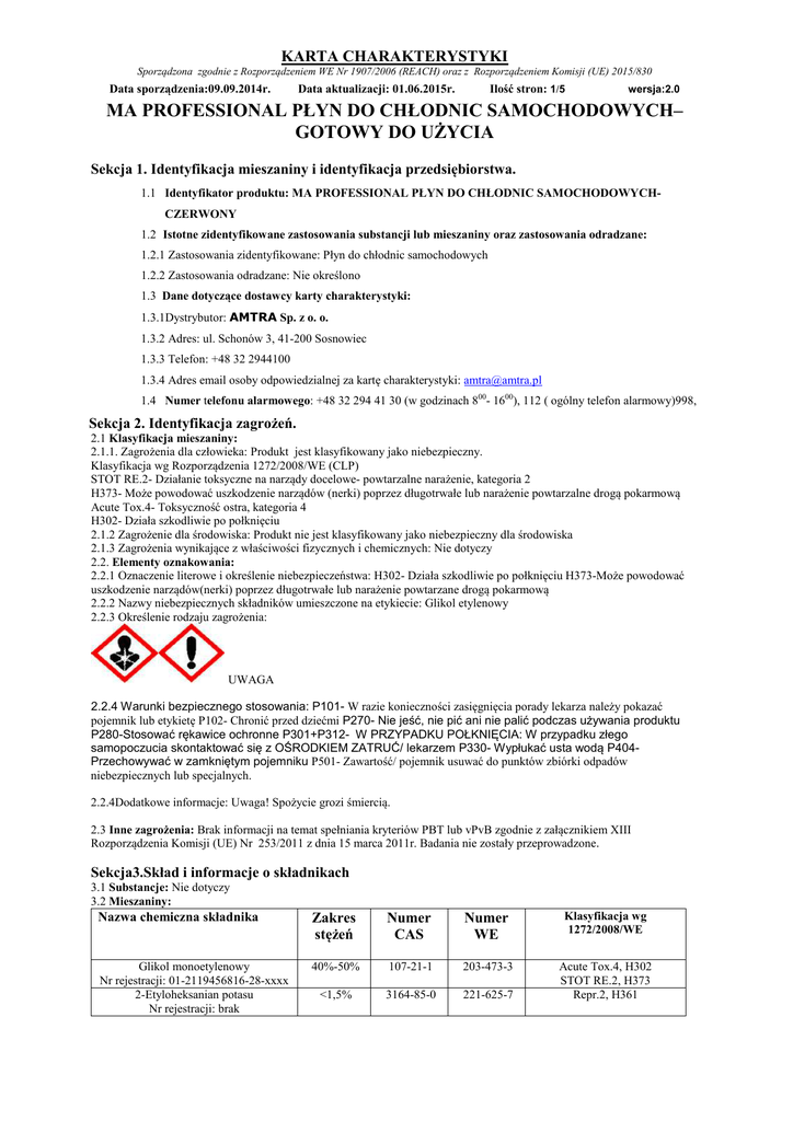 KARTA CHARAKTERYSTYKI Sporządzona zgodnie z Rozporządzeniem WE Nr 1907/2006 (REACH) oraz z Rozporządzeniem Komisji (UE) 2015/830 Data sporządzenia:09.09.2014r. Data aktualizacji: 01.06.2015r. Ilość stron: 1/5 wersja:2.0 MA PROFESSIONAL PŁYN DO CHŁODNIC SAMOCHODOWYCH– GOTOWY DO UŻYCIA Sekcja 1. Identyfikacja mieszaniny i identyfikacja przedsiębiorstwa. 1.1 Identyfikator produktu: MA PROFESSIONAL PŁYN DO CHŁODNIC SAMOCHODOWYCHCZERWONY 1.2 Istotne zidentyfikowane zastosowania substancji lub mieszaniny oraz zastosowania odradzane: 1.2.1 Zastosowania zidentyfikowane: Płyn do chłodnic samochodowych 1.2.2 Zastosowania odradzane: Nie określono 1.3 Dane dotyczące dostawcy karty charakterystyki: 1.3.1Dystrybutor: AMTRA Sp. z o. o. 1.3.2 Adres: ul. Schonów 3, 41-200 Sosnowiec 1.3.3 Telefon: +48 32 2944100 1.3.4 Adres email osoby odpowiedzialnej za kartę charakterystyki: [email protected] 1.4 Numer telefonu alarmowego: +48 32 294 41 30 (w godzinach 800- 1600), 112 ( ogólny telefon alarmowy)998, Sekcja 2. Identyfikacja zagrożeń. 2.1 Klasyfikacja mieszaniny: 2.1.1. Zagrożenia dla człowieka: Produkt jest klasyfikowany jako niebezpieczny. Klasyfikacja wg Rozporządzenia 1272/2008/WE (CLP) STOT RE.2- Działanie toksyczne na narządy docelowe- powtarzalne narażenie, kategoria 2 H373- Może powodować uszkodzenie narządów (nerki) poprzez długotrwałe lub narażenie powtarzalne drogą pokarmową Acute Tox.4- Toksyczność ostra, kategoria 4 H302- Działa szkodliwie po połknięciu 2.1.2 Zagrożenie dla środowiska: Produkt nie jest klasyfikowany jako niebezpieczny dla środowiska 2.1.3 Zagrożenia wynikające z właściwości fizycznych i chemicznych: Nie dotyczy 2.2. Elementy oznakowania: 2.2.1 Oznaczenie literowe i określenie niebezpieczeństwa: H302- Działa szkodliwie po połknięciu H373-Może powodować uszkodzenie narządów(nerki) poprzez długotrwałe lub narażenie powtarzane drogą pokarmową 2.2.2 Nazwy niebezpiecznych składników umieszczone na etykiecie: Glikol etylenowy 2.2.3 Określenie rodzaju zagrożenia: UWAGA 2.2.4 Warunki bezpiecznego stosowania: P101- W razie konieczności zasięgnięcia porady lekarza należy pokazać pojemnik lub etykietę P102- Chronić przed dziećmi P270- Nie jeść, nie pić ani nie palić podczas używania produktu P280-Stosować rękawice ochronne P301+P312- W PRZYPADKU POŁKNIĘCIA: W przypadku złego samopoczucia skontaktować się z OŚRODKIEM ZATRUĆ/ lekarzem P330- Wypłukać usta wodą P404Przechowywać w zamkniętym pojemniku P501- Zawartość/ pojemnik usuwać do punktów zbiórki odpadów niebezpiecznych lub specjalnych. 2.2.4Dodatkowe informacje: Uwaga! Spożycie grozi śmiercią. 2.3 Inne zagrożenia: Brak informacji na temat spełniania kryteriów PBT lub vPvB zgodnie z załącznikiem XIII Rozporządzenia Komisji (UE) Nr 253/2011 z dnia 15 marca 2011r. Badania nie zostały przeprowadzone. Sekcja3.Skład i informacje o składnikach 3.1 Substancje: Nie dotyczy 3.2 Mieszaniny: Nazwa chemiczna składnika Zakres stężeń Numer CAS Numer WE Klasyfikacja wg 1272/2008/WE Glikol monoetylenowy Nr rejestracji: 01-2119456816-28-xxxx 2-Etyloheksanian potasu Nr rejestracji: brak 40%-50% 107-21-1 203-473-3 <1,5% 3164-85-0 221-625-7 Acute Tox.4, H302 STOT RE.2, H373 Repr.2, H361 KARTA CHARAKTERYSTYKI Sporządzona zgodnie z Rozporządzeniem WE Nr 1907/2006 (REACH) oraz z Rozporządzeniem Komisji (UE) 2015/830 Data sporządzenia:09.09.2014r. Data aktualizacji: 01.06.2015r. Ilość stron: 2/5 wersja:2.0 MA PROFESSIONAL PŁYN DO CHŁODNIC SAMOCHODOWYCH– GOTOWY DO UŻYCIA SEKCJA 4. ŚRODKI PIERWSZEJ POMOCY 4.1 Opis środków pierwszej pomocy: 4.1.1 Połknięcie: Nie wywoływać wymiotów. Wypłukać usta wodą. Nigdy nie podawać niczego do ust osobie nieprzytomnej. Wezwać lekarza, pokazać opakowanie lub etykietę. 4.1.2. Zatrucie inhalacyjne: Skonsultować się z lekarzem, w razie wystąpienia niepokojących dolegliwości. Wyprowadzić poszkodowanego na świeże powietrze, zapewnić ciepło i spokój. 4.1.3. Skażenie skóry: Zdjąć skażoną odzież. Narażone partie skóry zmyć dokładnie wodą z mydłem. Skonsultować się z lekarzem w przypadku wystąpienia niepokojących objawów. 4.1.4.Skażenie oczu: Chronić niepodrażnione oko, wyjąć szkła kontaktowe. Zanieczyszczone oczy przepłukać dokładnie wodą przez kilka minut. Unikać silnego strumienia wody – ryzyko uszkodzenia rogówki. Skonsultować się z lekarzem okulistą w przypadku wystąpienia niepokojących objawów. 4.2 Najważniejsze ostre i opóźnione objawy oraz skutki narażenia: 4.2.1 Skażenie oczu: Może wystąpić podrażnienie, zaczerwienienie oraz łzawienie 4.2.2 Połknięcie: Mogą pojawić się mdłości, wymioty, ból głowy, zaburzenia równowagi i koordynacji, senność 4.4.3 Skóra: Może wystąpić zaczerwienienie, wysuszenie i pękanie skóry 4.3 Wskazania dotyczące wszelkiej natychmiastowej pomocy lekarskiej i szczególnego postępowania z poszkodowanym: Podjąć leczenie objawowe. Decyzję o sposobie postępowanie ratunkowego podejmuje lekarz po dokładnej ocenie stanu poszkodowanego. SEKCJA 5. POSTĘPOWANIE W PRZYPADKU POŻARU 5.1 Środki gaśnicze: 5.1.1 Odpowiednie środki gaśnicze: Stosować proszek gaśniczy, CO2, woda-prądy rozproszone, pianę odporną na alkohol 5.1.2 Niewłaściwe środki gaśnicze: Woda- zwarty strumień wody 5.2 Szczególne zagrożenia związane z mieszaniną: Podczas spalania mogą tworzyć się toksyczne spaliny zawierające tlenki węgla. Unikać wdychania produktów spalania, mogą stwarzać zagrożenie dla zdrowia. 5.3 Informacje dla straży pożarnej: Stosować standardowe metody gaszenia pożarów chemicznych. Zbiorniki narażone na działanie wysokiej temperatury chłodzić wodą i w miarę możliwości usunąć z zagrożonego obszaru. Opary alkoholu strącić rozproszonymi strumieniami wody. Strażaków wyposażyć w ubrania odporne na działanie wysokich temperatur. Niezależne aparaty izolujące drogi 