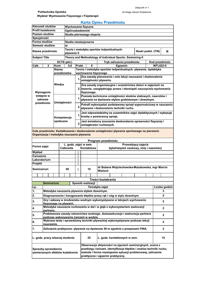 Załącznik nr 1 Politechnika Opolska Wydział Wychowania Fizycznego i Fizjoterapii do Księgi Jakości Kształcenia Karta Opisu Przedmiotu Kierunek studiów Profil kształcenia Poziom studiów Specjalność Forma studiów Semestr studiów Wychowanie fizyczne Ogólnoakademicki Studia pierwszego stopnia Studia niestacjonarne IV Teoria i metodyka sportów indywidualnych: pływanie II Nazwa przedmiotu Subject Title Całk. 2 N Theory and Methodology of Individual Sports: Swimming II ECTS (pkt.) Kont. 0,6 Nazwy przedmiotów Tryb zaliczenia przedmiotu Kod przedmiotu Prakt. 0 Egzamin WFL022-II Teoria i metodyka sportów indywidualnych: pływanie; dydaktyka wychowania fizycznego Zna zasady planowania i cele lekcji nauczania i doskonalenia 1. umiejętności pływania. Wiedza Wymagania wstępne w zakresie przedmiotu Nauki podst. (T/N) Umiejętności Kompetencje społeczne Zna zasady organizacyjne i uczestnictwa dzieci w zajęciach na 2. basenie, uwzględniając prawa i obowiązki nauczyciela wychowania fizycznego. Posiada techniczne umiejętności skoków statowych, nawrotów i 1. pływania na dystansie stylem grzbietowym i dowolnym. Potrafi wykorzystać podstawowy sprzęt wypornościowy w nauczaniu 2. pływania i doskonaleniu techniki ruchu. Jest odpowiedzialny za uczestników zajęć dydaktycznych i wykazuje 1. troskę o powierzony sprzęt. Jest świadomy znaczenia doskonalenia sprawności fizycznej i 2. umiejętności ruchowych. Cele przedmiotu: Kształtowanie i doskonalenie umiejętności pływania sportowego na piersiach. Organizacja i metodyka nauczania pływania. Program przedmiotu Forma zajęć L. godz. zajęć w sem. Całkowita Kontaktowa Wykład Ćwiczenia Laboratorium Projekt Seminarium Prowadzący zajęcia (tytuł/stopień naukowy, imię i nazwisko) | | | | 50 | 15 dr Bożena Wojciechowska-Maszkowska, mgr Marcin Wieloch Treści kształcenia Lp. 1. Sposób realizacji Tematyka zajęć Metodyka nauczania pływania stylem dowolnym. 2. Diagnozowanie i korygowanie błędów pracy rąk i nóg w stylu dowolnym Seminarium 3. 4. 5. 6. 7. Gry i zabawy w środowisku wodnym wykorzystywane w lekcjach wychowania fizycznego na pływalni. Metodyka nauczania nurkowania w dal i w głąb z wykorzystaniem asekuracji partnera. Podstawowe zasady ratownictwa wodnego. Autoasekuracja i asekuracja partnera podczas wykonywania ćwiczeń w wodzie. Wybrane testy i sprawdziany techniki pływackiej wykorzystywane podczas lekcji nauczania. Zaliczenie praktyczne: pływanie na dystansie 50 m zgodnie z przepisami FINA. L. godz. pracy własnej studenta Sposoby sprawdzenia zamierzonych efektów kształcenia 35 L. godz. kontaktowych w sem. Liczba godzin 3 2 2 2 2 2 2 15 Obserwacja aktywności na zjęciach seminaryjnych, ocena z przebiegu ćwiczeń, identyfikacja błędów i analiza techniki ruchu, metoda i forma rozwiązania sytuacji problemowej, zaliczenie praktyczne i egzamin praktyczny. Wiedza Ma wiedzę o metodach i formach prowadzenia zajęć 1. sportowych i rekreacyjnych w wodzie oraz o procesie kontroli. Ma wiedzę o zasadach naboru i selekcji dzieci do sportu pływackiego. Posiada techniczne umiejętności skoków startowych, 1. nawrotów i pływania na dystansie stylem dowolnym. Potrafi zastosować podstawowy sprzęt w doskonaleniu 2. techniki pływania wszystkimi stylami. Umie ocenić ułożenie ciała w wodzie i techniczne 3. umiejętności pływania w oparciu o podstawowe testy i metody kontroli oraz dokonać ich interpretacji i korekcji. 2. Efekty kształcenia dla przedmiotu - po zakończonym cyklu kształcenia Umiejętności Potrafi zademonstrować i wyjaśnić technikę sportową pływania i stosuje poprawną terminologię. Ma świadomość o ewolucji pływania i o konieczności 1. podnoszenia swoich kompetencji w zakresie wiedzy i umiejetności. 4 Kompetencje społeczne W grupie komunikuje się w sposób zrozumiały i zwraca 2. uwagę na współćwiczacych. Indywidualnie akcentuje pozytywne uwagi i dowartościowuje uczestników zajęć. Metody dydaktyczne: 1) Podająca: wykład, opis, dyskusja, objaśnienie. 2) Problemowa: aktywizujaca - dyskusja. 3) Praktyczna: pokaz, ćwiczenia Forma i warunki zaliczenia przedmiotu: Obecność, przygotowanie i aktywność na zajęciach, przestrzeganie zasad bezpieczeństwa i zaliczenie praktyczne - pływanie sportowe zgodnie z obowiązującymi przepisami FINA (start, nawroty, zakończenie dystansu, pływanie na dystansie) Literatura podstawowa: [1] Czabański B., Fiłon M., Zatoń K.: Elementy teorii pływania. Wyd. IV poprawione. Wyd. Skryptowe AWF, Wrocław 2003. [2] Owczarek S.: Korekcja wad postawy. Pływanie i ćwiczenia w wodzie, Warszawa 1999. [3] Przepisy FINA i PZP (www.polswim.pl) [4] Urantówka J., Wieloch M., Wojciechowska-Maszkowska B.: Nauka Pływania. Atlas Ćwiczeń. Politechnika Opolska, Wydawnictwo Świętego Krzyża w Opolu, Opole 2009. Literatura uzupełniająca: [1] Bartkowiak E., Witkowski M.: Nauczanie pływania- podstawy bezpieczeństwa w wodzie. Młodzieżowa Agencja Wydawnicza, Warszawa 1986. [2] Czabański B.: Proces nauczania i uczenia się techniki sportowej, a podstawy wykształcenia ogólnego. Zeszyty Naukowe AWF, nr 50, Wrocław 1989. [3] Dybińska E. Wójcik A.: Wskazówki metodyczne do nauczania pływania, Wydawnictwo Skryptowe, nr 118, 1996 [4] Fiłon M.:Badania pływalności ciała ludzkiego. (W:) I Konferencja nt. Metody w wychowaniu fizycznym i sporcie. Monografie AWF, Poznań 1978. [5] Iwanowski W.: Pływanie korekcyjno – lecznicze w przypadkach bocznych skrzywień kręgosłupa, Szczecin 1999. [6] Wiesner W.: Naucz pływać swoje dziecko, AWF we Wrocławiu, Wrocław 1992 a [7] 23. Wiesner W. (1999c). Nauczanie- uczenie się pływać, AWF we Wrocławiu, Wrocław 1999 c ______________ * niewłaściwe przekreślić ………………………………………………….. ………………………………………………………. (kierownik jednostki organizacyjnej/bezpośredni przełożony: (Dziekan Wydziału pieczęć/podpis 