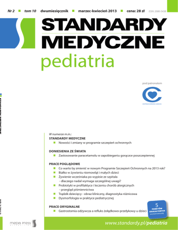 Nr 2 tom 10 dwumiesięcznik marzec-kwiecień 2013 cena: 28 zł ISSN: 2080-5438 pediatria pod patronatem CENTRUM ZDROWIA DZIECKA W numerze m.in.: STANDARDY MEDYCZNE Nowości i zmiany w programie szczepień ochronnych DONIESIENIA ZE ŚWIATA Zastosowanie paracetamolu w zapobieganiu gorączce poszczepiennej PRACE POGLĄDOWE Co warto by zmienić w nowym Programie Szczepień Ochronnych na 2013 rok? Białko w żywieniu niemowląt i małych dzieci Żywienie wcześniaka po wypisie ze szpitala - dlaczego nadal wymaga szczególnej uwagi? Probiotyki w profilaktyce i leczeniu chorób alergicznych - przegląd piśmiennictwa Trądzik dziecięcy - obraz kliniczny, diagnostyka różnicowa Dysmorfologia w praktyce pediatrycznej PRACE ORYGINALNE Gastrostomia odżywcza a refluks żołądkowo-przełykowy u dzieci 5 za prenumeratę www.standardy.pl/pediatria