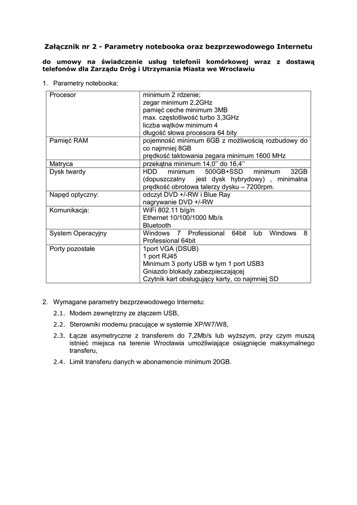 Załącznik nr 2 - Parametry notebooka oraz bezprzewodowego Internetu do umowy na świadczenie usług telefonii komórkowej wraz z dostawą telefonów dla Zarządu Dróg i Utrzymania Miasta we Wrocławiu 1. Parametry notebooka: Procesor Pamięć RAM Matryca Dysk twardy Napęd optyczny: Komunikacja: System Operacyjny Porty pozostałe minimum 2 rdzenie; zegar minimum 2,2GHz pamięć ceche minimum 3MB max. częstotliwość turbo 3,3GHz liczba wątków minimum 4 długość słowa procesora 64 bity pojemność minimum 6GB z możliwością rozbudowy do co najmniej 8GB prędkość taktowania zegara minimum 1600 MHz przekątna minimum 14,0’’ do 16,4’’ HDD minimum 500GB+SSD minimum 32GB (dopuszczalny jest dysk hybrydowy) , minimalna prędkość obrotowa talerzy dysku – 7200rpm. odczyt DVD +/-RW i Blue Ray nagrywanie DVD +/-RW WiFi 802.11 b/g/n Ethernet 10/100/1000 Mb/s Bluetooth Windows 7 Professional 64bit lub Windows 8 Professional 64bit 1port VGA (DSUB) 1 port RJ45 Minimum 3 porty USB w tym 1 port USB3 Gniazdo blokady zabezpieczającej Czytnik kart obsługujący karty, co najmniej SD 2. Wymagane parametry bezprzewodowego Internetu: 2.1. Modem zewnętrzny ze złączem USB, 2.2. Sterowniki modemu pracujące w systemie XP/W7/W8, 2.3. Łącze asymetryczne z transferem do 7,2Mb/s lub wyższym, przy czym muszą istnieć miejsca na terenie Wrocławia umożliwiające osiągnięcie maksymalnego transferu, 2.4. Limit transferu danych w abonamencie minimum 20GB.