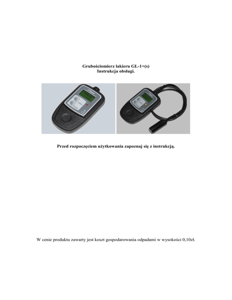 Grubościomierz lakieru GL-1+(s) Instrukcja obsługi. Przed rozpoczęciem użytkowania zapoznaj się z instrukcją. W cenie produktu zawarty jest koszt gospodarowania odpadami w wysokości 0,10zł. Spis treści 1. Specyfikacja………………………………………………………………………………2 2. Przygotowanie do pomiaru……………………….……………………………………...2 3. Obsługa miernika..……………………………………………………………………….2 Gwarancja…………………………………………………………………………………..4 1. Specyfikacja Podstawowe parametry przyrządu: - pomiar na blachach stalowych i stalowych ocynkowanych; - rozdzielczość pomiaru: 1µm lub 10µm (możliwość zmiany za pomocą funkcji „Rozdz.”); - zakres pomiaru: 0µm do 1100µm; - funkcja ASYSTENT LED; - podświetlanie LCD; - automatyczne wyłączenie miernika po ok. 3 minutach bezczynności; - zasilanie: bateria alkaiczna 9V (np. 6LR61) lub akumulatorek 9V; - pobór prądu: ok. 30mA; - funkcja zerowania. 2. Uwagi ogólne oraz przygotowanie do pomiaru Grubościomierz lakieru GL-1(s) służy do pomiaru grubości warstwy lakieru nałożonej na blachę samochodową stalową lub stalową ocynkowaną. Rozdzielczość pomiaru wynosi 1µm lub 10µm w zależności od wybranych ustawień. Urządzenie ma wbudowane podświetlanie wyświetlacza, dzięki temu łatwiejsze jest dokonanie pomiaru w ciemniejszych pomieszczeniach (jak np. garaż). Funkcja ASYSTENT LED podpowiada oceniającemu samochód czy miał on naprawy blacharskolakiernicze. Przed rozpoczęciem pomiarów należy umieścić sprawną baterię w tylnej części obudowy. W tym celu otwieramy klapkę i podłączmy baterię alkaiczną (!) lub akumulatorek (patrz specyfikacja) do klipsów zaciskowych umieszczonych na kabelku. UWAGA !!! 1. Należy zwrócić uwagę na biegunowość baterii. 2. Bateria powinna być alkaiczna. Zwykła bateria bardzo szybko wyczerpie się. 3. Można zastosować akumulatorek 9V, który posiada takie samo przyłącze. 4. Nieprawidłowa praca może być spowodowana słabą baterią. Pomiaru dokonuje się przykładając czujnik do badanej powierzchni. Czujnik powinien możliwie płasko przylegać. Badana powierzchnia powinna być czysta i gładka – brud i chropowatość powodują dodatkową warstwę mierzoną. 3. Obsługa miernika Miernik wyposażony jest w dwa przyciski, za pomocą których obsługujemy przyrząd: - (OK / MENU): służy do włączenia miernika, zatwierdzania wybranych funkcji z MENU oraz do wychodzenia z funkcji z powrotem do MENU; - (FUNKCJA): służy do przełączania funkcji w MENU głównym. Miernik włączamy przyciskając na chwilę przycisk OK. Po wyświetleniu loga firmy oraz nazwy przyrządu, miernik przejdzie do MENU głównego. Na wyświetlaczu w pierwszej linii będzie wyświetlany napis „>POMIAR”. Znak „>” w pierwszej linii sygnalizuje aktualnie zaznaczoną funkcję. Funkcje przełączamy przyciskiem FUNKCJA: - POMIAR; - powoduje przejście miernika w stan pomiaru; - WYLACZ; - powoduje wyłączenie miernika; - KAS. POM. - powoduje skasowanie pamięci pomiarów; - ZERO - funkcja zerowania miernika; - ASYST. - aktywuje lub deaktywuje funkcję ASYSTENT. -2- W celu zatwierdzenia wybranej funkcji należy wcisnąć przycisk OK. FUNKCJA POMIAR Po wybraniu tej funkcji na wyświetlaczu w pierwszej linii będzie widniał napis „POMIAR” a w drugiej linii „----um”. Miernik w tym momencie oczekuje na przyłożenie do badanej blachy samochodowej. POMIAR ----um Po przyłożeniu sondy do karoserii na wyświetlaczu w drugiej linii przedstawiony zostanie pomiar. POMIAR 143um Po przeprowadzeniu pomiarów, należy wyjść do MENU głównego wciskając przycisk (OK / MENU). FUNKCJA WYŁĄCZ Po zatwierdzeniu przyciskiem (OK) tej funkcji, miernik wyłączy się. FUNKCJA ZERO [Zerowanie (kalibracja)] Przed rozpoczęciem pomiarów, należy sprawdzić czy miernik jest wyzerowany. W tym celu wybieramy w MENU głównym funkcję „ZERO” i przykładamy miernik na środek płytki zerującej. Jeżeli wskazanie wyniesie 0 +/-10um oznacza to, że miernik jest wyzerowany prawidłowo. Jeżeli odchylenie będzie większe niż +/-10um to należy miernik przyłożyć do płytki zerującej, lekko docisnąć, poczekać aż wynik ustabilizuje się i wcisnąć przycisk (OK). Na wyświetlaczu pojawi się napis „OK…” i miernik przejdzie do MENU głównego. Jeżeli miernik jest wyzerowany to z funkcji „ZERO” można wyjść przyciskając przycisk (OK.) gdy na wyświetlaczu w drugiej linii pojawi się „----„. UWAGA! Podczas zerowania, płytka do zerowania powinna leżeć na płaskiej powierzchni niemetalicznej (nie powinno się kłaść płytki np. na karoserii samochodowej, metalowym blacie itp.), nie powinna też być trzymana w dłoni. Zerowanie należy przeprowadzać np. przy dużych zmianach temperatury otoczenia. FUNKCJA ROZDZ. (ROZDZIELCZOŚĆ) Miernik posiada możliwość zmiany rozdzielczości pomiaru. Po wejściu do funkcji można za pomocą przycisku (FUNKCJA) zmieniać rozdzielczość pomiaru: - D=10 – wynik zaokrąglany jest do 10um - szybszy pomiar - D=1 – wynik przedstawiany jest co do 1um Podczas oględzin pojazdu wystarczającą rozdzielczością pomiaru jest D=10. ASYSTENT LED Podpowiada oceniającemu samochód czy miał on naprawy blacharsko-lakiernicze. Gdy funkcja jest włączona, miernik sygnalizuje za pomocą diody LED o stanie blacharki: - dioda nie świeci - lakier prawidłowy; - dioda pulsuje - druga warstwa lakieru; - dioda świeci w sposób ciągły - szpachla lub więcej warstw lakieru; Producent zastrzega sobie możliwość zwiększenia lub zmniejszenia ilości przedziałów podczas unowocześniania przyrządu. Należy zaznaczyć, że funkcja ASYSTENT ma jedynie pomóc w interpretacji pomiarów, nie może ona być podstawą do jednoznacznej odpowiedzi na pytanie czy samochód miał napra