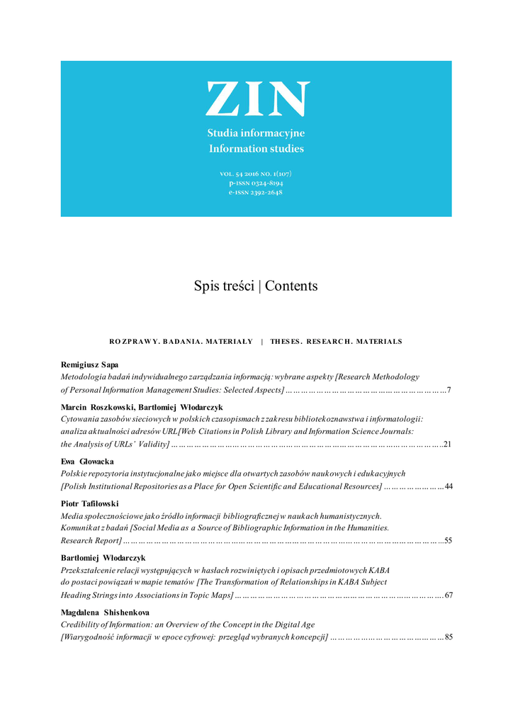 Spis treści | Contents RO ZP RAW Y. B ADANIA. MATERIAŁY | TH ES ES . RES EARC H . MATERIALS Remigiusz Sapa Metodologia badań indywidualnego zarządzania informacją: wybrane aspekty [Research Methodology of Personal Information Management Studies: Selected Aspects]………………………………………………………7 Marcin Roszkowski, Bartłomiej Włodarczyk Cytowania zasobów sieciowych w polskich czasopismach z zakresu bibliotekoznawstwa i informatologii: analiza aktualności adresów URL[Web Citations in Polish Library and Information Science Journals: the Analysis of URLs’ Validity]……………………………………………………………………………………………..21 Ewa Głowacka Polskie repozytoria instytucjonalne jako miejsce dla otwartych zasobów naukowych i edukacyjnych [Polish Institutional Repositories as a Place for Open Scientific and Educational Resources] ……………………44 Piotr Tafiłowski Media społecznościowe jako źródło informacji bibliograficznej w naukach humanistycznych. Komunikat z badań [Social Media as a Source of Bibliographic Information in the Humanities. Research Report]…………………………………………………………………………………………………………… ...55 Bartłomiej Włodarczyk Przekształcenie relacji występujących w hasłach rozwiniętych i opisach przedmiotowych KABA do postaci powiązań w mapie tematów [The Transformation of Relationships in KABA Subject Heading Strings into Associations in Topic Maps]……………………………………………………………………….67 Magdalena Shishenkova Credibility of Information: an Overview of the Concept in the Digital Age [Wiarygodność informacji w epoce cyfrowej: przegląd wybranych koncepcji] ………………………………………85 Jarosław Pacek Pole semantyczne terminu „książka elektroniczna” [Semantic Field of the Term “Electronic Book”]…………95 Grzegorz Gmiterek Sieciowe sposoby społecznościowego zarządzania informacją o dokumentach [Networked Approaches to Social Information Management on Documents]……………………………………………………………………108 REC ENZJ E I O MÓ WIENIA | REVIEW S Dorota Siwecka: Światowy model informacji bibliograficznej: programy i projekty (1950–2010) [World Model of Bibliographic Information: Programmes and Projects (1950–2010). Wrocław; Warszawa 2015 (Jakub Maciej Łubocki)…………………………………………………………….134 Mariusz Jarocki: Open Source w bibliotekach w świetle badań publicznych uczelni akademickich w Polsce [Open Source in the Libraries in View of the Research on Polish Public Universities]. Toruń 2015 (Grzegorz Gmiterek)………………………………………………………………………………..137 Małgorzata Kowalska: Crowdsourcing internetowy – pozytywny wymiar partycypacji społecznej. Konteksty – istota – uwarunkowania [Online Crowdsourcing – the Positive Dimension of Social Participation. Contexts – Nature – Determinants]. Warszawa 2016 (Katarzyna Materska)……………………141 Wśród zagranicznych książek [Foreign Publications] (Jacek Wojciechowski)………………………………..145 Przegląd polskich nowości wydawniczych [New Polish Publications] (Anna Stanis)…………………………154 KRO NIKA | C H RO NICLE „Europejska konferencja edukacji informacyjnej” (Tallinn, Estonia, 19–22 października 2015) [European Conference on Information Literacy (Tallinn, Estonia, October 19–22, 2015)] (Ewa Rozkosz, Zuza Wiorogórska)……………………………………………………………………………...159 „Digital Humanities 2016” (Kraków, 11–16 lipca 2016) (Anna Kamińska)…………………………………..163 W S KAZÓ WKI DLA AUTO RÓ W | G UIDELINES FO R AUTH O RS …………………………………………………167 Metodologia badań indywidualnego zarządzania informacją: wybrane aspekty Remigiusz Sapa Instytut Informacji Naukowej i Bibliotekoznawstwa, Wydział Zarządzania i Komunikacji Społecznej, Uniwersytet Jagielloński Abstrakt Cel/teza: Celem badań, których wyniki przedstawione są w artykule było zidentyfikowanie sposobów rozwiązywania istotnych dylematów w projektowaniu badań z zakresu indywidualnego zarządzania informacją. Koncepcja/metody badań: Przyjęto perspektywę jakościową, a badaniami objęto publikacje udostępniane w zasobach Web of Science Core Collection: Citation Indexes (wyszukane 21 sierpnia 2015 roku), które w tytule zawierały termin personal information management i omawiały badania empiryczne różnych aspektów tej problematyki. Dążono do rozpoznania sześciu elementów: ogólnego celu badań, ujęcia w czasie, środowiska badań, rodzaju danych i sposobu ich interpretacji, zastosowanych technik i sposobu doboru uczestników badań. Wyniki i wnioski: Przeprowadzona analiza wskazuje na dużą różnorodność rozwiązań czerpanych z różnych perspektyw metateoretycznych. Wyniki ujawniają kluczowe rozstrzygnięcia metodologiczne podejmowane w badaniach indywidualnego zarządzania informacją. Oryginalność/wartość poznawcza: Wyniki mogą być pomocne w projektowaniu tego typu badań oraz jako punkt wyjścia do pogłębionych rozważań nad ich metodologią. Słowa kluczowe Indywidualne zarządzanie informacją. Metodologia. Projektowanie badań. T echniki badawcze. Research Methodology of Personal Information Management Studies: Selected Aspects Abstract Purpose/T hesis: T he aim of the research t he results of which are presented in this article was to identify the ways of solving essential dilemmas in the development of research in the field of personal information management (PIM). Approach/Research methods: T he author applied a qualitative approach. T he analysis involved publications available in Web o