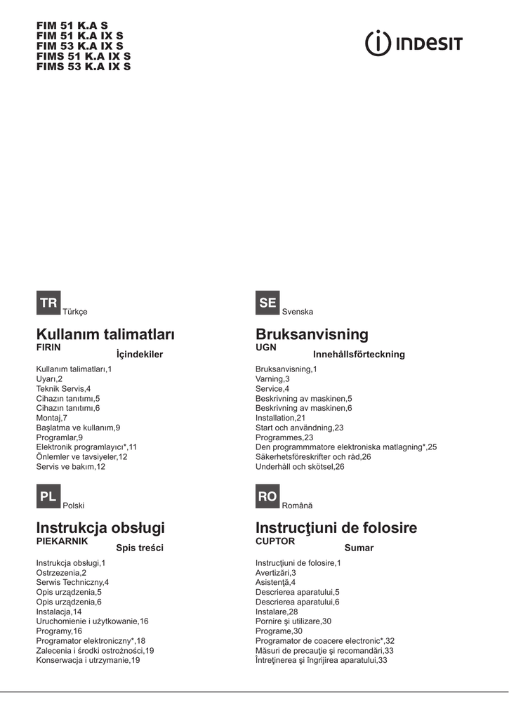 FIM 51 K.A S FIM 51 K.A IX S FIM 53 K.A IX S FIMS 51 K.A IX S FIMS 53 K.A IX S Svenska Türkçe Kullanım talimatları FIRIN İçindekiler Kullanım talimatları,1 Uyarı,2 Teknik Servis,4 Cihazın tanıtımı,5 Cihazın tanıtımı,6 Montaj,7 Başlatma ve kullanım,9 Programlar,9 Elektronik programlayıcı*,11 Önlemler ve tavsiyeler,12 Servis ve bakım,12 Polski UGN Innehållsförteckning Bruksanvisning,1 Varning,3 Service,4 Beskrivning av maskinen,5 Beskrivning av maskinen,6 Installation,21 Start och användning,23 Programmes,23 Den programmmatore elektroniska matlagning*,25 Säkerhetsföreskrifter och råd,26 Underhåll och skötsel,26 Română Instrukcja obsługi PIEKARNIK Bruksanvisning Spis treści Instrukcja obsługi,1 Ostrzezenia,2 Serwis Techniczny,4 Opis urządzenia,5 Opis urządzenia,6 Instalacja,14 Uruchomienie i użytkowanie,16 Programy,16 Programator elektroniczny*,18 Zalecenia i środki ostrożności,19 Konserwacja i utrzymanie,19 Instrucţiuni de folosire CUPTOR Sumar Instrucţiuni de folosire,1 Avertizări,3 Asistenţă,4 Descrierea aparatului,5 Descrierea aparatului,6 Instalare,28 Pornire şi utilizare,30 Programe,30 Programator de coacere electronic*,32 Măsuri de precauţie şi recomandări,33 Întreţinerea şi îngrijirea aparatului,33 Uyarı Ostrzezenia DİKKAT: Bu cihaz ve erişilebilen bölümleri, kullanım sırasında çok sıcak olur. Dikkat etmek ve ısıtılan parçalara dokunmaktan kaçınmak gerekir. Eğer sürekli olarak gözetim altında değiller ise, 8 yaşından küçük çocukları uzak tutunuz. Bu cihaz, eğer uygun şekilde gözetim altında bulunuyorlar ise veya güvenli şekilde cihazın kullanımı hakkında eğitim almışlar ise ve ilişkin tehlikeler göz önünde bulundurulur ise, 8 yaşından itibaren çocuklar ve fiziksel, duyusal veya mental kapasitelerden yoksun veya tecrübe ve bilgi sahibi olmayan kişiler tarafından kullanılabilir. Çocuklar, cihaz ile oynamamalıdır. Temizlik ve bakım işlemleri, denetimsiz olarak çocuklar tarafından gerçekleştirilmemelidir. UWAGA: To urządzenie oraz jego dostępne części silnie się rozgrzewają podczas użytkowania. Należy uważać, aby nie dotknąć elementów grzejnych. Nie pozwalać, aby dzieci poniżej 8 roku życia zbliżały się do urządzenia, jeśli nie są pod stałym nadzorem dorosłych. Z niniejszego urządzenia mogą korzystać dzieci powyżej 8 roku życia i osoby o ograniczonych zdolnościach fizycznych, zmysłowych bądź umysłowych, jak również osoby nieposiadające doświadczenia lub znajomości urządzenia, jeśli znajdują się one pod nadzorem innych osób lub jeśli zostały pouczone na temat bezpiecznego sposobu użycia urządzenia oraz zdają sobie sprawę ze związanych z nim zagrożeń. Dzieci nie powinny bawić się urządzeniem. Prace związane z czyszczeniem i konserwacją nie mogą być wykonywane przez dzieci, jeśli nie są one nadzorowane. Camın parçalanmasına neden olarak yüzeyi çizebileceğinden, fırının cam kapağını temizlemek için aşındırıcı ürünler ve kesici metal spatulalar kullanmayınız. Cihazı temi zl e rke n a sl a b u h a rlı yada yüksek basınçlı temizleyiciler kullanmayınız. DİKKAT: Muhtemel elektrik çarpmalarının önüne geçmek için lambayı yenisi ile değiştirmeden önce, cihazın sönük olduğundan emin olunuz. ! Izgara takıldığı zaman, kilidin yukarı doğru dönük ve yuvanın arka tarafında olduğundan emin olunuz. Nie stosować środków ściernych ani ostrych łopatek metalowych do czyszczenia szklanych drzwiczek piekarnika, ponieważ mogłyby porysować powierzchnię i spowodować pęknięcie szyby. Nie stosować nigdy oczyszczaczy parowych lub ciśnieniowych do czyszczenia urządzenia. UWAGA: Przed wymianą żarówki, należy się upewnić, że urządzenie jest wyłączone, aby uniknąć ryzyka porażenia prądem. ! Wsuwając ruszt, należy się upewnić, że ogranicznik jest skierowany ku górze i znajduje się on w tylnej części komory. 2 Varning Avertizări OBSERVERA! Denna utrustning och dess delar blir mycket varma under användning. Va r n o g a m e d a t t i n t e v i d r ö r a värmeelementen. Håll barn under 8 år under uppsikt så att de inte leker med utrustningen. Denna utrustning kan användas av barn över 8 år och personer med psykiska, sensoriska eller fysiska handikapp, eller som saknar erfarenhet och lämpliga kunskaper, under förutsättning att detta sker under uppsikt av en person som ansvarar för deras säkerhet eller att de har fått nödvändiga anvisningar angående dess användning och är medvetna om farorna i samband med användningen. Barn får inte leka med utrustningen. Rengörings- och underhållsmomenten får inte utföras av barn utan en vuxens tillsyn. ATENŢIE: Acest aparat şi părţile sale accesibile devin foarte calde în timpul folosirii. Trebuie să fiţi atenţi şi să nu atingeţi elementele de încălzire. Îndepărtaţi copiii sub 8 ani dacă nu sunt supravegheaţi continuu. Acest aparat poate fi utilizat de copiii de peste 8 ani şi de persoane cu capacităţi fizice, senzoriale sau mentale reduse sau fără experienţă şi cunoştinţe dacă se află sub o supraveghere corespunzătoare sau dacă au fost instruiţi cu privire la folosirea aparatului în mod sigur şi dacă îşi dau seama de pericolele corelate. Copiii nu trebuie să se joace cu aparatul. Operaţiunile de curăţare şi de întreţinere nu trebuie să fie efectuate de copii fără supraveghere. Använd inte slipande rengöringsmedel eller vassa metallskrapor för att rengöra ugnens glaslucka eftersom de kan repa ytan, vilket kan leda till att glaset spricker. Använd aldrig ångtvättar eller högtryckstvättar för att göra rent utrustningen. OBSERVERA! Kontrollera att utrustningen är avstängd innan lampan byts ut, för att undvika elstötar. ! När gallret sätts in ska du kontrollera att stoppet är vänt uppåt och på den bakre delen av fördjupningen. Nu fo