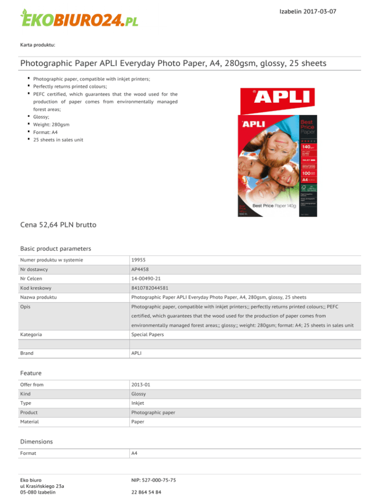 Izabelin 2017-03-07 Karta produktu: Photographic Paper APLI Everyday Photo Paper, A4, 280gsm, glossy, 25 sheets Photographic paper, compatible with inkjet printers; Perfectly returns printed colours; PEFC certified, which guarantees that the wood used for the production of paper comes from environmentally managed forest areas; Glossy; Weight: 280gsm Format: A4 25 sheets in sales unit Cena 52,64 PLN brutto Basic product parameters Numer produktu w systemie 19955 Nr dostawcy AP4458 Nr Celcen 14-00490-21 Kod kreskowy 8410782044581 Nazwa produktu Photographic Paper APLI Everyday Photo Paper, A4, 280gsm, glossy, 25 sheets Opis Photographic paper, compatible with inkjet printers;; perfectly returns printed colours;; PEFC certified, which guarantees that the wood used for the production of paper comes from environmentally managed forest areas;; glossy;; weight: 280gsm; format: A4; 25 sheets in sales unit Kategoria Special Papers Brand APLI Feature Offer from 2013-01 Kind Glossy Type Inkjet Product Photographic paper Material Paper Dimensions Format A4 Eko biuro ul Krasińskiego 23a 05-080 Izabelin NIP: 527-000-75-75 22 864 54 84 Izabelin 2017-03-07 Karta katalogowa produktu cd. Photographic Paper APLI Everyday Photo Paper, A4, 280gsm, glossy, 25 sheets Weight (g/m2) 280 Dimensions (mm) 210x297 Procurement vocabulary CPV 30197644-2 Papier kserograficzny Certifications New product Standard Hit Standard Amount Number of sheets 25 Colour Colour Glossy white Pozostałe zdjęcia produktu Serdecznie zapraszamy do współpracy Eko biuro zespół. Eko biuro ul Krasińskiego 23a 05-080 Izabelin NIP: 527-000-75-75 22 864 54 84