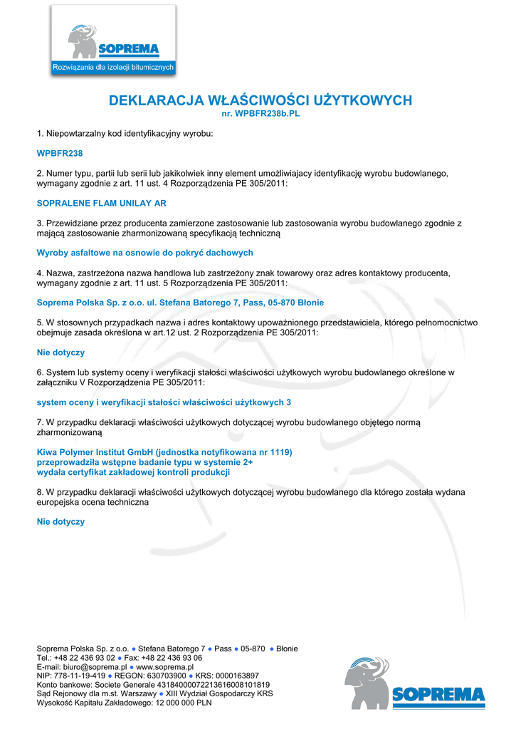 DEKLARACJA WŁAŚCIWOŚCI UŻYTKOWYCH nr. WPBFR238b.PL 1. Niepowtarzalny kod identyfikacyjny wyrobu: WPBFR238 2. Numer typu, partii lub serii lub jakikolwiek inny element umożliwiajacy identyfikację wyrobu budowlanego, wymagany zgodnie z art. 11 ust. 4 Rozporządzenia PE 305/2011: SOPRALENE FLAM UNILAY AR 3. Przewidziane przez producenta zamierzone zastosowanie lub zastosowania wyrobu budowlanego zgodnie z mającą zastosowanie zharmonizowaną specyfikacją techniczną Wyroby asfaltowe na osnowie do pokryć dachowych 4. Nazwa, zastrzeżona nazwa handlowa lub zastrzeżony znak towarowy oraz adres kontaktowy producenta, wymagany zgodnie z art. 11 ust. 5 Rozporządzenia PE 305/2011: Soprema Polska Sp. z o.o. ul. Stefana Batorego 7, Pass, 05-870 Błonie 5. W stosownych przypadkach nazwa i adres kontaktowy upoważnionego przedstawiciela, którego pełnomocnictwo obejmuje zasada określona w art.12 ust. 2 Rozporządzenia PE 305/2011: Nie dotyczy 6. System lub systemy oceny i weryfikacji stałości właściwości użytkowych wyrobu budowlanego określone w załączniku V Rozporządzenia PE 305/2011: system oceny i weryfikacji stałości właściwości użytkowych 3 7. W przypadku deklaracji właściwości użytkowych dotyczącej wyrobu budowlanego objętego normą zharmonizowaną Kiwa Polymer Institut GmbH (jednostka notyfikowana nr 1119) przeprowadziła wstępne badanie typu w systemie 2+ wydała certyfikat zakładowej kontroli produkcji 8. W przypadku deklaracji właściwości użytkowych dotyczącej wyrobu budowlanego dla którego została wydana europejska ocena techniczna Nie dotyczy Soprema Polska Sp. z o.o. ● Stefana Batorego 7 ● Pass ● 05-870 ● Błonie Tel.: +48 22 436 93 02 ● Fax: +48 22 436 93 06 E-mail: [email protected] ● www.soprema.pl NIP: 778-11-19-419 ● REGON: 630703900 ● KRS: 0000163897 Konto bankowe: Societe Generale 43184000072213616008101819 Sąd Rejonowy dla m.st. Warszawy ● XIII Wydział Gospodarczy KRS Wysokość Kapitału Zakładowego: 12 000 000 PLN 9. Deklarowane właściwości użytkowe: ZASADNICZE CHARAKTERYSTYKI Odporność na działanie ognia zewnętrznego* Reakcja na ogień Wodoszczelność Maksymalna siła rozciągająca (MDV) wzdłuż w poprzek Wydłużenie przy maksymalnej sile rozciągajacej (MDV) wzdłuż w poprzek Odporność na przerastanie korzeni Odporność na obciążenie statyczne (MLV) Odporność na uderzenie (MLV) Odporność na rozdzieranie (MDV) wzdłuż w poprzek Wytrzymałość złączy na oddzieranie (MDV) Wytrzymałość złączy na ścinanie (MDV) Trwałość: Odporność na spływanie w podwyższonej temperaturze po starzeniu Giętkość w niskiej temperaturze (MDV) (MLV) Substancje niebezpieczne** *** WŁAŚCIWOŚCI UŻYTKOWE JEDNOSTKA MIARY FROOF (t1) E wodoszczelna - 1400 ± 300 1300 ± 350 N/50 mm 4±1 4±1 % NPD 20 1750 kg mm ≥ 250 ≥ 250 NPD ≥ 900 N/50 mm 90 °C -20 -16 nie zawiera °C ZHARMONIZOWANA SPECYFIKACJA TECHNICZNA EN 13707: 2004 + A2:2009 N N/50 mm - * Zapis Froof(t1) wynika stąd, że dla samego wyrobu właściwość użytkowa nie może być określona bazując na normie PN-ENV 1187 (Metody badań oddziaływania ognia zewnętrznego na dachy) i PN-EN 13501-5 (Klasyfikacja na podstawie wyników badań oddziaływania ognia zewnętrznego na dachy). Właściwość jest określona jako Broof(t1) dla przekrycia dachowego z udziałem wymienionego wyrobu. W kwestii stosownych raportów klasyfikacyjnych reakcji na działanie ognia zewnętrznego przekryć dachowych Broof(t1), należy się skontaktować z Działem Technicznym SOPREMA ** produkt nie zawiera azbestu oraz związków smoły *** w sytuacji gdy nie ma europejskiej metody badawczej, deklarowanie nie może być podane. Informacje muszą być zgodne z lokalnymi wymogami prawa MDV – wartość deklarowana przez producenta łącznie z deklarowaną tolerancją MLV – Wartość graniczna producenta, może być wartością minimalną lub maksymalną, zgodnie z ustaleniami dla właściwości wyrobów. NPD – właściwość użytkowa nieokreślana 10. Właściwości użytkowe wyrobu określone w pkt 1 i 2 są zgodne z właściwościami deklarowanymi w pkt.9. Niniejsza deklaracja właściwości użytkowych wydana została na wyłączną odpowiedzialność producenta określonego w pkt 4. W imieniu producenta podpisał: kierownik Działu Technicznego Dariusz Stefaniak Pass, dnia 31.03.2014 roku (miejsce i data wystawienia) Soprema Polska Sp. z o.o. ● Stefana Batorego 7 ● Pass ● 05-870 ● Błonie Tel.: +48 22 436 93 02 ● Fax: +48 22 436 93 06 E-mail: [email protected] ● www.soprema.pl NIP: 778-11-19-419 ● REGON: 630703900 ● KRS: 0000163897 Konto bankowe: Societe Generale 43184000072213616008101819 Sąd Rejonowy dla m.st. Warszawy ● XIII Wydział Gospodarczy KRS Wysokość Kapitału Zakładowego: 12 000 000 PLN (podpis osoby upoważnionej)
