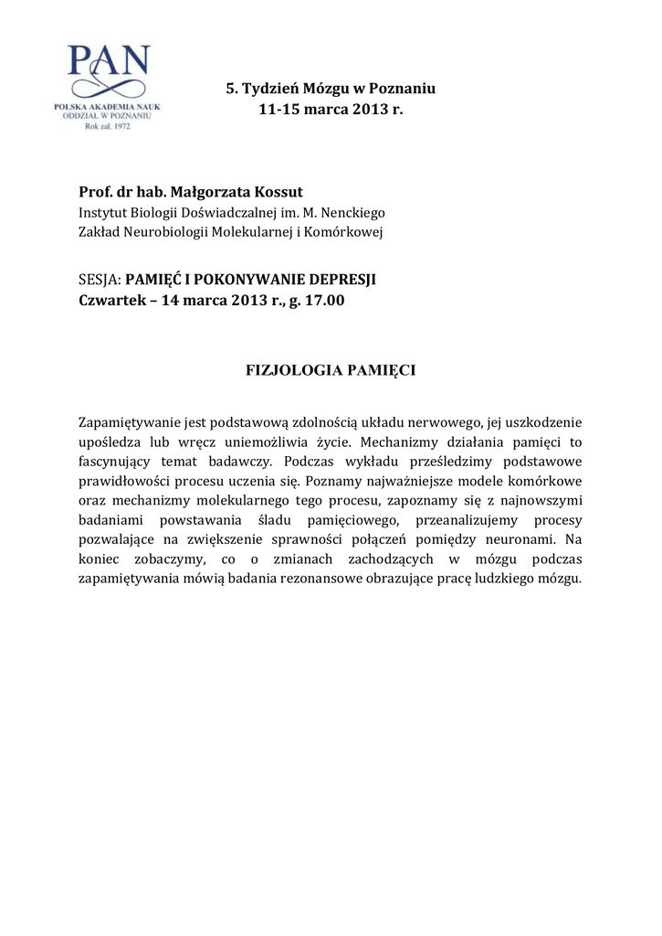 5. Tydzień Mózgu w Poznaniu 11-15 marca 2013 r. Prof. dr hab. Małgorzata Kossut Instytut Biologii Doświadczalnej im. M. Nenckiego Zakład Neurobiologii Molekularnej i Komórkowej SESJA: PAMIĘĆ I POKONYWANIE DEPRESJI Czwartek – 14 marca 2013 r., g. 17.00 FIZJOLOGIA PAMIĘCI Zapamiętywanie jest podstawową zdolnością układu nerwowego, jej uszkodzenie upośledza lub wręcz uniemożliwia życie. Mechanizmy działania pamięci to fascynujący temat badawczy. Podczas wykładu prześledzimy podstawowe prawidłowości procesu uczenia się. Poznamy najważniejsze modele komórkowe oraz mechanizmy molekularnego tego procesu, zapoznamy się z najnowszymi badaniami powstawania śladu pamięciowego, przeanalizujemy procesy pozwalające na zwiększenie sprawności połączeń pomiędzy neuronami. Na koniec zobaczymy, co o zmianach zachodzących w mózgu podczas zapamiętywania mówią badania rezonansowe obrazujące pracę ludzkiego mózgu.