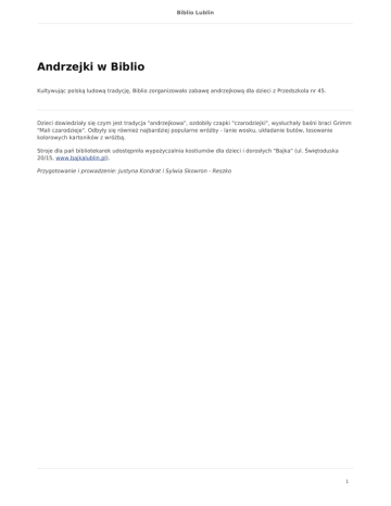 Biblio Lublin Andrzejki w Biblio Kultywując polską ludową tradycję, Biblio zorganizowało zabawę andrzejkową dla dzieci z Przedszkola nr 45. Dzieci dowiedziały się czym jest tradycja "andrzejkowa", ozdobiły czapki "czarodziejki", wysłuchały baśni braci Grimm "Mali czarodzieje". Odbyły się również najbardziej popularne wróżby - lanie wosku, układanie butów, losowanie kolorowych kartoników z wróżbą. Stroje dla pań bibliotekarek udostępniła wypożyczalnia kostiumów dla dzieci i dorosłych "Bajka" (ul. Świętoduska 20/15, www.bajkalublin.pl). Przygotowanie i prowadzenie: Justyna Kondrat i Sylwia Skowron - Reszko 1
