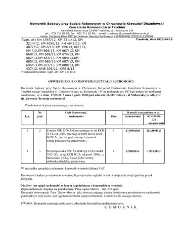 Komornik Sądowy przy Sądzie Rejonowym w Chrzanowie Krzysztof Dłużniewski Kancelaria Komornicza w Trzebini Kancelaria Komornicza 32-540 Trzebinia, ul. Kościuszki 134 tel.: 032 711 82 99, fax: 032 711 82 99, , email: [email protected] konto: Deutsche Bank PBC SA Centrum Operacji Bankowych 25191010482105021012330001 Trzebinia, dnia 2013-04-16 Km 1545/12, KM 2211/12, KM Sygn. akt 3214/12, KM 4050/12, KM 4642/12, KM 4872/12, KM 6/13, KM 159/13, KM /13, KM /13,KM 666/13, KM 667/13, KM 668/13, KM 669/13,KM 674/13, KM 682/13,KM 683/13, KM 684/13,KM 685/13, KM 686/13,KM 687/13, KM 694/13,KM 697/13, KM 888/13, KM 437/13, KMS 305/12, KMS 8/13 w odpowiedzi podać: sygn. akt Km 1545/12 OBWIESZCZENIE O PIERWSZEJ LICYTACJI RUCHOMOŚCI Komornik Sądowy przy Sądzie Rejonowym w Chrzanowie Krzysztof Dłużniewski Kancelaria Komornicza w Trzebini mający kancelarię w Chrzanowie przy ul. Kościuszki 134 na podstawie art. 867 kpc podaje do publicznej wiadomości, że w dniu 17.05.2013 roku o godz. 10.00 pod adresem 32-545 Dulowa , ul Nałkowskiej 6 odbędzie się pierwsza licytacja ruchomości. Przedmiotem licytacji są następujące ruchomości: Wartość szacunkowa w zł. wywołania oszacowania 3/4 oszacowania L.p. Nr prot. Opis licytowanej ruchomości 1 2 Yamaha FJR 1300, koloru czarnego, nr rej KCH 3C54, rok 2008, przebieg ok 6000 km na dzień 04.2012r., nie ma podrzewanych manetek, wersja podstawowa, garażowany, 1 27.000,00zł 20.250,00 zł 2 1 Przyczepa lekka ZPC Świdnik typ 23,62 model 2362/1SE, nr rej KCH 4C29, rok prod 2008r., o ładowności 750kg, 2-osie, kolor srebny, niebieska plandeka, garażowana 1 2.500,00 zł 1.875,00 zł ilość W przypadku sprzedaży ruchomości komornik wystawia fakturę VAT. Ruchomości będące przedmiotem niniejszej licytacji można oglądać w dniu i miejscu licytacji (godzinę przed licytacją). Możliwy jest ogląd ruchomości w innym uzgodnionym z komornikiem terminie. Zajęta ruchomość znajduje się pod dozorem: Pana Gąsior Marcin (art. 855 kpc). Komornik zobowiązuje Pana Gąsior Marcin jako dozorcę zajętego mienia do okazania przedmiotowej ruchomości potencjalnym nabywcom pod rygorem odebrania zajętej ruchomości i ustanowienia nowego dozorcy. UWAGA: Komornik zastrzega sobie prawo odwołania licytacji bez podania przyczyn. K O M O R N I K Krzysztof Dłużniewski Otrzymują: - dłużnik - wierzyciele - Sąd Rejonowy w Chrzanowie- tablica ogłoszeń - Urząd Skarbowy w Chrzanowie - Urząd Miasta w Trzebinia - kancelaria komornika - tablica ogłoszeń -a/a Pouczenie: Nabywca obowiązany jest zapłacić cenę nabycia natychmiast po udzieleniu mu przybicia. Gdy jednak cena przewyższa 500,-zł obowiązek nabywcy ogranicza się do złożenia natychmiast 1/5 ceny, nie mniej jednak niż 500,-zł,przy czym reszta powinna być uiszczona do godziny 12 dnia następnego. Nabywca, który w przepisanym terminie nie uiści ceny w całości lub części, traci prawa wynikające z przybicia. Jeżeli nabywca nie uiści w terminie sumy przypadającej do zapłaty natychmiast przy udzieleniu przybicia, komornik wznowi niezwłocznie przetarg tych samych ruchomości, rozpoczynając od ceny wywołania, przy czym opieszały nabywca nie może uczestniczyć w licytacji. W razie niezapłacenia w terinie reszty ceny płatnej dnia następnego po licytacji, będzie wyznaczona ponowna licytacja na warunkach pierwszej.