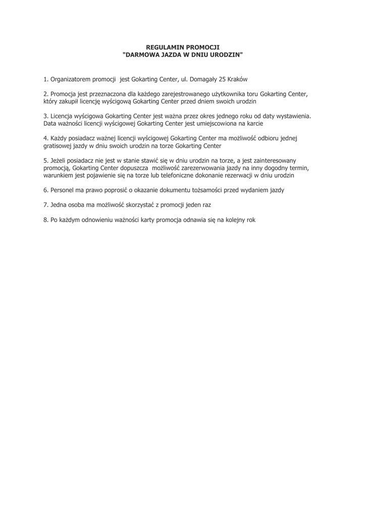 REGULAMIN PROMOCJI "DARMOWA JAZDA W DNIU URODZIN" 1. Organizatorem promocji jest Gokarting Center, ul. Domagały 25 Kraków 2. Promocja jest przeznaczona dla każdego zarejestrowanego użytkownika toru Gokarting Center, który zakupił licencję wyścigową Gokarting Center przed dniem swoich urodzin 3. Licencja wyścigowa Gokarting Center jest ważna przez okres jednego roku od daty wystawienia. Data ważności licencji wyścigowej Gokarting Center jest umiejscowiona na karcie 4. Każdy posiadacz ważnej licencji wyścigowej Gokarting Center ma możliwość odbioru jednej gratisowej jazdy w dniu swoich urodzin na torze Gokarting Center 5. Jeżeli posiadacz nie jest w stanie stawić się w dniu urodzin na torze, a jest zainteresowany promocją, Gokarting Center dopuszcza możliwość zarezerwowania jazdy na inny dogodny termin, warunkiem jest pojawienie się na torze lub telefoniczne dokonanie rezerwacji w dniu urodzin 6. Personel ma prawo poprosić o okazanie dokumentu tożsamości przed wydaniem jazdy 7. Jedna osoba ma możliwość skorzystać z promocji jeden raz 8. Po każdym odnowieniu ważności karty promocja odnawia się na kolejny rok