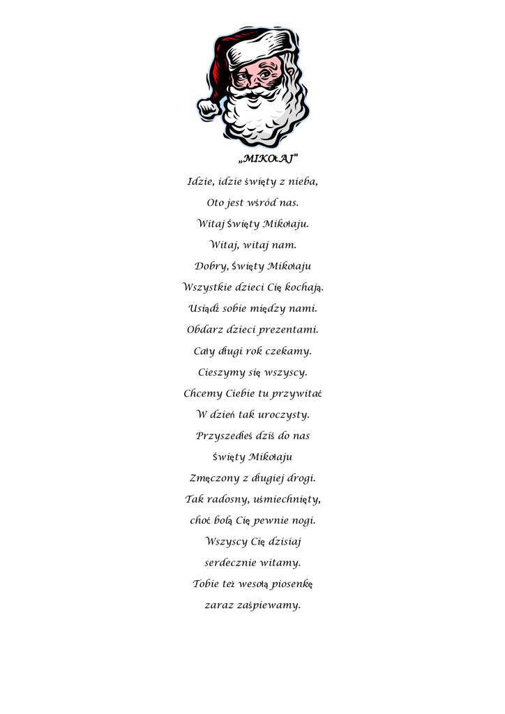 „MIKOŁAJ MIKO AJ” AJ” Idzie, idzie święty z nieba, Oto jest wśród nas. Witaj Święty Mikołaju. Witaj, witaj nam. Dobry, Święty Mikołaju Wszystkie dzieci Cię kochają. Usiądź sobie między nami. Obdarz dzieci prezentami. Cały długi rok czekamy. Cieszymy się wszyscy. Chcemy Ciebie tu przywitać W dzień tak uroczysty. Przyszedłeś dziś do nas Święty Mikołaju Zmęczony z długiej drogi. Tak radosny, uśmiechnięty, choć bolą Cię pewnie nogi. Wszyscy Cię dzisiaj serdecznie witamy. Tobie też wesołą piosenkę zaraz zaśpiewamy.