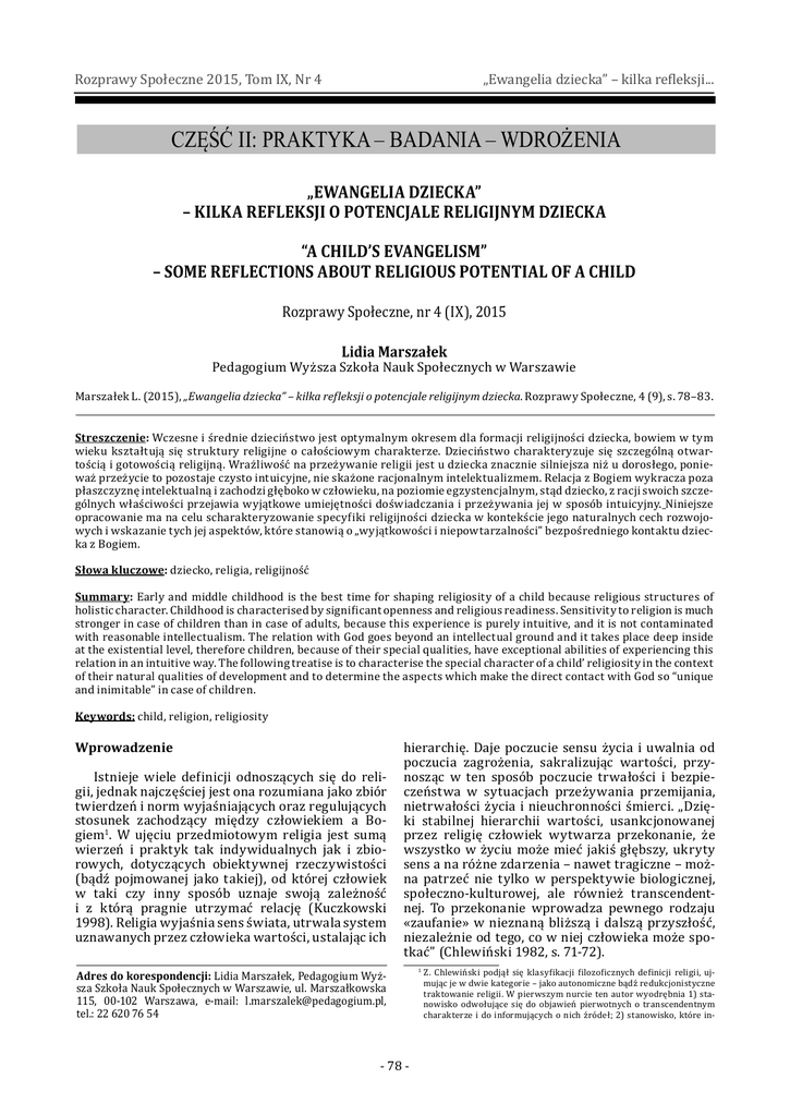 Rozprawy Społeczne 2015, Tom IX, Nr 4 „Ewangelia dziecka” – kilka refleksji... CZĘŚĆ II: PRAKTYKA – BADANIA – WDROŻENIA „EWANGELIA DZIECKA” – KILKA REFLEKSJI O POTENCJALE RELIGIJNYM DZIECKA “A CHILD’S EVANGELISM” – SOME REFLECTIONS ABOUT RELIGIOUS POTENTIAL OF A CHILD Rozprawy Społeczne, nr 4 (IX), 2015 Lidia Marszałek Pedagogium Wyższa Szkoła Nauk Społecznych w Warszawie Marszałek L. (2015), „Ewangelia dziecka” – kilka refleksji o potencjale religijnym dziecka. Rozprawy Społeczne, 4 (9), s. 78–83. Streszczenie: Wczesne i średnie dzieciństwo jest optymalnym okresem dla formacji religijności dziecka, bowiem w tym wieku kształtują się struktury religijne o całościowym charakterze. Dzieciństwo charakteryzuje się szczególną otwartością i gotowością religijną. Wrażliwość na przeżywanie religii jest u dziecka znacznie silniejsza niż u dorosłego, ponieważ przeżycie to pozostaje czysto intuicyjne, nie skażone racjonalnym intelektualizmem. Relacja z Bogiem wykracza poza płaszczyznę intelektualną i zachodzi głęboko w człowieku, na poziomie egzystencjalnym, stąd dziecko, z racji swoich szczególnych właściwości przejawia wyjątkowe umiejętności doświadczania i przeżywania jej w sposób intuicyjny. Niniejsze opracowanie ma na celu scharakteryzowanie specyfiki religijności dziecka w kontekście jego naturalnych cech rozwojowych i wskazanie tych jej aspektów, które stanowią o „wyjątkowości i niepowtarzalności” bezpośredniego kontaktu dziecka z Bogiem. Słowa kluczowe: dziecko, religia, religijność Summary: Early and middle childhood is the best time for shaping religiosity of a child because religious structures of holistic character. Childhood is characterised by significant openness and religious readiness. Sensitivity to religion is much stronger in case of children than in case of adults, because this experience is purely intuitive, and it is not contaminated with reasonable intellectualism. The relation with God goes beyond an intellectual ground and it takes place deep inside at the existential level, therefore children, because of their special qualities, have exceptional abilities of experiencing this relation in an intuitive way. The following treatise is to characterise the special character of a child’ religiosity in the context of their natural qualities of development and to determine the aspects which make the direct contact with God so “unique and inimitable” in case of children. Keywords: child, religion, religiosity Wprowadzenie Istnieje wiele definicji odnoszących się do religii, jednak najczęściej jest ona rozumiana jako zbiór twierdzeń i norm wyjaśniających oraz regulujących stosunek zachodzący między człowiekiem a Bogiem1. W ujęciu przedmiotowym religia jest sumą wierzeń i praktyk tak indywidualnych jak i zbiorowych, dotyczących obiektywnej rzeczywistości (bądź pojmowanej jako takiej), od której człowiek w taki czy inny sposób uznaje swoją zależność i z którą pragnie utrzymać relację (Kuczkowski 1998). Religia wyjaśnia sens świata, utrwala system uznawanych przez człowieka wartości, ustalając ich Adres do korespondencji: Lidia Marszałek, Pedagogium Wyższa Szkoła Nauk Społecznych w Warszawie, ul. Marszałkowska 115, 00-102 Warszawa, e-mail: [email protected], tel.: 22 620 76 54 hierarchię. Daje poczucie sensu życia i uwalnia od poczucia zagrożenia, sakralizując wartości, przynosząc w ten sposób poczucie trwałości i bezpieczeństwa w sytuacjach przeżywania przemijania, nietrwałości życia i nieuchronności śmierci. „Dzięki stabilnej hierarchii wartości, usankcjonowanej przez religię człowiek wytwarza przekonanie, że wszystko w życiu może mieć jakiś głębszy, ukryty sens a na różne zdarzenia – nawet tragiczne – można patrzeć nie tylko w perspektywie biologicznej, społeczno-kulturowej, ale również transcendentnej. To przekonanie wprowadza pewnego rodzaju «zaufanie» w nieznaną bliższą i dalszą przyszłość, niezależnie od tego, co w niej człowieka może spotkać”1(Chlewiński 1982, s. 71-72). - 78 - Z. Chlewiński podjął się klasyfikacji filozoficznych definicji religii, ujmując je w dwie kategorie – jako autonomiczne bądź redukcjonistyczne traktowanie religii. W pierwszym nurcie ten autor wyodrębnia 1) stanowisko odwołujące się do objawień pierwotnych o transcendentnym charakterze i do informujących o nich źródeł; 2) stanowisko, które in- 1 Rozprawy Społeczne 2015, Tom IX, Nr 4 „Ewangelia dziecka” – kilka refleksji... Można przyjąć, że pojęcie „religii” odnosi się do relacji, jaka zachodzi między człowiekiem a Bogiem (ogólnie tym, co transcendentne) w ujęciu obiektywnym. W odróżnieniu od tego obiektywnego ujęcia religii religijność człowieka pojmowana jest jako doświadczenie subiektywne. Niezależnie od tego, w jaki sposób definiuje się pojęcie „religii” należy uwzględnić, że istnieje pewna cecha wspólna wszystkim religiom, a jest nią stosunek do sacrum, któremu towarzyszy zawsze uległość i poddanie. Uogólniając można stwierdzić, iż religia to pewnego rodzaju obiektywna strona odnosząca się do doktryny, kultu oraz organizacji (instytucji religijnych), natomiast religijność to subiektywna strona religii, w relacji do tych samych elementów (Keller 1986). Człowiek ze swej natury jest istotą religijną. Składa się on z pierwiastka duchowego i cielesnego, z materii skończonej i nieskończonej. Ta nieskończoność i duchowość człowieka uzdolnia go do poszukiwania tego, co wieczne i nieprzemijalne. Od samego początku nosi on w sobie wielkość transcendencji, która każe mu szukać i w tym poszukiwaniu nie ustawać przez całe życie. Religijność jest pewnym doświadczeniem tej transcendencji, swego rodzaju wewnętrznym działaniem, nawiązywaniem i szukaniem kontaktu z Bogiem oraz trwaniem w tej relacji. Człowiek, będ
