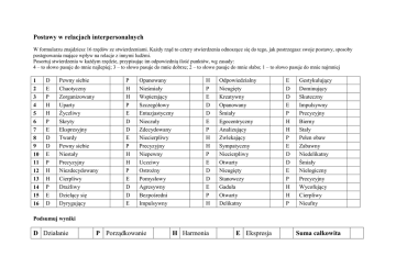 Postawy w relacjach interpersonalnych W formularzu znajdziesz 16 rzędów ze stwierdzeniami. Każdy rząd to cztery stwierdzenia odnoszące się do tego, jak postrzegasz swoje postawy, sposoby postępowania mające wpływ na relacje z innymi ludźmi. Posortuj stwierdzenia w każdym rzędzie, przypisując im odpowiednią ilość punktów, wg zasady: 4 – to słowo pasuje do mnie najlepiej; 3 – to słowo pasuje do mnie dobrze; 2 – to słowo pasuje do mnie słabo; 1 – to słowo pasuje do mnie najmniej 1 2 3 4 5 6 7 8 9 10 11 12 13 14 15 16 D E P H H P E D D E P H H P E D Pewny siebie Chaotyczny Zorganizowany Uparty Życzliwy Skryty Ekspresyjny Twardy Pewny siebie Niestały Precyzyjny Niezdecydowany Cierpliwy Drażliwy Dzielący się Dyrygujący P H H P E D D E P H H P E D D E Opanowany Nieśmiały Wspierający Szczegółowy Entuzjastyczny Nieczuły Zdecydowany Niecierpliwy Precyzyjny Niepewny Uczciwy Ostrożny Pomysłowy Agresywny Bezpośredni Impulsywny H P E D D E P H H P E D D E P H Odpowiedzialny Nieugięty Kreatywny Opanowany Śmiały Egocentryczny Analizujący Zwlekający Sympatyczny Niecierpliwy Otwarty Nieugięty Stanowczy Gaduła Otwarty Delikatny E D D E P H H P E D D E P H H P Gestykulujący Dominujący Skuteczny Impulsywny Precyzyjny Bierny Stały Pełen obaw Zabawny Niedelikatny Śmiały Nielogiczny Precyzyjny Wycofujący Cierpliwy Nieufny Podsumuj wyniki D Działanie P Porządkowanie H Harmonia E Ekspresja Suma całkowita