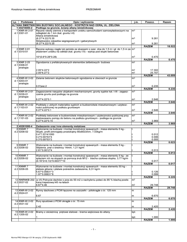 Kosztorys Inwestorski - Altana śmietnikowa PRZEDMIAR Lp. Podstawa Opis i wyliczenia ALTANA ŚMIETNIKOWA BUDYNKU SOCJALNEGO - KOSTRZYN NAD ODRĄ, UL. ZIELONA 1 45210000-2 Podłoga na gruncie, ściany altany śmietnikowej 1 KNR-W 2-01 Ręczne roboty ziemne z transportem urobku samochodami samowyładowczymi na d.1 0301-01 odległość do 1 km (kat. gruntu I-II) Altana śmietnikowa (6.27*4.22)*0.35 Składowisko odpadów segregowanych i gabarytowych (6.27*4.22)*0.35 2 KNR 2-01 d.1 0310-01 3 KNR 2-25 d.1 0308-01 analogia 4 KNR-W 2-02 d.1 0203-01 analogia 5 KNR-W 2-01 d.1 0228-01 analogia 6 KNR-W 2-02 d.1 1103-01 7 KNR-W 2-02 d.1 1101-03 2 45261000-4 8 KNNR 7 d.2 0208-02 9 KNNR 7 d.2 0208-02 10 KNNR 7 d.2 0208-02 11 KNNR 7 d.2 0208-05 j.m. m3 9.261 m3 9.261 RAZEM 18.522 0.470 RAZEM 0.470 17.302 25.707 RAZEM 43.009 0.235 RAZEM 0.235 2.646 RAZEM 2.646 2.646 RAZEM 2.646 3.969 RAZEM 3.969 0.012 0.006 0.005 RAZEM 0.023 0.013 RAZEM 0.013 0.017 RAZEM 0.017 0.126 0.099 RAZEM 0.225 29.748 RAZEM 29.748 6.670 RAZEM 6.670 2.420 RAZEM 2.420 1.000 RAZEM 1.000 Ręczne wykopy ciągłe lub jamiste ze skarpami o szer. dna do 1,5 m i gł. do 1,5 m ze m3 złożeniem urobku na odkład (kat. gruntu I-II) - wykop pod słupki betonowe 10*(0.6*0.28*0.28) m3 Ogrodzenia z prefabrykowanych elementów żelbetowych- budowa m2 2.05*4.22*2 2.05*6.27*2 m2 m2 Zalanie betonem słupków betonowych ogrodzenia w otworach w gruncie m3 0.5*poz.2 m3 Zagęszczenie nasypów ubijakami mechanicznymi; grunty sypkie kat. I-III - zagęszczenie gruntu pod podłogę na gruncie m3 6.27*4.22*0.1 m3 Podkłady z ubitych materiałów sypkich w budownictwie mieszkaniowym i użyteczności publicznej na podłożu gruntowym 6.27*4.22*0.1 m3 Podkłady betonowe w budownictwie mieszkaniowym i użyteczności publicznej przy zastosowaniu pompy do betonu na podłożu gruntowym - podłoga na gruncie 6.27*4.22*0.15 m3 Zadaszenie oraz inne elementy metalowe Wykonanie na budowie i montaż konstrukcji spawanych - masa elementu 5 kg Słupki, profil zimnogięty prostokątny 80x80x3mm, 7,53kg/m 0.4*7.53*4/1000 0.2*0.00753*4 0.3*0.00753*2 m3 m3 t t t t Wykonanie na budowie i montaż konstrukcji spawanych - masa elementu 5 kg Stężenia, pręt o średnicy 14mm, 1,21 kg/m 2.81*0.0012*4 t Wykonanie na budowie i montaż konstrukcji spawanych - masa elementu 5 kg - ze spięciem ich na słupach za pomocą śrub M12 - blacha czołowa słupka, 3,77 kg/m (0.16*2+0.13)*0.00377*10 t Wykonanie na budowie i montaż konstrukcji spawanych - masa elementu 50 kg płatwie główne i płatwie pośrednie zadaszenia, 6,31 kg/m 6.67*0.00631*3 1.97*0.00631*8 t t t t t m2 13 KNR-W 2-02 d.2 0524-01 Rynny dachowe z PCW łączone na uszczelki - półokrągłe o śr. 125 mm m 6.67 m Rury spustowe z PCW okrągłe o śr. 75 mm m 2.42 m Bramy z ościeżnicą prętowe stalowe - brama wejściowa do altany kpl. 1 kpl. 15 KNR-W 2-02 d.2 1205-02 Razem m3 12 NNRNKB 202 (z.VI) Pokrycie dachów o pow.do 50 m2 o nachyleniu połaci do 85 % blachą powled.2 0537-02 kaną trapezową t45 na łatach 6.67*4.46 14 KNR-W 2-02 d.2 0531-02 Poszcz. -1- Norma PRO Wersja 4.51 Nr seryjny: 2728 Użytkownik: K&B m2 Kosztorys Inwestorski - Altana śmietnikowa Lp. Podstawa 16 KNR-W 2-02 d.2 1803-01 analogia PRZEDMIAR Opis i wyliczenia j.m. Ogrodzenie z siatki wysokości 1 m na słupkach stalowych z kształtowników o rozsta- m wie 2,4 m obsadzonych w cokole - analogia dla siatki metalowej pod zadaszeniem 4.22*2+2*6.22-2.2 3 45220000-5 17 KNR 2-31 d.3 0103-02 18 KNR 2-31 d.3 0104-03 19 KNR 2-31 d.3 0104-04 20 KNR 2-31 d.3 0511-02 21 KNR 2-31 d.3 0402-03 22 KNR 2-31 d.3 0407-02 4 4.1 23 d.4.1 45222000-9 45220000-5 KNR 2-31 0103-02 24 KNR 2-31 d.4.1 0104-01 4.2 45222000-9 25 KNR 2-31 d.4.2 0502-04 26 KNR 2-31 d.4.2 0402-03 27 KNR 2-31 d.4.2 0407-02 m Nawierzchnia składowiska odpadów segregowanych i gabarytowych Ręczne profilowanie i zagęszczenie podłoża pod warstwy konstrukcyjne nawierzchni m2 w gruncie kat. III-IV 6.27*4.22 m2 Warstwy odsączające z piasku na poszerzeniach, wykonanie ręczne, zagęszczanie mechaniczne - grubość warstwy po zagęszczeniu 10 cm poz.17 m2 Warstwy odsączające z piasku na poszerzeniach, wykonanie ręczne, zagęszczanie mechaniczne - za każdy dalszy 1 cm grubości ponad 10 cm, do grubości 15cm Krotność = 5 poz.18 m2 Nawierzchnie z kostki brukowej betonowej o grubości 6 cm na podsypce cementowo-piaskowej poz.17 m2 Ława pod krawężniki betonowa zwykła m3 (6.27+2*4.22)*((0.16+0.13)*0.05) m3 Obrzeża betonowe o wymiarach 25x6 cm na podsypce piaskowej z wypełnieniem spoin piaskiem Opaska budynku m 6.27+2*4.22 m m2 m2 m2 Opaska altany śmietnikowej Podbudowy Ręczne profilowanie i zagęszczenie podłoża pod warstwy konstrukcyjne nawierzchni m2 w gruncie kat. III-IV Opaska budynku (6.27+2*4.22)*0.5 m2 Warstwy odsączające z piasku w korycie i na poszerzeniach, wykonanie i zagęszczanie ręczne - grubość warstwy po zagęszczeniu 10 cm Opaska budynku (6.27+2*4.22)*0.5 Elementy nawierzchni opaski Chodniki z płyt betonowych 50x50x7 cm na podsypce cementowo-piaskowej z wypełnieniem spoin zaprawą cementową - nawierzchnia opaski budynku Opaska budynku (6.27+2*4.22)*0.5 m2 18.680 RAZEM 18.680 26.459 RAZEM 26.459 26.459 RAZEM 26.459 26.459 RAZEM 26.459 26.459 RAZEM 26.459 0.213 RAZEM 0.213 14.710 RAZEM 14.710 7.355 RAZEM 7.355 7.355 RAZEM 7.355 7.355 RAZEM 7.355 0.213 RAZEM 0.213 14.710 RAZEM 14.710 m2 m2 m3 Opaska budynku (6.27+2*4.22)*((0.16+0.13)*0.05) m3 Obrzeża betonowe o wymiarach 25x6 cm na podsypce piaskowej z wypełnieniem spoin piaskiem Opaska budynku m 6.27+2*4.22 m Norma PRO Wersja 4.51 Nr seryjny: 2728 Użytkownik: K&B Razem m2 Ława pod krawężniki betonowa zwykła -2- Poszcz.