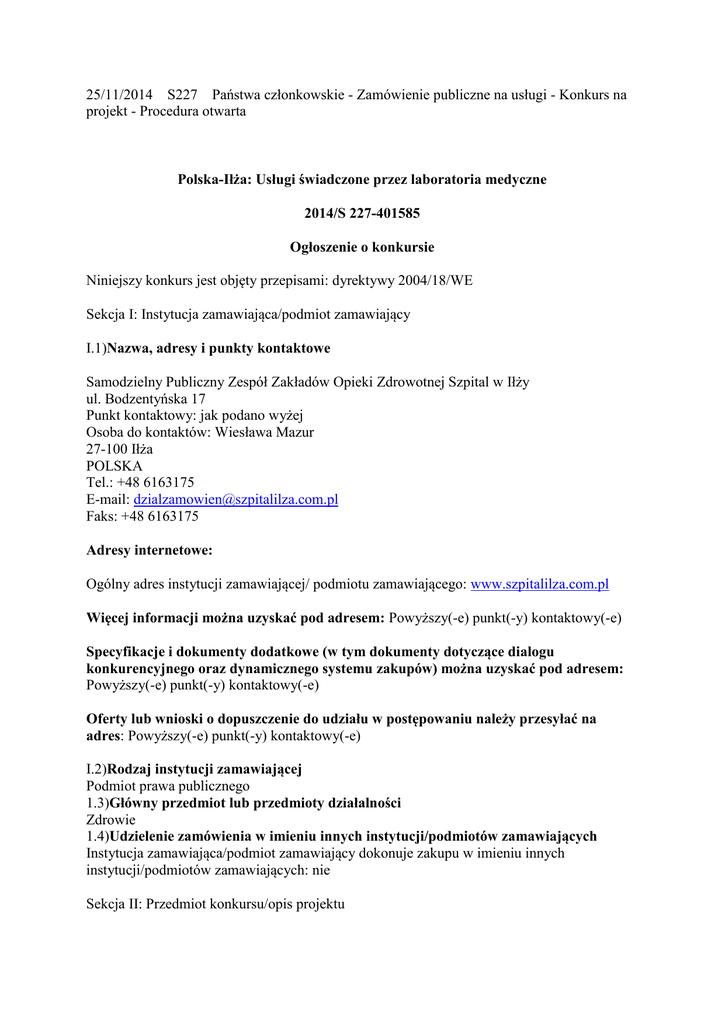 25/11/2014 S227 Państwa członkowskie - Zamówienie publiczne na usługi - Konkurs na projekt - Procedura otwarta Polska-Iłża: Usługi świadczone przez laboratoria medyczne 2014/S 227-401585 Ogłoszenie o konkursie Niniejszy konkurs jest objęty przepisami: dyrektywy 2004/18/WE Sekcja I: Instytucja zamawiająca/podmiot zamawiający I.1)Nazwa, adresy i punkty kontaktowe Samodzielny Publiczny Zespół Zakładów Opieki Zdrowotnej Szpital w Iłży ul. Bodzentyńska 17 Punkt kontaktowy: jak podano wyżej Osoba do kontaktów: Wiesława Mazur 27-100 Iłża POLSKA Tel.: +48 6163175 E-mail: [email protected] Faks: +48 6163175 Adresy internetowe: Ogólny adres instytucji zamawiającej/ podmiotu zamawiającego: www.szpitalilza.com.pl Więcej informacji można uzyskać pod adresem: Powyższy(-e) punkt(-y) kontaktowy(-e) Specyfikacje i dokumenty dodatkowe (w tym dokumenty dotyczące dialogu konkurencyjnego oraz dynamicznego systemu zakupów) można uzyskać pod adresem: Powyższy(-e) punkt(-y) kontaktowy(-e) Oferty lub wnioski o dopuszczenie do udziału w postępowaniu należy przesyłać na adres: Powyższy(-e) punkt(-y) kontaktowy(-e) I.2)Rodzaj instytucji zamawiającej Podmiot prawa publicznego 1.3)Główny przedmiot lub przedmioty działalności Zdrowie 1.4)Udzielenie zamówienia w imieniu innych instytucji/podmiotów zamawiających Instytucja zamawiająca/podmiot zamawiający dokonuje zakupu w imieniu innych instytucji/podmiotów zamawiających: nie Sekcja II: Przedmiot konkursu/opis projektu II.1)Opis II.1.1)Nazwa nadana konkursowi/ projektowi przez instytucję zamawiającą/ podmiot zamawiający: Świadczenie usług z zakresu diagnostyki laboratoryjnej i histopatologicznej oraz prowadzenie Banku Krwi na rzecz SP ZZOZ Szpital w Iłży. II.1.2)Krótki opis: Świadczenie usług z zakresu diagnostyki laboratoryjnej i histopatologicznej oraz prowadzenie Banku Krwi na rzecz Samodzielnego Publicznego Zespołu Zakładów Opieki Zdrowotnej Szpital w Iłży w zakresie: — diagnostyki laboratoryjnej: analitycznej, serologicznej, mikrobiologicznej i histopatologicznej, — prowadzenia Banku Krwi z oznaczaniem grupy krwi w układzie AB0 i czynnika Rh, wykonywaniem prób krzyżowych i wydawaniem krwi, i preparatów krwiopochodnych w postaci gotowej do przetaczania wraz z udostępnieniem Przyjmującemu Zamówienie pomieszczeń na podstawie umowy najmu i oddaniem w dzierżawę sprzętu laboratoryjnego i wyposażenia Pracowni Analitycznej Szpitala w Iłży na czas trwania umowy. II.1.3)Wspólny Słownik Zamówień (CPV) 85145000 Sekcja III: Informacje o charakterze prawnym, ekonomicznym, finansowym i technicznym III.1)Kryteria kwalifikacji uczestników: 1. Udzielający zamówienia wymaga od przyjmującego zamówienie przedstawienia w formie pisemnej koncepcji udzielania świadczeń stanowiących przedmiot konkursu, a w szczególności: a. opisu sposobu organizacji udzielania świadczeń z uwzględnieniem udziału podwykonawców, jeżeli Przyjmujący zamówienie zamierza wykonywać świadczenia zdrowotne przy udziale podwykonawców; b. wykazu osób udzielających określone świadczenia zdrowotne; c. wykazu sprzętu i aparatury oraz środków transportu i łączności, na którym będą udzielanie świadczenia w trakcie realizacji świadczenia zdrowotnego; d. zakresu udzielanych świadczeń zgodnie z przedmiotem zamówienia w podziale na poszczególne rodzaje oznaczeń wraz z terminami wykonania, liczbą ustaloną przez udzielającego zamówienia w szczegółowych warunkach konkursu ofert; e. wskazania metody realizacji badań laboratoryjnych; f. stosowania metod kontroli wewnętrznej i zewnętrznej, w tym postępowania z świadczeniem niezgodnym z wymaganiami badań/ lub wzorcowań. 2. Udzielający zamówienia wymaga od Przyjmującego zamówienie aby: a. udzielał zamawianych świadczeń na wysokim poziomie zgodnie z zasadami współczesnej wiedzy technicznej i analitycznej, normami umożliwiającymi akredytację i certyfikację, sztuką i etyką zawodu, obowiązującymi przepisami prawa oraz postanowieniami umowy, przy zachowaniu należytej staranności oraz nieprzerwanej pracy na rzecz udzielającego zamówienie; b. udzielał świadczeń na własnym sprzęcie, w powiązaniu z oddanym w dzierżawę przez Zamawiającego, zapewniającym ich wysoką jakość i posiadającym certyfikaty oraz atesty dopuszczenia do obrotu; c. materiały i odczynniki używane do wykonywania badań były dopuszczone do obrotu i spełniały wymagania określone w przepisach szczególnych; d. brał udział w okresowych wewnętrznych, ogólnopolskich i międzynarodowych kontrolach jakości świadczonych usług; e. świadczone usługi były wykonywane przez wykwalifikowane osoby zgodnie z obowiązującymi przepisami prawa; f. prowadził rejestr przyjmowanych materiałów według wymogów dla prowadzenia dokumentacji medycznej, który winien być udostępniany w systemie informatycznym Udzielającego zamówienie w wersji elektronicznej; g. wszelkie zastosowane oprogramowanie, aparatura, sprzęt, urządzenia itp. nie zakłócały pracy aparatury i sprzętu medycznego będącego na wyposażeniu Udzielającego zamówienia; h. Przyjmujący zamówienie realizował zadania „Banku Krwi” w zakresie oznaczania grupy krwi w układzie AB0 i czynnika Rh, przyjmowania, krzyżowania oraz wydawania krwi, osocza oraz innych preparatów krwiopochodnych w postaci gotowej do przetaczania dla pacjenta oraz przechowywania pojemników z pozostałością po przetoczeniu wraz z zestawami do przetaczania, zgodnie z obowiązującymi w tym zakresie przepisami; i. Przyjmujący zamówienie przystosował się do sposobu organizacji Szpitala; j. Przyjmujący zamówienie podczas realizacji usługi przestrzegał przepisów odnoszących się do danych osobowych zgodnie z obowiązującym w tym zakresie stanem prawnym; k. Przyjmujący Zamówienie przyjmował materiał diagnostyczny w Laboratorium zlokalizowanym na terenie Szpitala całodobowo, 7 dni w tygodniu; l