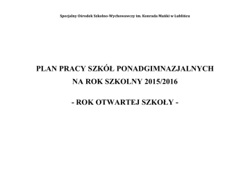 Specjalny Ośrodek Szkolno-Wychowawczy im. Konrada Mańki w Lublińcu PLAN PRACY SZKÓŁ PONADGIMNAZJALNYCH NA ROK SZKOLNY 2015/2016 - ROK OTWARTEJ SZKOŁY - W ramach Ośrodka w roku szkolnym 2015/2016 funkcjonują następujące szkoły ponadgimnazjalne: 1. Zasadnicza Szkoła Zawodowa Specjalna Nr 1 dla uczniów niesłyszących i słabosłyszących, upośledzonych umysłowo oraz ze sprzężeniami kształcąca w zawodach: – kucharz, – ogrodnik, – oraz innych, w oddziałach wielozawodowych; 2. Technikum Specjalne Nr 4 dla niesłyszących i słabosłyszących kształcące w zawodach: – technik informatyk, – technik żywienia i usług gastronomicznych; 3. Policealna Szkoła Zawodowa Specjalna dla niesłyszących i słabosłyszących kształcąca w zawodzie: – technik informatyk; 4. Szkoła Specjalna Przysposabiająca do Pracy dla uczniów upośledzonych umysłowo w stopniu umiarkowanym lub znacznym oraz z niepełnosprawnością sprzężoną. Podstawowe kierunki realizacji polityki oświatowej państwa w roku szkolnym 2015/2016: 1. Wzmocnienie bezpieczeństwa dzieci i młodzieży, ze szczególnym uwzględnieniem dzieci ze specjalnymi potrzebami edukacyjnymi w młodzieżowych ośrodkach wychowawczych, młodzieżowych ośrodkach socjoterapii, specjalnych ośrodkach szkolno-wychowawczych, specjalnych ośrodkach wychowawczych, ośrodkach rewalidacyjno-wychowawczych. 2. Podniesienie jakości kształcenia w szkołach ponadgimnazjalnych poprzez zaangażowanie przedstawicieli partnerów społecznych w dostosowywanie kształcenia zawodowego do potrzeb rynku pracy. 3. Rozwijanie kompetencji czytelniczych oraz upowszechnianie czytelnictwa wśród dzieci i młodzieży. 4. Edukacja matematyczna i przyrodnicza w kształceniu ogólnym. 2 ORGANIZACJA I ZARZĄDZANIE LP. ZADANIE SPOSÓB REALIZACJI TERMIN ODPOWIEDZIALNY 1 1. 2 Opracowanie tygodniowego rozkład zajęć edukacyjnych 3 Powołanie zespołu, sporządzenie rozkładu zajęć edukacyjnych 4 Sierpień 2015 r. 5 Wicedyrektor SOS-W E. Melnarowicz 2. Opracowanie Planu nadzoru pedagogicznego szkół ponadgimnazjalnych Sporządzenie Planu na rok szkolny 2015/2016 Wrzesień 2015 r. Wicedyrektor SOS-W 3. Opracowanie dyżurów nauczycielskich Powołanie zespołu, sporządzenie planu dyżurów nauczycielskich Wrzesień 2015 r. Wicedyrektor SOS-W L. Szaforz Z. Klepacz 4. Opracowanie planów wynikowych Sporządzenie planów wynikowych uwzględniających podstawę programową kształcenia ogólnego i kształcenia w zawodach Wrzesień 2015 r. Nauczyciele 5. Monitorowanie realizacji podstaw programowych Monitorowanie procesu wdrażania podstaw programowych kształcenia ogólnego i kształcenia w zawodach Rok szkolny Wicedyrektor SOS-W Nauczyciele 6. Opracowanie Indywidualnych Programów EdukacyjnoTerapeutycznych (IPET) Sporządzenie lub modyfikacja Indywidualnych Programów Edukacyjno-Terapeutycznych. Koordynowanie pracą zespołu Rok szkolny Wychowawcy klas 7. Realizacja dodatkowej godziny pracy nauczyciela Ustalenie dodatkowej godziny pracy nauczyciela z uwzględnieniem potrzeb edukacyjnych i zainteresowań uczniów I półrocze wrzesień 2015 r. II półrocze styczeń 2016 r. Wicedyrektor SOS-W Nauczyciele Monitorowanie realizacji dodatkowej godziny pracy nauczyciela Rok szkolny Wicedyrektor SOS-W 8. Aktualizacja statutów szkół ponadgimnazjalnych Uaktualnienie statutów szkół do obowiązującego stanu prawnego Rok szkolny Zespoły nauczycieli 9. Działalność psychologa szkolnego Realizacja zadań zgodnie z planem pracy Rok szkolny Anna Bogus 3 10. Działalność pedagoga szkolnego Realizacja zadań zgodnie z planem pracy Rok szkolny Czesława Przebieracz 11. Działalność zespołów przedmiotowych, kół zainteresowań oraz rady samorządu uczniowskiego Realizacja zadań zgodnie z planem pracy Rok szkolny Nauczyciele 12. Organizacja egzaminu zawodowego Zgodnie z obowiązującymi procedurami Wg harmonogramu CKE Kierownik kształcenia praktycznego 13. Organizacja egzaminu maturalnego Zgodnie z obowiązującymi procedurami Wg harmonogramu CKE Wicedyrektor SOS-W 14. Przeprowadzenie ewaluacji wewnętrznej - Wymaganie 4. Wychowankowie są aktywni Udział nauczycieli szkół w pracach Zespołu Ewaluacyjnego Ośrodka Rok szkolny Justyna Węgierek-Cholewa Krzysztof Suszka Czesława Przebieracz Grzegorz Opiełka 15. Udział nauczycieli w doskonaleniu zawodowym „Dopalacze i inne środki psychoaktywne – jak nie ulegać złudzeniom i reagować na czas” Rok szkolny Wicedyrektor SOS-W Lider WDN 16. Przeprowadzenie próby alarmu przeciwpożarowego Zgodnie z obowiązującymi procedurami Rok szkolny Wicedyrektor SOS-W 17. Organizacja wycieczek szkolnych Zgodnie z harmonogramem i regulaminem Rok szkolny Nauczyciele 4 KSZTAŁCENIE 1 1. 2 Organizacja procesu dydaktycznego 3 Realizacja obowiązkowych i dodatkowych zajęć edukacyjnych z uwzględnieniem zaleceń zawartych w orzeczeniach o potrzebie kształcenia specjalnego 4 Rok szkolny 5 Wicedyrektor SOS-W Nauczyciele Psycholog szkolny Pedagog szkolny Monitoring sprawdzania osiągnięć edukacyjnych uczniów ze szczególnym naciskiem na systematyczność oceniania bieżącego Rok szkolny Wicedyrektor SOS-W 2. Udział uczniów w konkursach szkolnych, powiatowych, wojewódzkich, regionalnych i ogólnopolskich Zachęcanie uczniów do udziału, przygotowywanie i udział uczniów w konkursach Rok szkolny Nauczyciele 3. Udział uczniów w zawodach sportowych szkolnych, powiatowych, wojewódzkich, regionalnych i ogólnopolskich Zachęcanie uczniów do udziału, przygotowywanie i udział uczniów w zawodach sportowych Rok szkolny Nauczyciele wychowania fizycznego 4. Podniesienie jakości kształcenia w szkołach ponadgimnazjalnych poprzez zaangażowanie przedstawicieli partnerów społecznych w dostosowywanie kształcenia zawodowego do potrzeb rynku pracy Współpraca z pracodawcami i Powiatową Radą Zatrudnienia Rok szkolny Kierownik kształcenia praktycznego nauczyciele zawodu 5. Rozwijanie kompetencji czytelniczyc