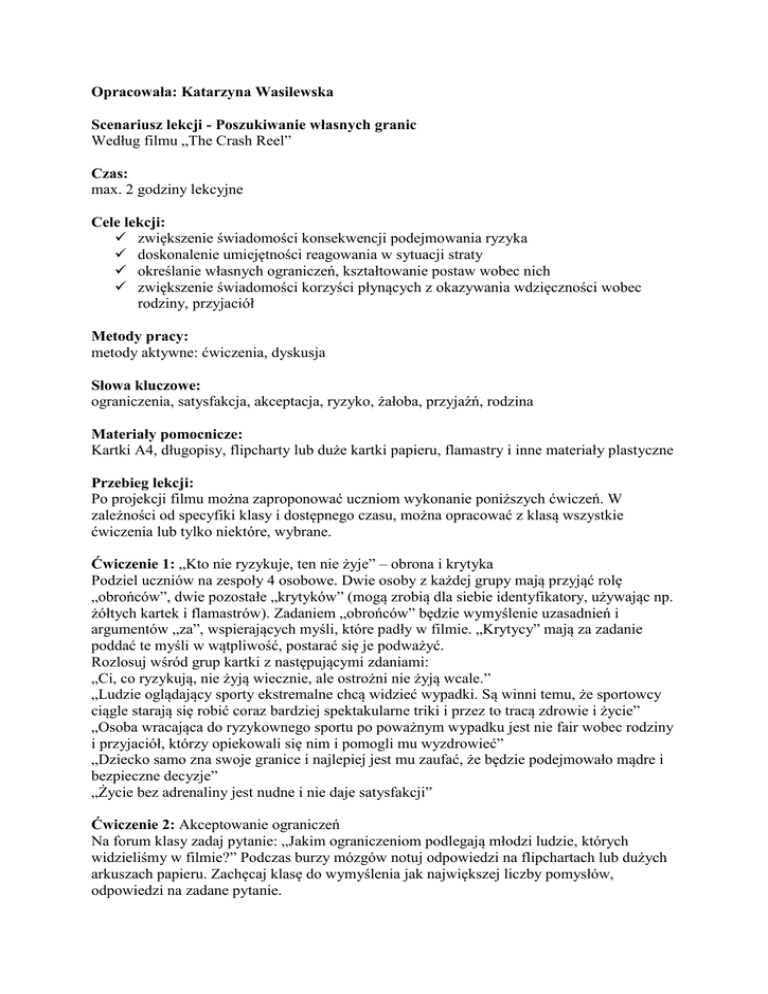 Opracowała: Katarzyna Wasilewska Scenariusz lekcji - Poszukiwanie własnych granic Według filmu „The Crash Reel” Czas: max. 2 godziny lekcyjne Cele lekcji: zwiększenie świadomości konsekwencji podejmowania ryzyka doskonalenie umiejętności reagowania w sytuacji straty określanie własnych ograniczeń, kształtowanie postaw wobec nich zwiększenie świadomości korzyści płynących z okazywania wdzięczności wobec rodziny, przyjaciół Metody pracy: metody aktywne: ćwiczenia, dyskusja Słowa kluczowe: ograniczenia, satysfakcja, akceptacja, ryzyko, żałoba, przyjaźń, rodzina Materiały pomocnicze: Kartki A4, długopisy, flipcharty lub duże kartki papieru, flamastry i inne materiały plastyczne Przebieg lekcji: Po projekcji filmu można zaproponować uczniom wykonanie poniższych ćwiczeń. W zależności od specyfiki klasy i dostępnego czasu, można opracować z klasą wszystkie ćwiczenia lub tylko niektóre, wybrane. Ćwiczenie 1: „Kto nie ryzykuje, ten nie żyje” – obrona i krytyka Podziel uczniów na zespoły 4 osobowe. Dwie osoby z każdej grupy mają przyjąć rolę „obrońców”, dwie pozostałe „krytyków” (mogą zrobią dla siebie identyfikatory, używając np. żółtych kartek i flamastrów). Zadaniem „obrońców” będzie wymyślenie uzasadnień i argumentów „za”, wspierających myśli, które padły w filmie. „Krytycy” mają za zadanie poddać te myśli w wątpliwość, postarać się je podważyć. Rozlosuj wśród grup kartki z następującymi zdaniami: „Ci, co ryzykują, nie żyją wiecznie, ale ostrożni nie żyją wcale.” „Ludzie oglądający sporty ekstremalne chcą widzieć wypadki. Są winni temu, że sportowcy ciągle starają się robić coraz bardziej spektakularne triki i przez to tracą zdrowie i życie” „Osoba wracająca do ryzykownego sportu po poważnym wypadku jest nie fair wobec rodziny i przyjaciół, którzy opiekowali się nim i pomogli mu wyzdrowieć” „Dziecko samo zna swoje granice i najlepiej jest mu zaufać, że będzie podejmowało mądre i bezpieczne decyzje” „Życie bez adrenaliny jest nudne i nie daje satysfakcji” Ćwiczenie 2: Akceptowanie ograniczeń Na forum klasy zadaj pytanie: „Jakim ograniczeniom podlegają młodzi ludzie, których widzieliśmy w filmie?” Podczas burzy mózgów notuj odpowiedzi na flipchartach lub dużych arkuszach papieru. Zachęcaj klasę do wymyślenia jak największej liczby pomysłów, odpowiedzi na zadane pytanie. Podsumuj burzę mózgów – omów jej wyniki. Poproś uczniów, aby zaznaczyli na flipchartach, które z odpowiedzi (które ograniczenia) wydają im się osobiście najbardziej ważne, odnoszące się też do nich samych. Każdy uczeń ma podejść i zaznaczyć dwa ważne według niego ograniczenia (zaznaczanie odbywa się przez postawienie wyraźnej kropki przy danym punkcie). W ten sposób wybierz, które ograniczenia wydają się ważne dla uczniów z klasy. Następnie podziel klasę na zespoły kilkuosobowe. Każdy zespół ma za zadanie wybrać z listy jedno z ograniczeń i opracować je, przygotowując i notując odpowiedzi na następujące pytania: - Jak można zmienić to ograniczenie, polepszyć sytuację? - Czy można to ograniczenie zaakceptować, pogodzić się z nim? Co może w tym pomóc? Po zakończeniu pracy przez uczniów poproś, aby każda grupa przedstawiła swoje przemyślenia. Moderuj dyskusję i zadaj dodatkowe pytanie: Czy można zacząć postrzegać własne ograniczenia jako atuty? Końcowa teza do dyskusji: „Osoby po wypadkach mówią nieraz, że krytyczne wydarzenie pomogło im dostrzec własną unikalną perspektywę, odnaleźć sens w życiu i podjąć ważne działania z innymi i dla innych.” Ćwiczenie 3: Praca plastyczna „Co sprawia, że czuję, że żyję?” Podziel uczniów na zespoły trzyosobowe. Rozdaj arkusze papieru i materiały plastyczne. Poproś, aby każdy zespół stworzył obraz, którego tytuł brzmi: „Co sprawia, że czuję, że żyję?” Określ czas wykonywania pracy. Po zakończeniu poproś, aby każdy zespół przedstawił swoją pracę i omówił ją. Ćwiczenie to można wykonać również indywidualnie – tak, aby każdy uczeń stworzył własną pracę, z których może zostać stworzona wystawa w klasie. Ćwiczenie 4: Dyskusja – jak akceptować zmiany? Przypomnij uczniom zdanie, które pada z ust głównego bohatera pod koniec filmu: „Trzeba umieć zaakceptować zmianę. Życie po wypadku jest inne i nigdy nie będzie tak, jak było. Ale to, jak jest teraz, jest również w porządku.” Omów krótko sytuację Kevina – przeżył stratę i odbył długą drogę, by pogodzić się z tym, że nie wróci do sportu wyczynowego. Poproś uczniów, aby zastanowili się: jak zazwyczaj reagujemy, gdy coś tracimy? Jakie mogą przywołać sytuacje z życia, gdy ktoś coś stracił? Moderuj dyskusję, zadając pytania: Jak Kevin Pearce reagował za to, co go spotkało? Jak zmieniał się jego stosunek do poniesionej straty? Czy my też w taki sposób reagujemy na stratę? Na jaką pomoc mógł liczyć Kevin – co pomogło mu poradzić sobie z utratą zdrowia i sprawności? Co pomaga ludziom radzić sobie, gdy coś tracą? – co obserwujemy wokół siebie? W trakcie omówienia i podsumowania dyskusji możesz przeprowadzić mini-wykład. Przedstaw typowe reakcje na stratę wg. Elizabeth Kubler-Ross. Są to: - Zaprzeczanie („To nieprawda.”) - Złość („Dlaczego to spotyka mnie?”) - Targowanie się („Co mogę zrobić, żeby było lepiej?”) - Depresja („Nie ma dla mnie nadziei…”) - Akceptacja („Mogę pogodzić się z tą zmianą – życie jest inne, ale też dobre”) Opowiedz o tym, że ludzie często doświadczają takiej sekwencji reakcji, kiedy tracą coś nieodwołalnie, gdy zmienia się niespodziewanie ich sytuacja życiowa, albo np. w wyniku wypadku albo gdy ktoś bliski poważnie choruje lub umiera. Takie emocje i zachowania są w porządku – to normaln