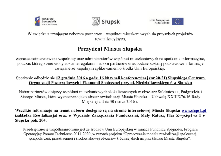 W związku z trwającym naborem partnerów – wspólnot mieszkaniowych do przyszłych projektów rewitalizacyjnych, Prezydent Miasta Słupska zaprasza zainteresowane wspólnoty oraz administratorów wspólnot mieszkaniowych na spotkanie informacyjne, podczas którego omówiony zostanie regulamin naboru partnerów oraz podane zostaną podstawowe informacje związane ze wspólnym aplikowaniem o środki Unii Europejskiej. Spotkanie odbędzie się 12 grudnia 2016 o godz. 16.00 w sali konferencyjnej (nr 20-21) Słupskiego Centrum Organizacji Pozarządowych i Ekonomii Społecznej przy ul. Niedziałkowskiego 6 w Słupsku Nabór partnerów dotyczy wspólnot mieszkaniowych zlokalizowanych w obszarze Śródmieścia, Podgrodzia i Starego Miasta, które wyznaczono jako obszar rewitalizacji Miasta Słupska – Uchwałą XXIII/276/16 Rady Miejskiej z dnia 30 marca 2016 r. Wszelkie informacje na temat naboru dostępne są na stronie internetowej Miasta Słupska www.slupsk.pl (zakładka Rewitalizacja) oraz w Wydziale Zarządzania Funduszami, Mały Ratusz, Plac Zwycięstwa 1 w Słupsku pok. 204. Przedsięwzięcie współfinansowane jest ze środków Unii Europejskiej w ramach Funduszu Spójności, Program Operacyjny Pomoc Techniczna 2014-2020, w ramach projektu “Opracowanie modelu rewitalizacji społecznej, gospodarczej, przestrzennej i środowiskowej obszarów śródmiejskich na przykładzie Miasta Słupska”.