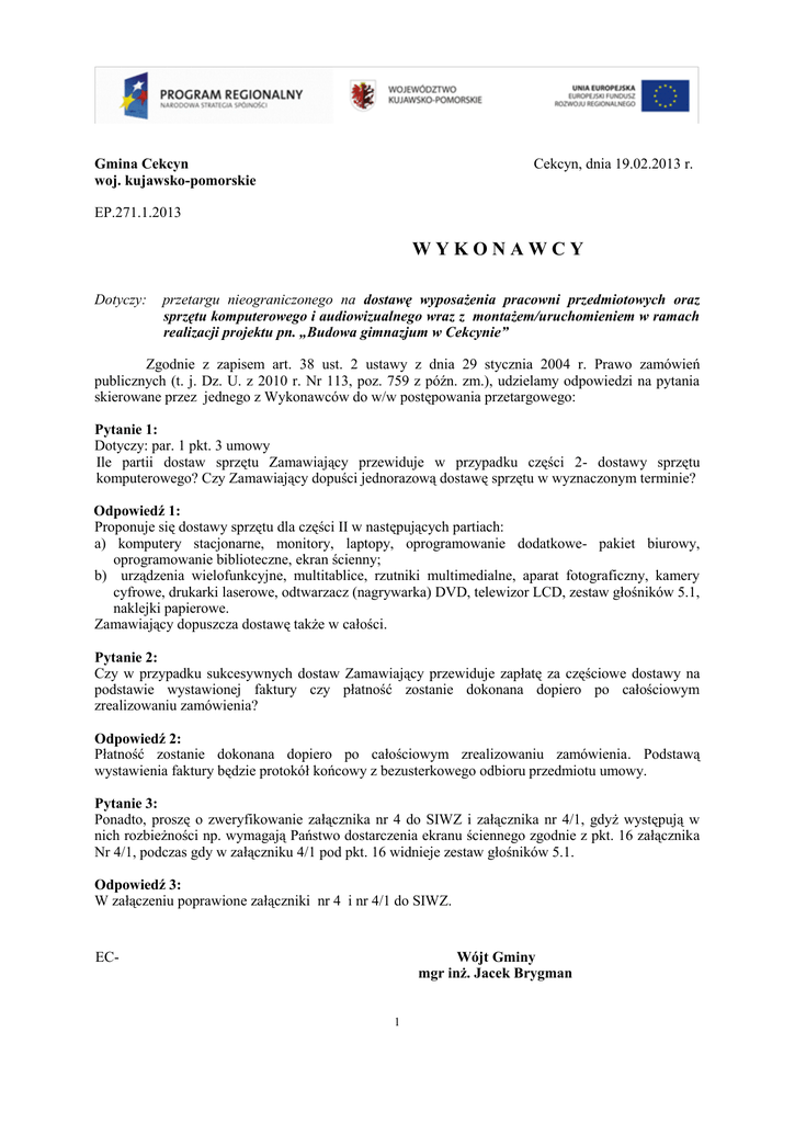 Gmina Cekcyn woj. kujawsko-pomorskie Cekcyn, dnia 19.02.2013 r. EP.271.1.2013 WYKONAWCY Dotyczy: przetargu nieograniczonego na dostawę wyposażenia pracowni przedmiotowych oraz sprzętu komputerowego i audiowizualnego wraz z montażem/uruchomieniem w ramach realizacji projektu pn. „Budowa gimnazjum w Cekcynie” Zgodnie z zapisem art. 38 ust. 2 ustawy z dnia 29 stycznia 2004 r. Prawo zamówień publicznych (t. j. Dz. U. z 2010 r. Nr 113, poz. 759 z późn. zm.), udzielamy odpowiedzi na pytania skierowane przez jednego z Wykonawców do w/w postępowania przetargowego: Pytanie 1: Dotyczy: par. 1 pkt. 3 umowy Ile partii dostaw sprzętu Zamawiający przewiduje w przypadku części 2- dostawy sprzętu komputerowego? Czy Zamawiający dopuści jednorazową dostawę sprzętu w wyznaczonym terminie? Odpowiedź 1: Proponuje się dostawy sprzętu dla części II w następujących partiach: a) komputery stacjonarne, monitory, laptopy, oprogramowanie dodatkowe- pakiet biurowy, oprogramowanie biblioteczne, ekran ścienny; b) urządzenia wielofunkcyjne, multitablice, rzutniki multimedialne, aparat fotograficzny, kamery cyfrowe, drukarki laserowe, odtwarzacz (nagrywarka) DVD, telewizor LCD, zestaw głośników 5.1, naklejki papierowe. Zamawiający dopuszcza dostawę także w całości. Pytanie 2: Czy w przypadku sukcesywnych dostaw Zamawiający przewiduje zapłatę za częściowe dostawy na podstawie wystawionej faktury czy płatność zostanie dokonana dopiero po całościowym zrealizowaniu zamówienia? Odpowiedź 2: Płatność zostanie dokonana dopiero po całościowym zrealizowaniu zamówienia. Podstawą wystawienia faktury będzie protokół końcowy z bezusterkowego odbioru przedmiotu umowy. Pytanie 3: Ponadto, proszę o zweryfikowanie załącznika nr 4 do SIWZ i załącznika nr 4/1, gdyż występują w nich rozbieżności np. wymagają Państwo dostarczenia ekranu ściennego zgodnie z pkt. 16 załącznika Nr 4/1, podczas gdy w załączniku 4/1 pod pkt. 16 widnieje zestaw głośników 5.1. Odpowiedź 3: W załączeniu poprawione załączniki nr 4 i nr 4/1 do SIWZ. Wójt Gminy mgr inż. Jacek Brygman EC- 1