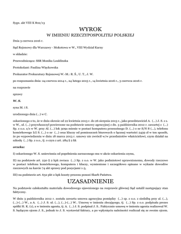 Sygn. akt VIII K 802/13 WYROK W IMIENIU RZECZYPOSPOLITEJ POLSKIEJ Dnia 3 czerwca 2016 r. Sąd Rejonowy dla Warszawy - Mokotowa w W., VIII Wydział Karny w składzie: Przewodnicząca: SSR Monika Louklinska Protokolant: Paulina Więckowska Prokurator Prokuratury Rejonowej W.-M.: R. Ś., U. T., J. W. po rozpoznaniu dnia: 24 czerwca 2014 r., 24 lutego 2015 r., 14 kwietnia 2016 r., 3 czerwca 2016 r. na rozprawie sprawy W. S. syna M. i S. urodzonego dnia (...) w C. oskarżonego o to, że w dniu okresie od 22 kwietnia 2013 r. do 26 sierpnia 2013 r., jako przedstawiciel A. (...) J. S. z s. w W., ul. (...) przywłaszczył powierzone na podstawie umowy agencyjnej z dn. 3 października 2012 r. zawartej z (...) Sp. z o.o. z/s w W. przy Al. (...) lok 309a mienie w postaci komputera przenośnego D. (...) o nr S/N 8 (...), telefonu komórkowego LG S. (...) o nr (...) oraz kluczy od pomieszczeń biurowych o łącznej wartości 2439 zł w ten sposób, że po wypowiedzeniu w dniu 18 marca 2013 r. umowy nie zwrócił w/w przedmiotów właścicielowi, czym działał na szkodę (...) Sp. z o.o., tj. o czyn z art. 284 § 2 kk orzeka: I) oskarżonego W. S. uniewinnia od popełnienia zarzuconego mu w akcie oskarżenia czynu, II) na podstawie art. 230 § 2 kpk zwraca (...) Sp. z o.o. w W. jako podmiotowi uprawnionemu, dowody rzeczowe w postaci telefonu komórkowego, komputera i kluczy, wymienione i szczegółowo opisane w wykazie dowodów rzeczowych na karcie 74 akt sprawy pod pozycjami 1-3, III) na podstawie art. 632 pkt 2 kpk koszty procesu ponosi Skarb Państwa. UZASADNIENIE Na podstawie całokształtu materiału dowodowego ujawnionego na rozprawie głównej Sąd ustalił następujący stan faktyczny. W dniu 3 października 2012 r. została zawarta umowa agencyjna pomiędzy (...) sp. z o.o. z siedzibą przy al. (...), (...)-(...) W., a A. (...) J. S. ul. (...), (...)-(...) W.. Umowę w imieniu zlecającego, tj. (...) Sp. z o.o. podpisała prezes spółki H. K. (1), a w imieniu agenta, tj. A. (...) J. S. podpisał J. S.. Faktycznie umowę w imieniu agenta realizował W. S. będącym ojcem J. S., jednak to J. S. wystawiał faktury, a po wpłynięciu należności rozliczał się ze swoim ojcem. Zlecający wydał W. S. do dyspozycji komputer przenośny D. (...) o nr S/N 8 (...), telefon komórkowy LG S. (...) o nr (...) oraz klucz od pomieszczeń biurowych, tj. przedmioty o łącznej wartości 2439 zł. Z czynności tej nie został spisany żaden protokół zdawczo-odbiorczy. W. S. miał swobodę w wyborze miejsca realizacji swoich obowiązków zawodowych. Początkowo przychodził do biura Spółki (...) w W., ale z czasem swoje obowiązki realizował w miejscu zamieszkania, tj. pod adresem (...) gmina G.. Wykonując swoje obowiązki zawodowe pod tym adresem W. S. korzystał z otrzymanego do pracy sprzętu elektronicznego, który wraz z otrzymanym kluczem również tam przechowywał. Z początkiem 2012 r. współpraca pomiędzy stronami zaczęła się psuć. Prezes (...) sp. z o.o. w W. H. K. (1) nie była zadowolona z efektów pracy W. S. i w dniu 4 lutego 2013 r. za pośrednictwem e-maila zaproponowała mu zmianę w zakresie dalszej współpracy poprzez zmianę sposobu wynagradzania, tj. przejście wyłącznie na system prowizyjny. W. S. nie odrzucił tej propozycji i strony rozpoczęły za pośrednictwem maila negocjacje co do wysokości prowizji. Negocjacje nie doprowadziły do ostatecznych ustaleń. W drugiej połowie lutego 2013 r. pojawiły się problemy z płatnością faktury za świadczone przez W. S. usługi. W rozmowie telefonicznej z W. S. H. K. (1) odmówiła zapłaty i wypowiedziała umowę. W związku z tym w dniu 19 lutego 2013 r. w mailu do H. K. zaproponował on, że odkupi przekazany mu w ramach umowy komputer przenośny i telefon komórkowy. Wówczas tą samą drogą komunikacji w dniu 20 lutego 2013 r. H. K. (1) poinformowała W. S., że komputer jest w cenie 1600 zł, a telefon 890 zł. W dniu 21 lutego 2013 r. W. S. wysłał do H. K. maila, w którym zaproponował 1000 zł za komputer i 300 zł za telefon. Powyższe negocjacje utknęły w martwym punkcie nie kończąc się definitywnymi ustaleniami bądź definitywnym stanowiskiem którejś ze stron. W dniu 14 marca 2013 r. J. S. udzielił pełnomocnictwa radcy prawnemu K. B.. W dalszej części wszelkie kontakty z pełnomocnikiem utrzymywał jednak nie J. S., ale W. S.. W dniu 18 marca 2013 r. r.pr. K. B. sporządził pismo zatytułowane „ostateczne wezwanie do zapłaty”, w którym wypowiedział umowę agencyjną z dnia 3 października 2012 r. W piśmie tym zażądał w imieniu swojego mocodawcy płatności wynagrodzenia za luty i marzec 2013 r. powołując się na zawartą umowę agencyjną oraz wystawione faktury. Jednocześnie wskazał, że istnieje możliwość ugodowego rozstrzygnięcia sporu. W odpowiedzi, pismem z dnia 29 marca 2013 r. pełnomocnik (...) Sp. z o.o. w W. uznał wypowiedzenie umowy agencyjnej za skuteczne, ponadto wezwał do zwrotu przekazanego W. S. sprzętu elektronicznego, a nadto wezwał J. S. do zwrotu nienależnie pobranego wynagrodzenia również nie wykluczając ugodowego rozstrzygnięcia sporu. W odpowiedzi r. pr. K. B. w piśmie z dnia 12 kwietnia 2013 r. zatytułowanym „ostateczne przedsądowe wezwanie do zapłaty” nie uznał argumentacji prawnej w zakresie naliczania wynagrodzenia na podstawie umowy agencyjnej z dnia 3 października 2012 r. przyjętej przez (...) Sp. z o.o. w W. w piśmie i szczegółowo przedstawił swoje stanowisko, nadal wskazując na możliwość ugodowego rozstrzygnięcia sporu. (...) Sp. z o.o. w W. pismem z dnia 10 kwietnia 2003 r. zatytułowanym „wezwanie do zwrotu powierzonego mienia” i skierowanym bezpośrednio do J. S. wezwał go do natychmiastowego zwrotu przekazanego sprzętu w postaci komputera przenośnego D. (...), telefonu komórkowego oraz klucza do biura służbowego. To pismo nie dotarło nigdy do W. S.. W. S. przez cały czas trwania negocjacji czy to bezp