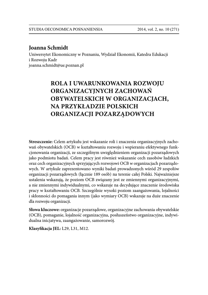STUDIA OECONOMICA POSNANIENSIA 2014, vol. 2, no. 10 (271) Joanna Schmidt Uniwersytet Ekonomiczny w Poznaniu, Wydział Ekonomii, Katedra Edukacji i Rozwoju Kadr [email protected] ROLA I UWARUNKOWANIA ROZWOJU ORGANIZACYJNYCH ZACHOWAŃ OBYWATELSKICH W ORGANIZACJACH, NA PRZYKŁADZIE POLSKICH ORGANIZACJI POZARZĄDOWYCH Streszczenie: Celem artykułu jest wskazanie roli i znaczenia organizacyjnych zachowań obywatelskich (OCB) w kształtowaniu rozwoju i wspieraniu efektywnego funkcjonowania organizacji, ze szczególnym uwzględnieniem organizacji pozarządowych jako podmiotu badań. Celem pracy jest również wskazanie cech zasobów ludzkich oraz cech organizacyjnych sprzyjających rozwojowi OCB w organizacjach pozarządowych. W artykule zaprezentowano wyniki badań prowadzonych wśród 29 zespołów organizacji pozarządowych (łącznie 189 osób) na terenie całej Polski. Najważniejsze ustalenia wskazują, że poziom OCB związany jest ze zmiennymi organizacyjnymi, a nie zmiennymi indywidualnymi, co wskazuje na decydujące znaczenie środowiska pracy w kształtowaniu OCB. Szczególnie wysoki poziom zaangażowania, lojalności i skłonności do pomagania innym (jako wymiary OCB) wskazuje na duże znaczenie dla rozwoju organizacji. Słowa kluczowe: organizacje pozarządowe, organizacyjne zachowania obywatelskie (OCB), pomaganie, lojalność organizacyjna, posłuszeństwo organizacyjne, indywidualna inicjatywa, zaangażowanie, samorozwój. Klasyfikacja JEL: L29, L31, M12. 28 Joanna Schmidt THE ROLE AND DETERMINANTS FOR DEVELOPING ORGANIZATIONAL CITIZENSHIP BEHAVIOUR IN ORGANIZATIONS BASED ON THE EXAMPLE OF POLISH NON-GOVERNMENTAL ORGANISATIONS Abstract: The aim of this article is to identify the role and significance of Organizational Citizenship Behaviour (OCB) in promoting the development and supporting the effectiveness of an organization, with particular emphasis on non-governmental organizations as the subject of the research. The paper also aims to indicate the human-resource and organizational features which are conducive to the development of OCB in NGOs. The article presents the findings of research conducted among NGO teams throughout Poland (189 people in 29 organizations). The key findings indicate that the level of OCB is related to organizational rather than individual variables, which indicates the critical importance of the work environment in the development of OCB. Such elements as a high level of involvement, loyalty and a willingness to help others (as dimensions of OCB) seem to have a particular importance for the development of an organization. Keywords: non-governmental organizations, Organizational Citizenship Behaviour (OCB), helping behaviours, organizational loyalty, organizational compliance, individual initiative, civic virtue, self-development. Wstęp Współczesne organizacje stają przed wieloma nowymi wyzwaniami, jakie przynoszą im nieustanne zmiany w świecie i ich najbliższym otoczeniu. Przemiany te wywierają znaczący wpływ na funkcjonowanie organizacji nie tylko w odniesieniu do zjawisk zewnętrznych, ale również relacji i zachowań wewnątrz organizacji. Złożonym przeobrażeniom podlega m.in. przestrzeń relacji między organizacją a pracownikiem. Jest ona wynikiem wielu powiązanych ze sobą procesów m.in. zmniejszeniem trwałości zatrudnienia (zarówno jeśli chodzi o długość, jak i formę zatrudnienia) i stałości zawodu, zmianą roli pracownika, jego nastawienia do pracy, postawy, oczekiwań wobec niej. Przekształceniom ulegają również standardy zachowań w organizacjach, kultura organizacyjna, relacje między pracownikami. Rezultatem tychże przemian są nowe, interesujące sposoby definiowania relacji między organizacją a pracownikami, które obrazują odmienne podejście do tego zagadnienia. Jedną z metafor wskazującą na charakter wspomnianych relacji jest obywatelstwo. Zagadnienie to związane jest z analizą zachowania pracowników Rola i uwarunkowania rozwoju organizacyjnych zachowań obywatelskich 29 i oceny tego, na ile jest ono obywatelskie – czyli takie, które służy budowaniu wspólnego dobra, społeczności. Obywatelskość jest więc tu rozumiana jako np. aktywność, zdolność do samoorganizacji, niezależność, samodzielność, świadomość pracowników potrzeb zespołów nieformalnych i jako organizacji oraz dążenie do ich zaspokajania, czyli zaangażowanie oraz poczucie odpowiedzialności. Obecnie terminem i znaczeniem obywatelskości pracowników, które zostało zdefiniowane i opisane w naukach ekonomicznych i naukach o organizacji pod pojęciem organizacyjnych zachowań obywatelskich (organizational citizenship behavior – OCB1), zajmuje się wielu badaczy. Szczególne zainteresowanie budzi ono także ze względu na swoje znaczenie dla efektywności i rozwoju organizacji. W obliczu wspomnianych zmian dotyczących relacji między organizacją a pracownikiem OCB zwracają uwagę na konieczność przedefiniowania ról pracowników w organizacji. Role te stają się w większej mierze partnerskie, oparte na zaangażowaniu i zaufaniu, co w obecnych warunkach jest czynnikiem zwiększającym szanse na odniesienie sukcesu przez organizację. Niniejszy artykuł porusza kwestię występowania OCB w organizacjach pozarządowych (NGOs), jako typ organizacji, który z założenia powinien spełniać wiele postulatów obywatelskości. Jedną z podstawowych funkcji, jakie sektor pozarządowy pełni w ramach gospodarki społecznej, jest funkcja demokratycznego (partycypacyjnego) zarządzania [Nałęcz, 2009, s. 14]. Ten styl zarządzania często jest powodem, dla którego organizacje trzeciego sektora nazywane są społecznymi lub obywatelskimi. Ten sposób zarządzania i charakter budowanych relacji z interesariuszami wynika z koncepcji postrzegania organizacji jako pewnej społeczności. Równocześnie dotychczasowe badania dotyczące tego zagadnienia w NGOs są niejednoznaczne. Z jednej strony, np. badania irland