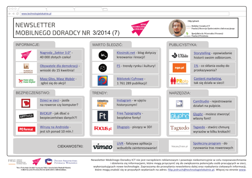 www.technologielokalnie.pl 3/2014 (7) INFORMACJE: WARTO ŒLEDZIÆ: PUBLICYSTYKA: Nagroda „Sektor 3.0" 40 000 z³otych czeka! Klosinski.net - blog dotyczy kreowania i kreacji! Storytelling - opowiadanie historii swoim odbiorcom. Obywatele dla demokracji wnioski do 15 kweitnia! F5 - trendy rynku i kultury! 1% - co sk³ania osoby do przekazywania? Masz G³os, Masz Wybór zg³oœ siê do akcji! Biblioteki Cyfrowe 1 761 289 publikacji! Content marketing, tak siê dzia³a w sieci! BEZPIECZEÑSTWO: TRENDY: NARZÊDZIA: Dzieci w sieci - jazda na rowerze czy komputer? Instagram - w ujêciu historycznym! CamStudio - rejestrowanie dzia³añ na pulpicie. BVCKUP - jak dbaæ o bezpieczeñstwo danych?! Free Typography bezp³atne fonty! Glyphr - mo¿esz stworzyæ w³asny font! Wirusy na Androida jest ich ponad 10 mln.! D³ugopis - pisz¹cy w 3D! Tagxedo - stwórz chmurê wyrazów w kilku krokach! LIVR - fa³szywa aplikacja wzbudzi³a zainteresowanie! Spo³eczny program - do rysowania tras rowerowych CIEKAWOSTKI: Newsletter Mobilnego Doradcy ICT nie jest narzêdziem reklamowym i powstaje niekomercyjnie w celu rozpowszechniania i dzielenia siê informacjami, które mog¹ przyczyniæ siê do zwiêkszenia potencja³u osób pracuj¹cych w sieci, wykorzystuj¹cych nowe technologie. Zapraszamy do przesy³ania newslettera dalej oraz nadsy³ania ciekawych informacji, które mog¹ znaleŸæ siê w przysz³ych wydaniach na adres: [email protected]. Wiêcej na stronie www.