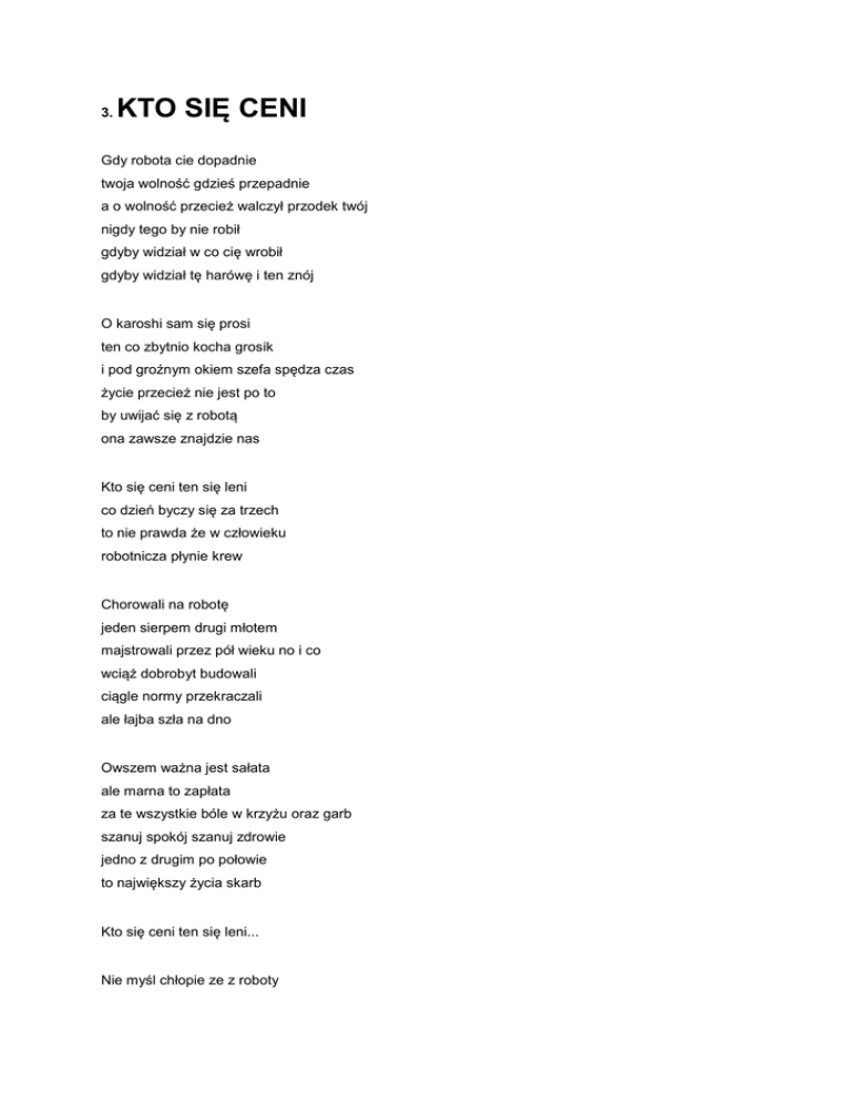 3. KTO SIĘ CENI Gdy robota cie dopadnie twoja wolność gdzieś przepadnie a o wolność przecież walczył przodek twój nigdy tego by nie robił gdyby widział w co cię wrobił gdyby widział tę harówę i ten znój O karoshi sam się prosi ten co zbytnio kocha grosik i pod groźnym okiem szefa spędza czas życie przecież nie jest po to by uwijać się z robotą ona zawsze znajdzie nas Kto się ceni ten się leni co dzień byczy się za trzech to nie prawda że w człowieku robotnicza płynie krew Chorowali na robotę jeden sierpem drugi młotem majstrowali przez pół wieku no i co wciąż dobrobyt budowali ciągle normy przekraczali ale łajba szła na dno Owszem ważna jest sałata ale marna to zapłata za te wszystkie bóle w krzyżu oraz garb szanuj spokój szanuj zdrowie jedno z drugim po połowie to największy życia skarb Kto się ceni ten się leni... Nie myśl chłopie ze z roboty w banku biorą się banknoty bo niedługo zamiast forsy ujrzysz piach dziś robota nie jest w cenie dzisiaj liczy się myślenie to najlepszy w życiu fach Odkryj w sobie nową cnotę uczulenie na robotę bo niedobrze gdy nad grzbietem wisi bat życie to nie wściekła polka ani młócka ani orka słuchaj pilnie dobrych rad Kto się ceni ten się leni w słońcu praży się jak lew to nie prawda że w człowieku robotnicza płynie krew Muzyka: Rafał Golec / Łukasz Golec / Paweł Golec Słowa: Olga Golec / Rafał Golec